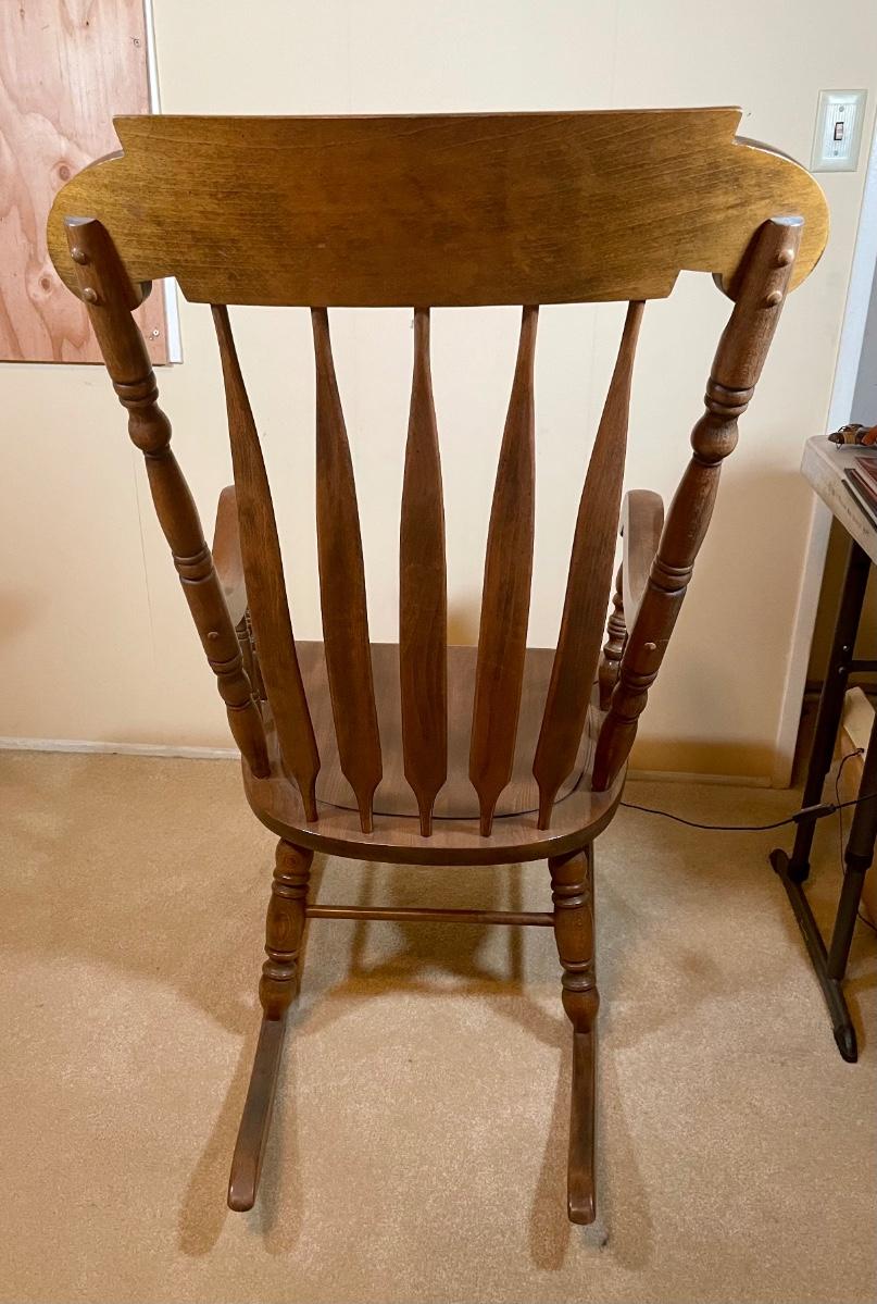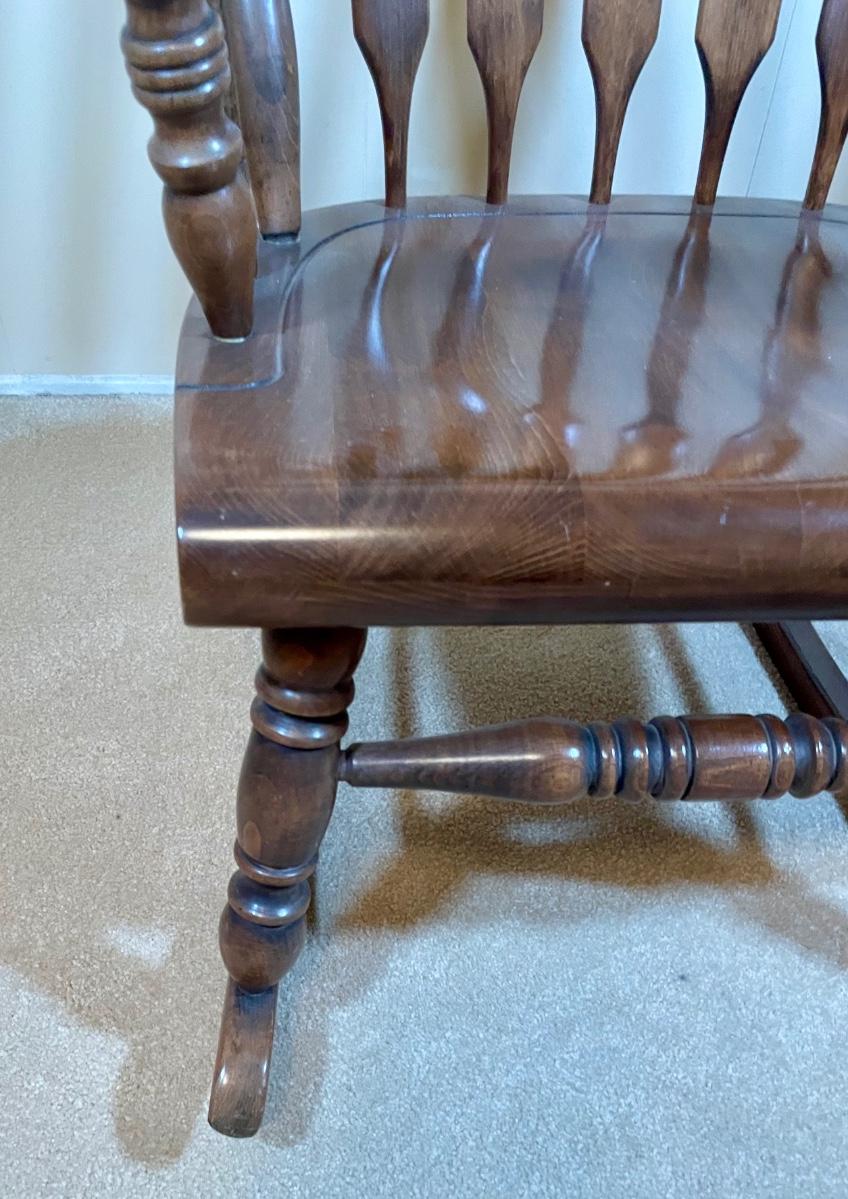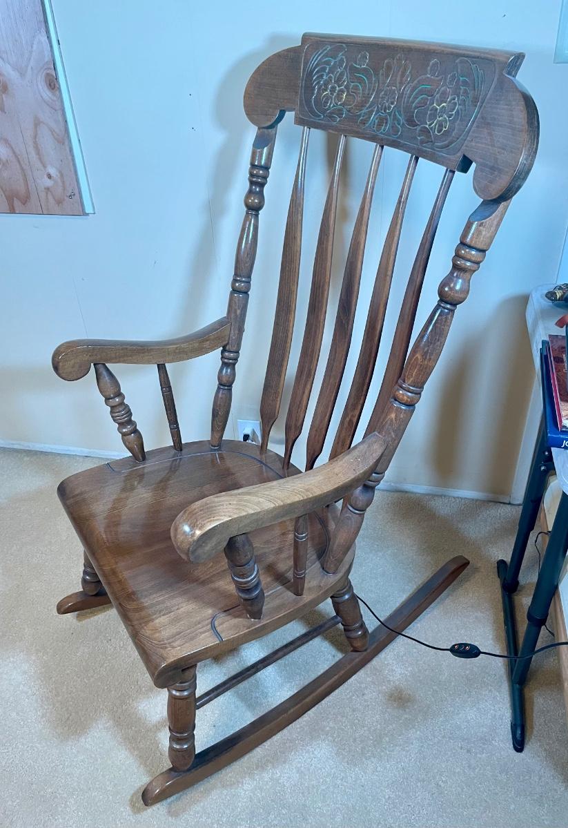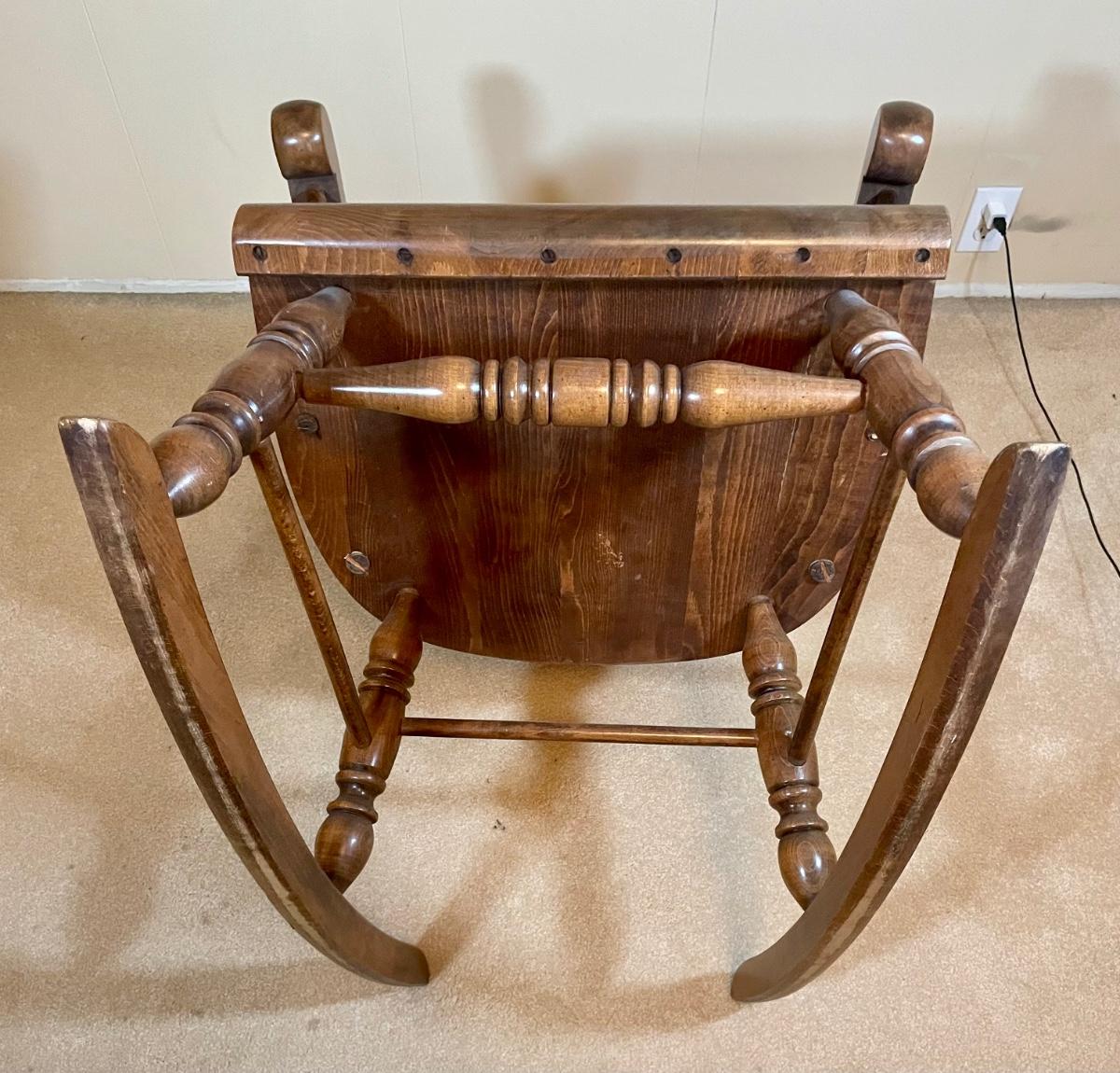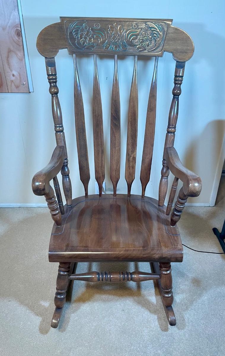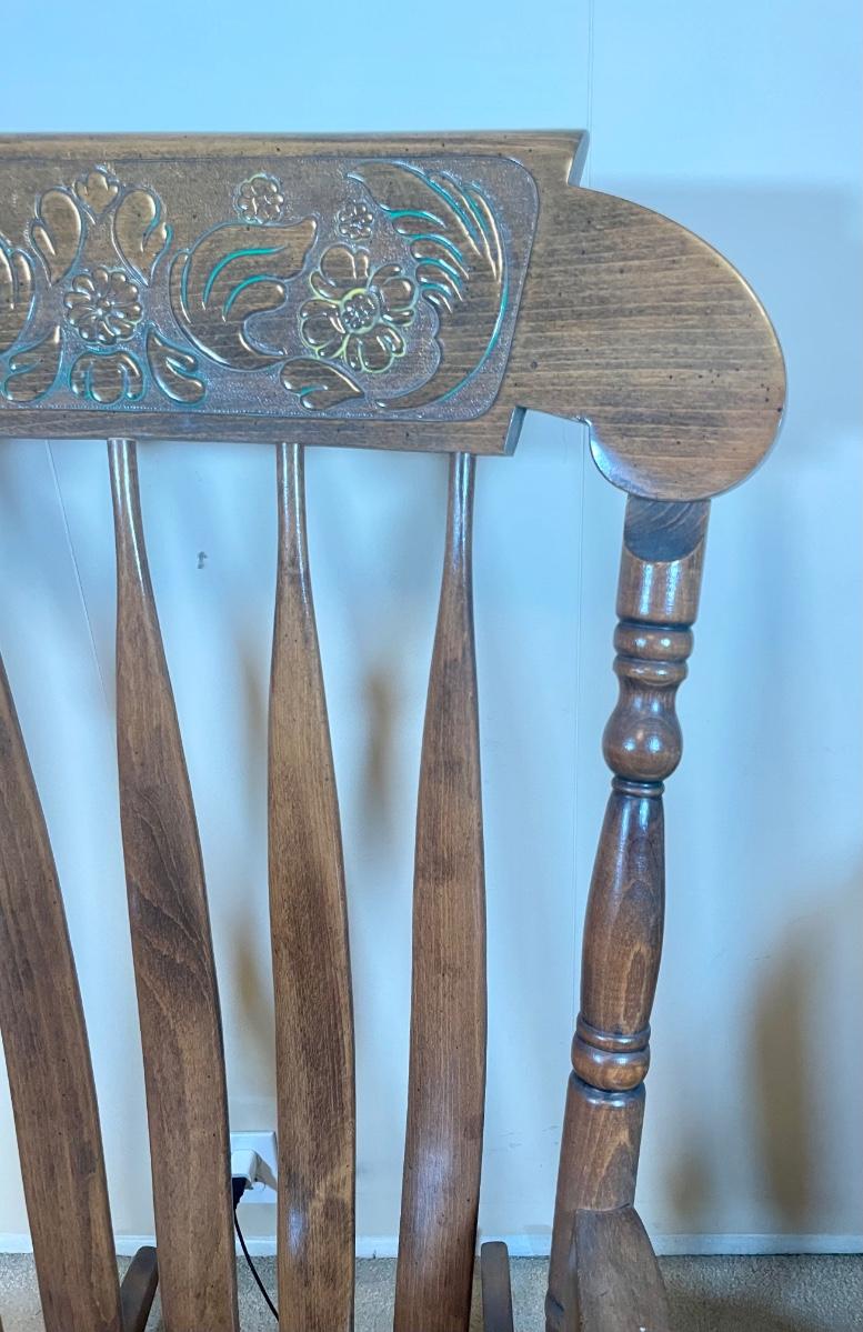 Hand-carved details in the head board, in good condition. Approx. 47" tall, 24" wide and seat depth is 17.5".