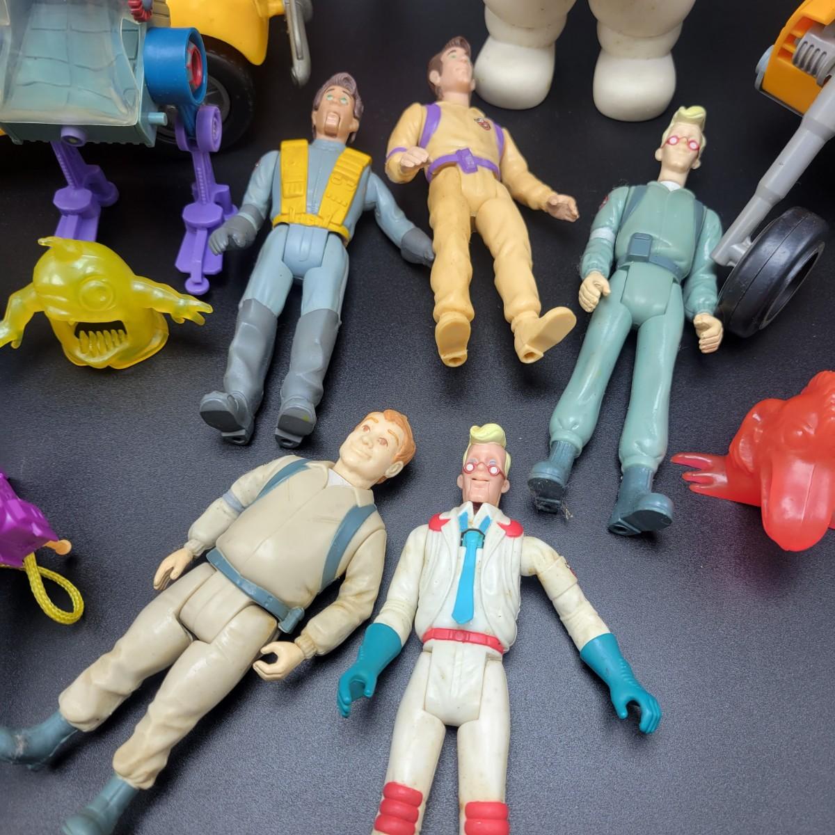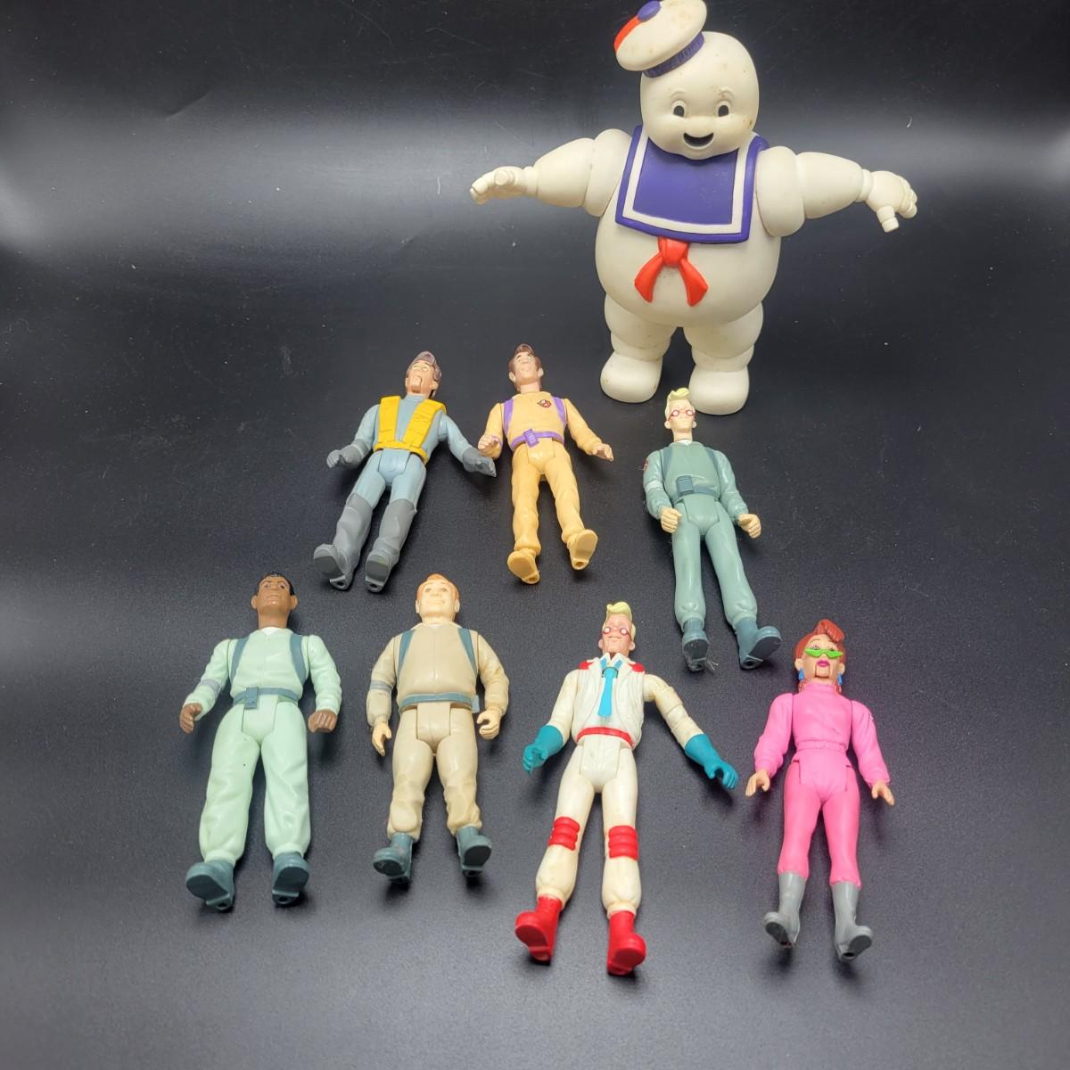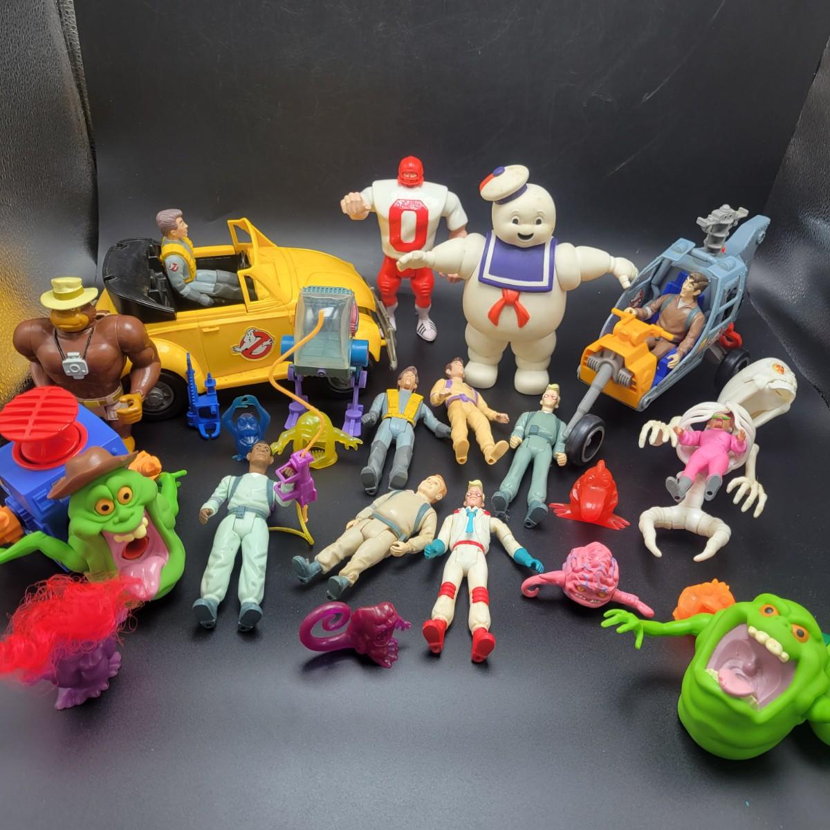 An assortment of action figures and props from Ghostbusters in good condition. Only one figure has a photon backpack, but most of your favorite characters are here, including the Stay Puff Marshmallow Man, Sliders and more. Shipping available