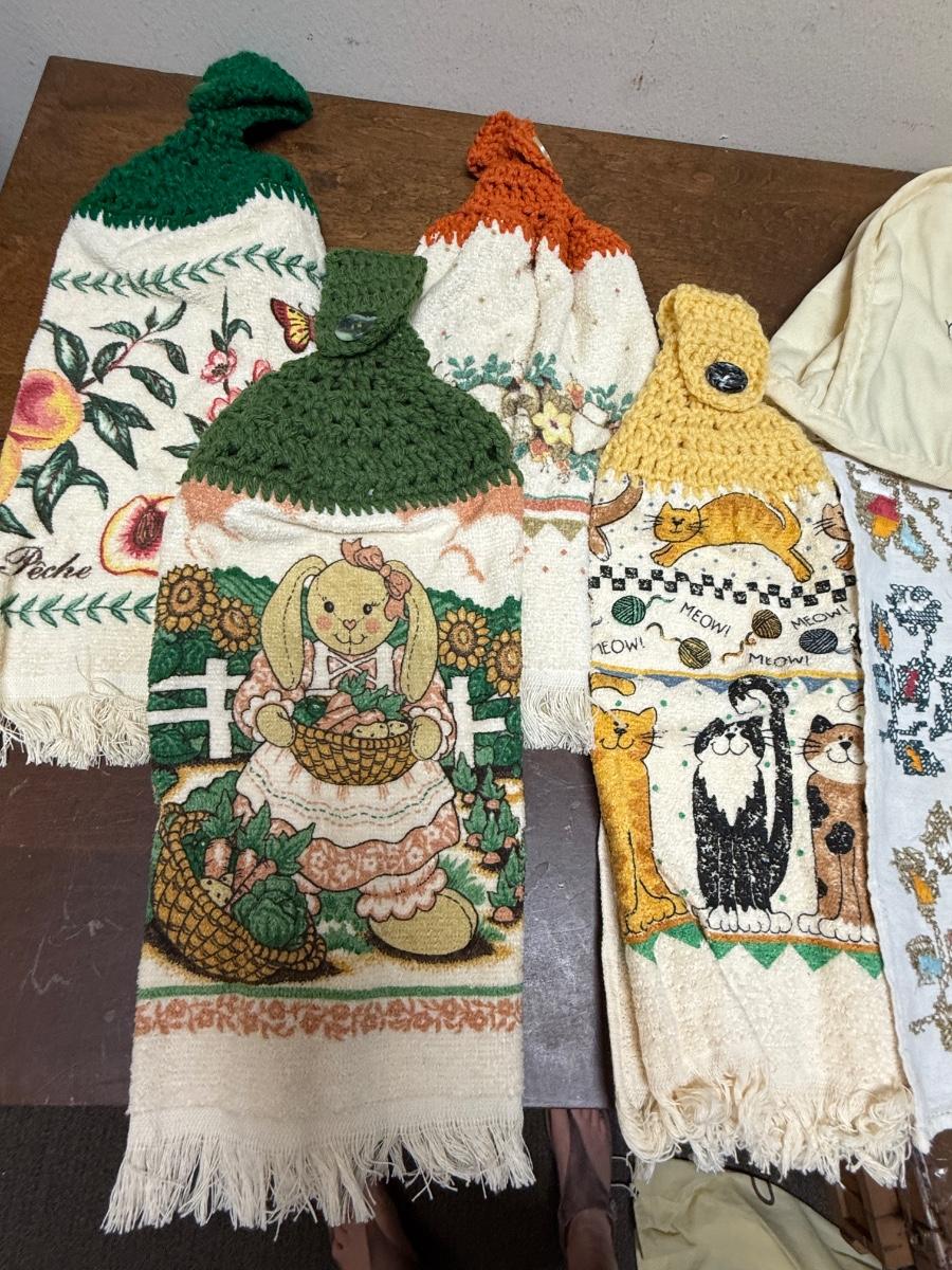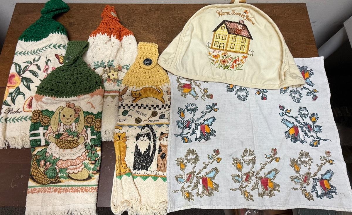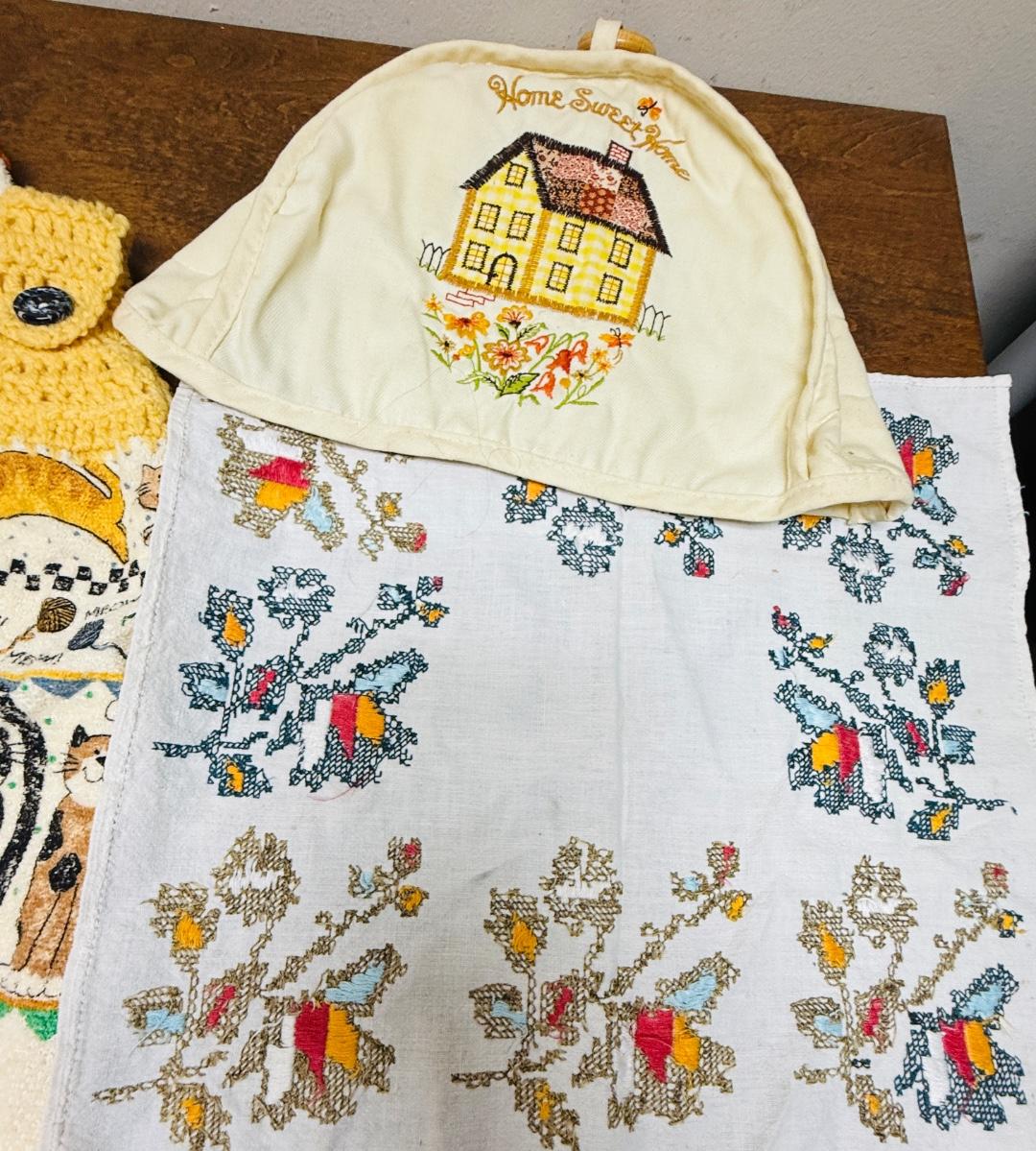 Vintage Linen Lot - toaster cover, napkin, crochet Hook Dish Towels