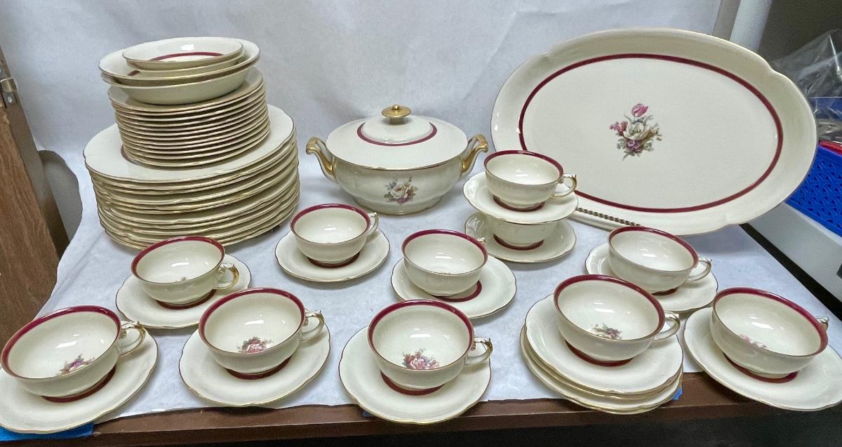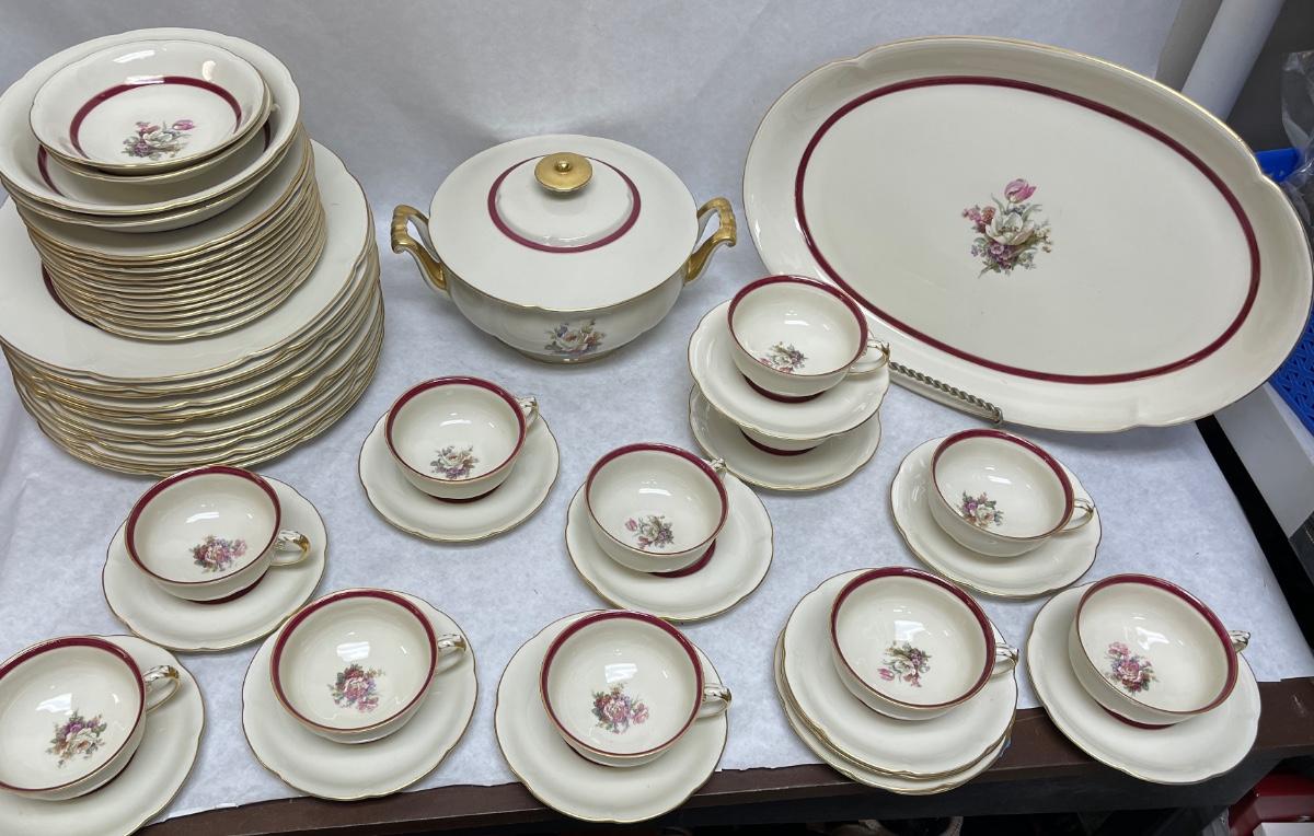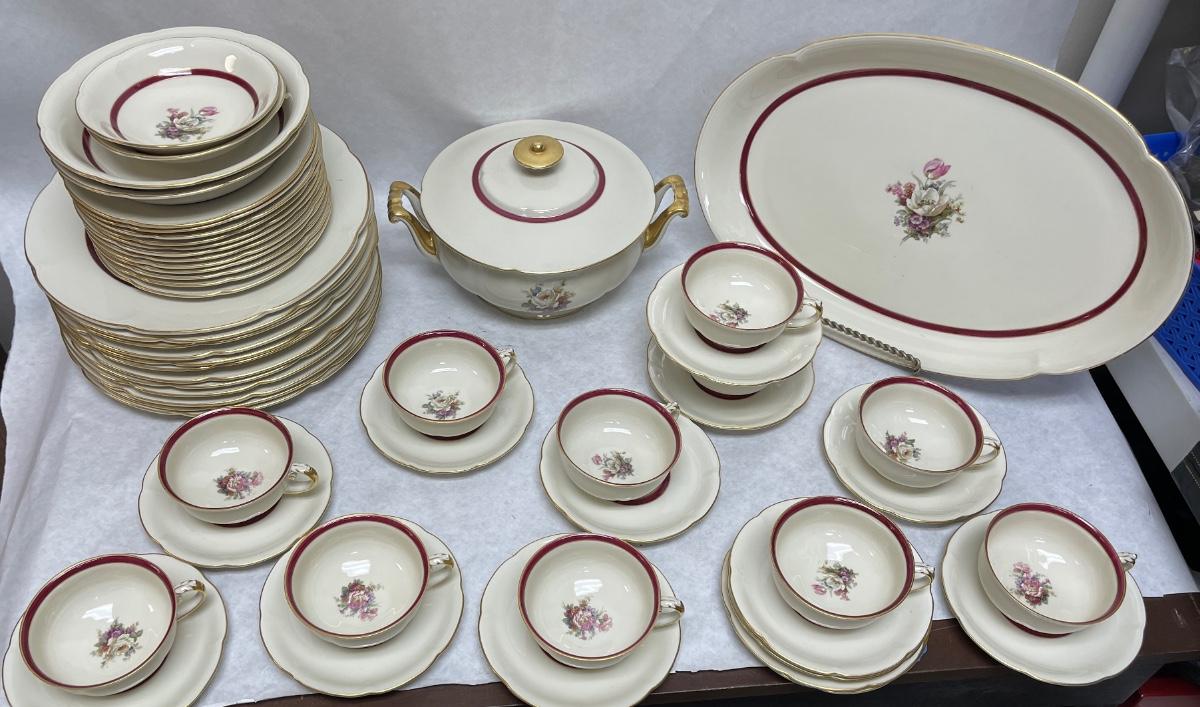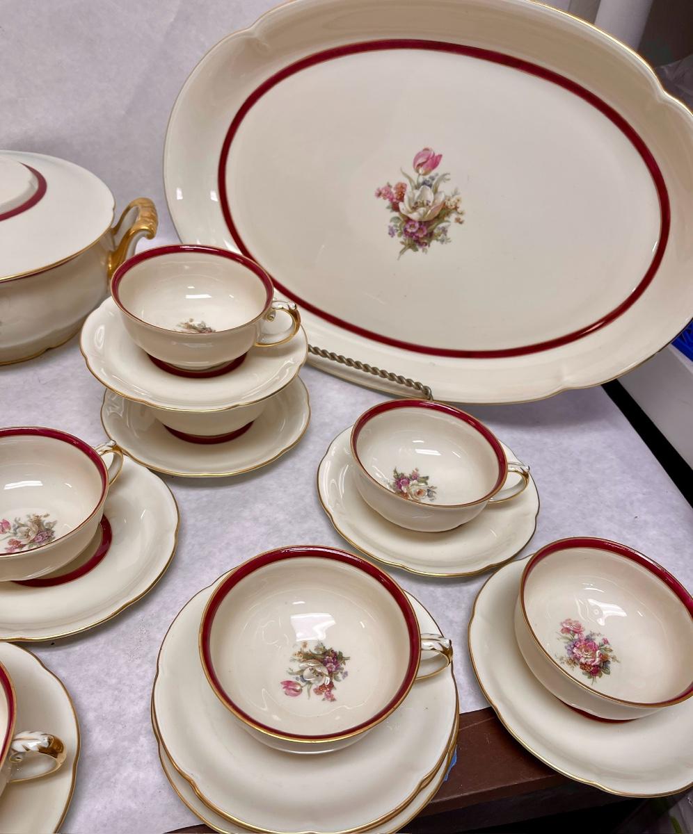 Includes: (12) 11" dinner plates, (1) 8" lidded soup tureen, (11) coffee cups, (12) saucers, (12) 7.5" salad plates, (2) 7.5" bowls, (2) 5.5" small bowls, (2) 6"small plates, and (1) 16" oval Serving Platter. All in good condition.