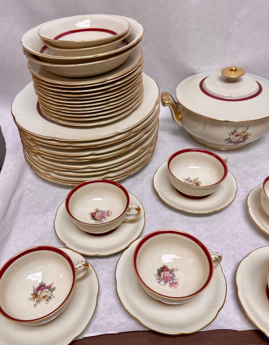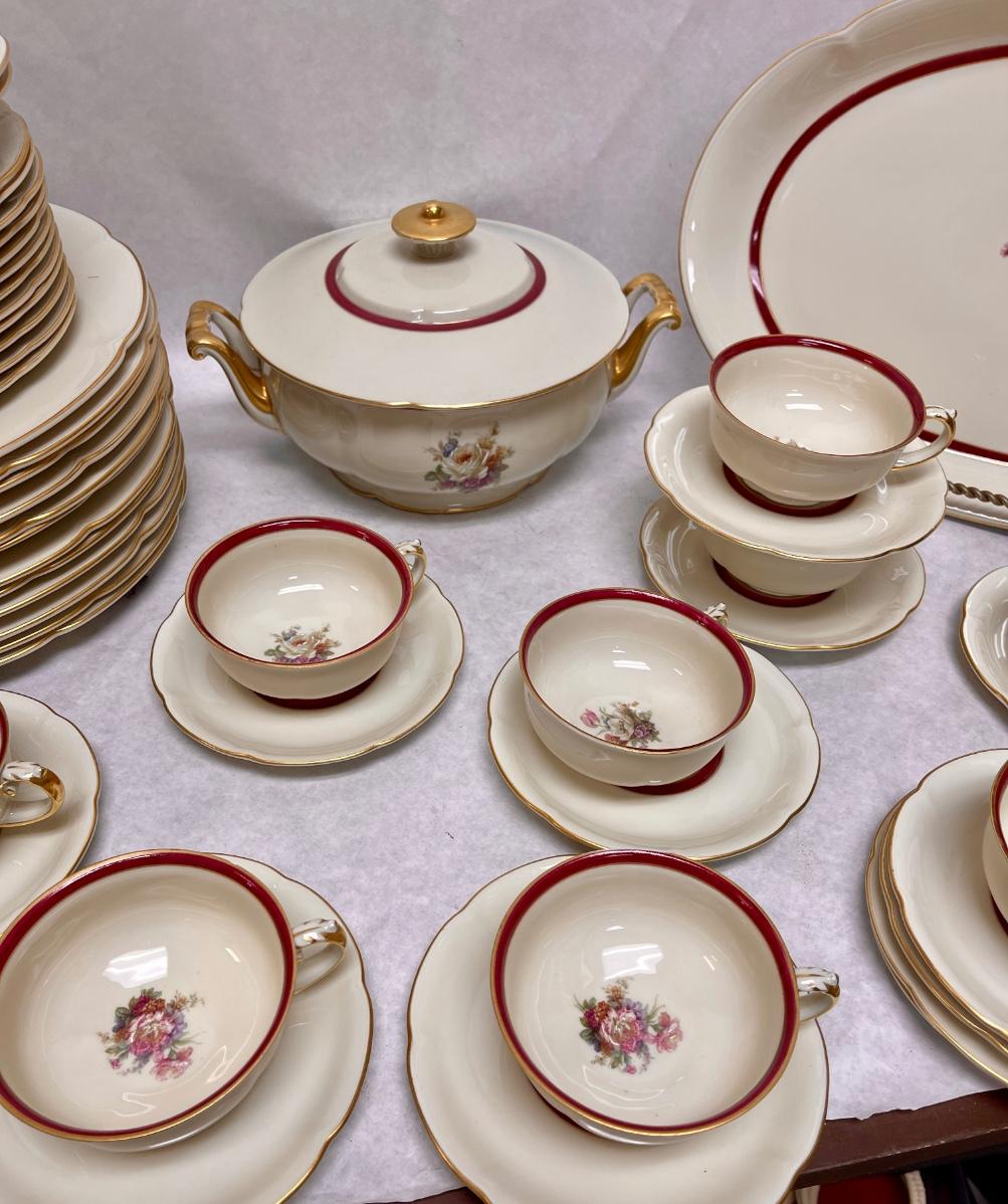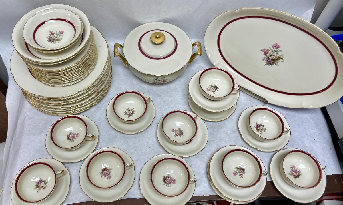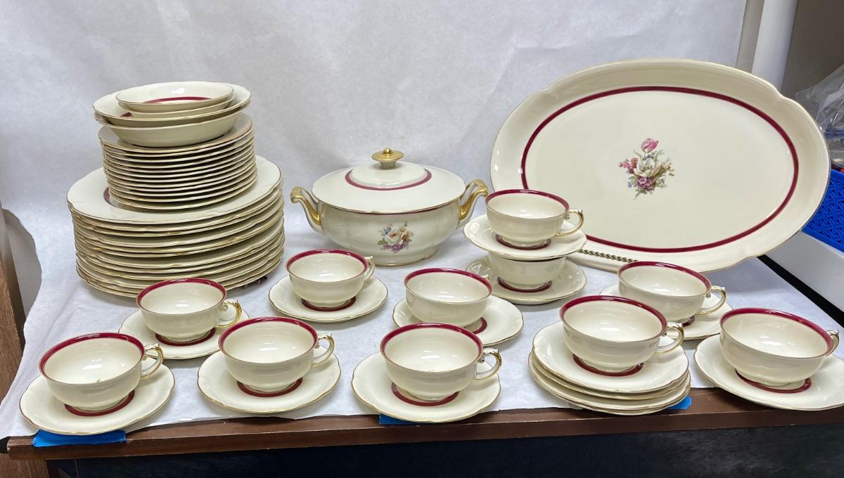 Includes: (12) 11" dinner plates, (1) 8" lidded soup tureen, (11) coffee cups, (12) saucers, (12) 7.5" salad plates, (2) 7.5" bowls, (2) 5.5" small bowls, (2) 6"small plates, and (1) 16" oval Serving Platter. All in good condition.