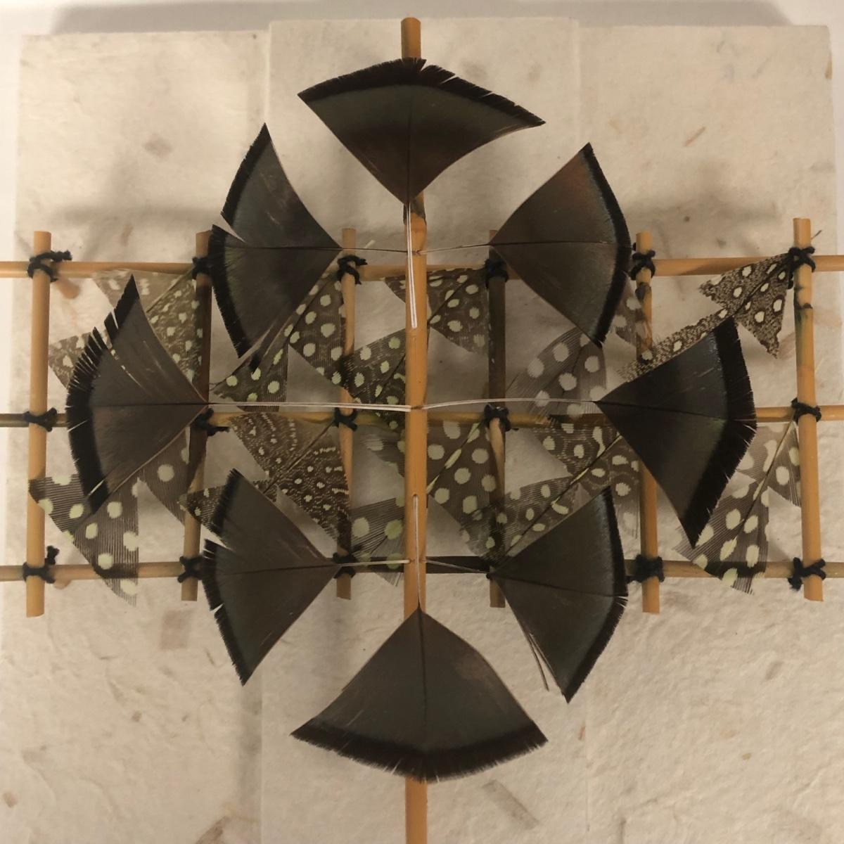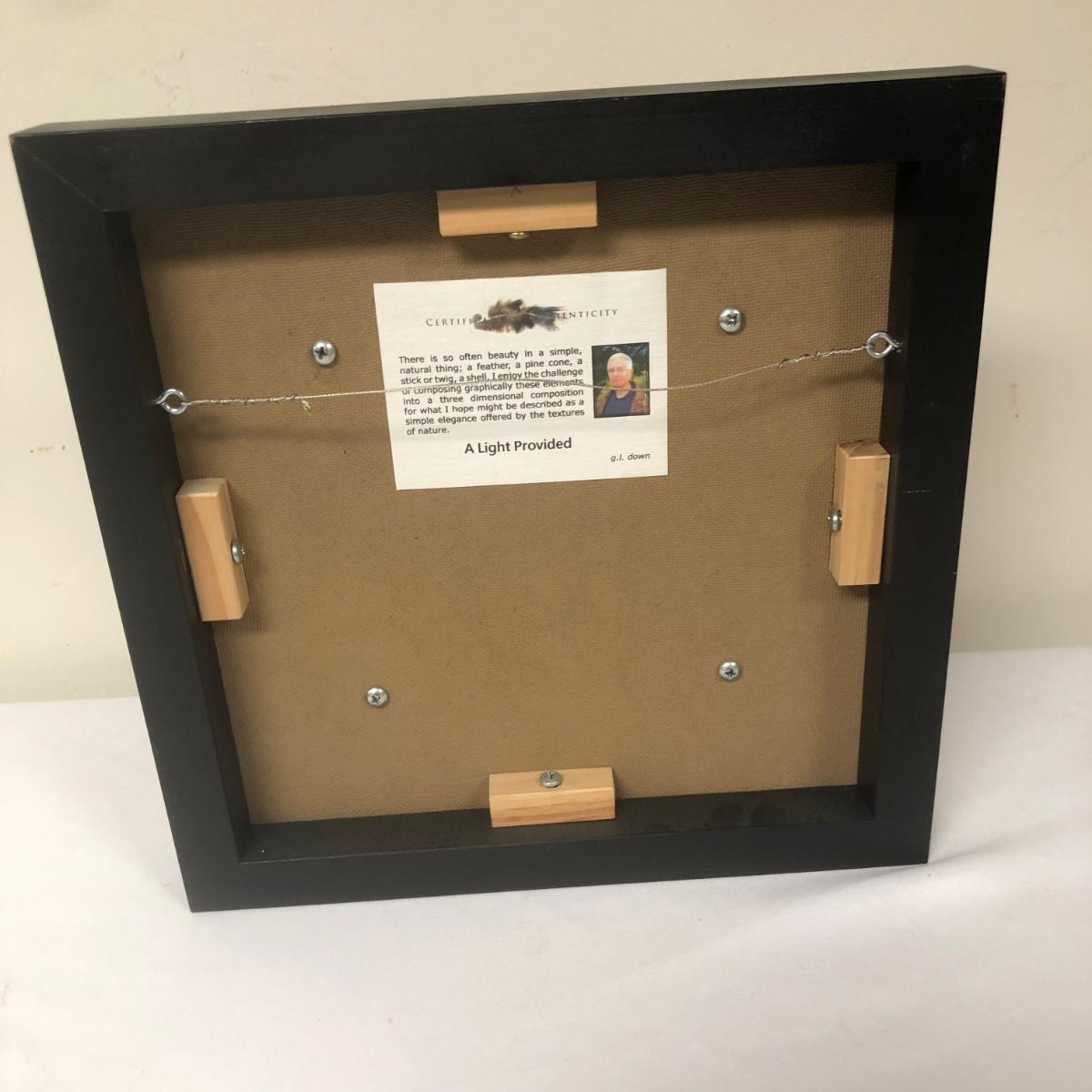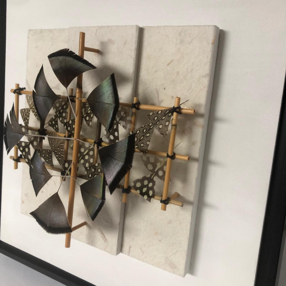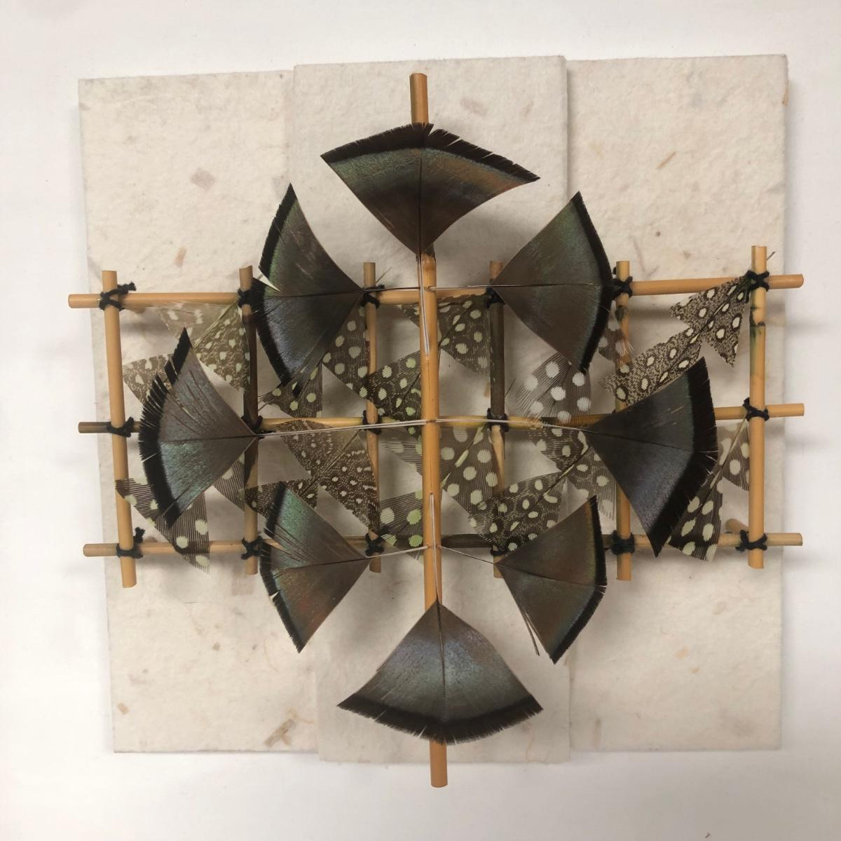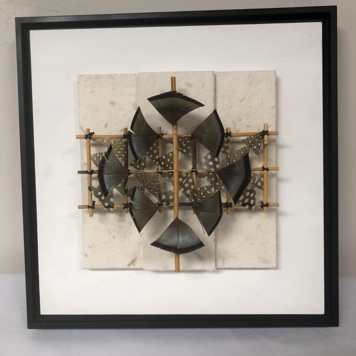 This exquisite artwork with frame measures 12” x 12”. With the three dimensional aspect of this piece of art, it extends about 4” out from the frame. Art is a blend of feathers, hollow dowels, and thread on a base that appears like handmade paper, but has a soft cloth feel. Shipping Available.