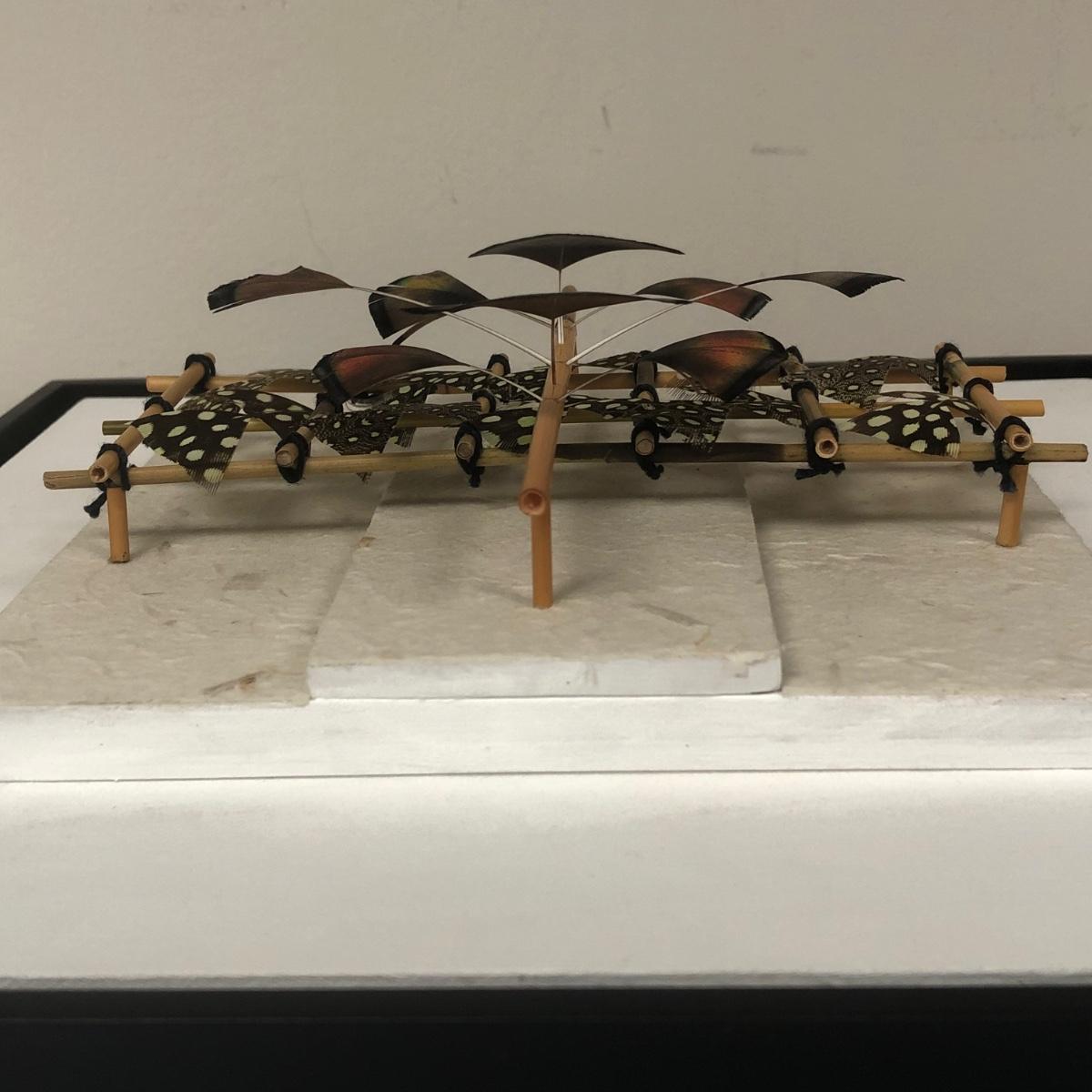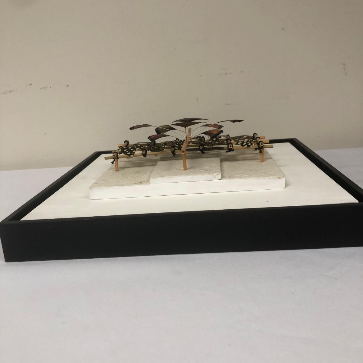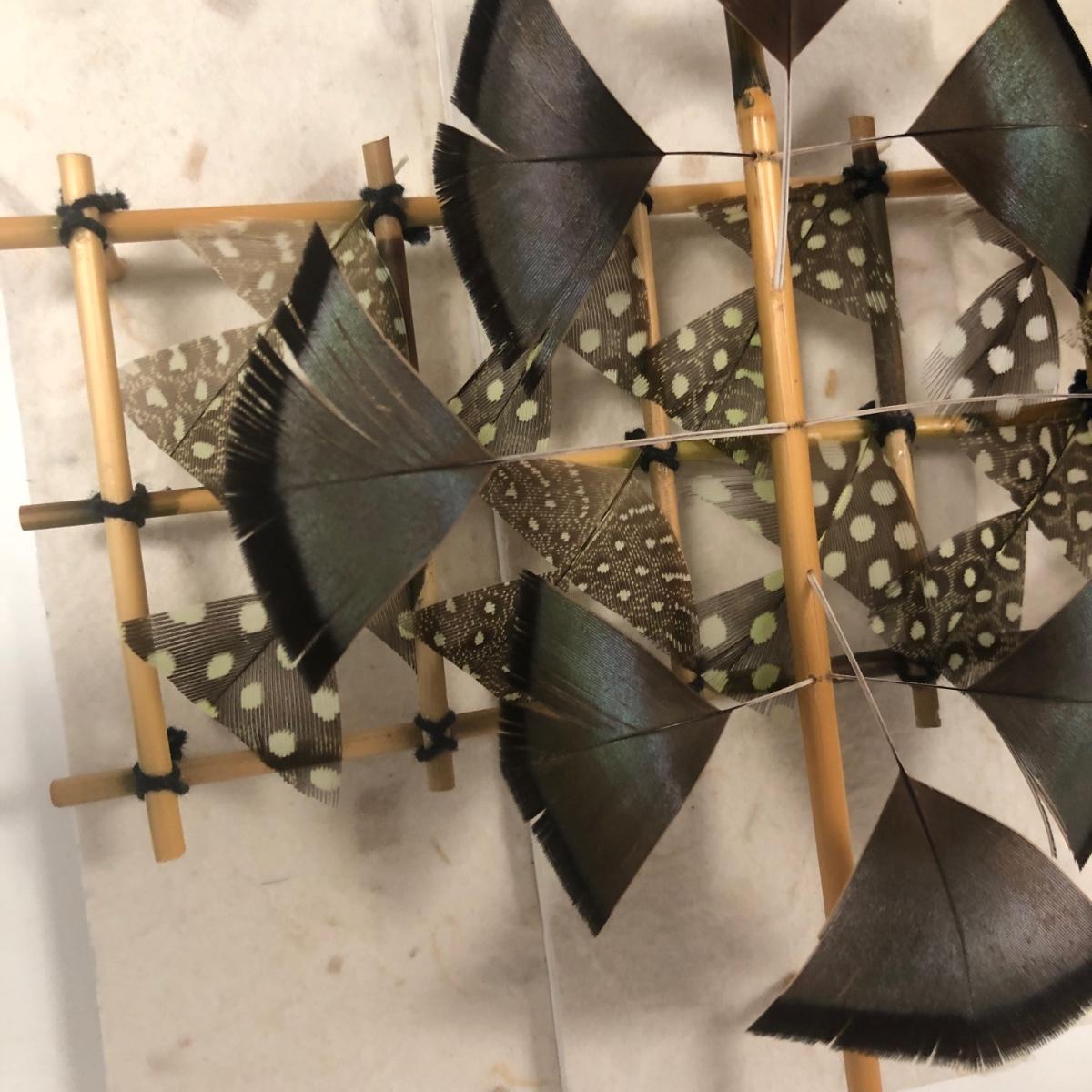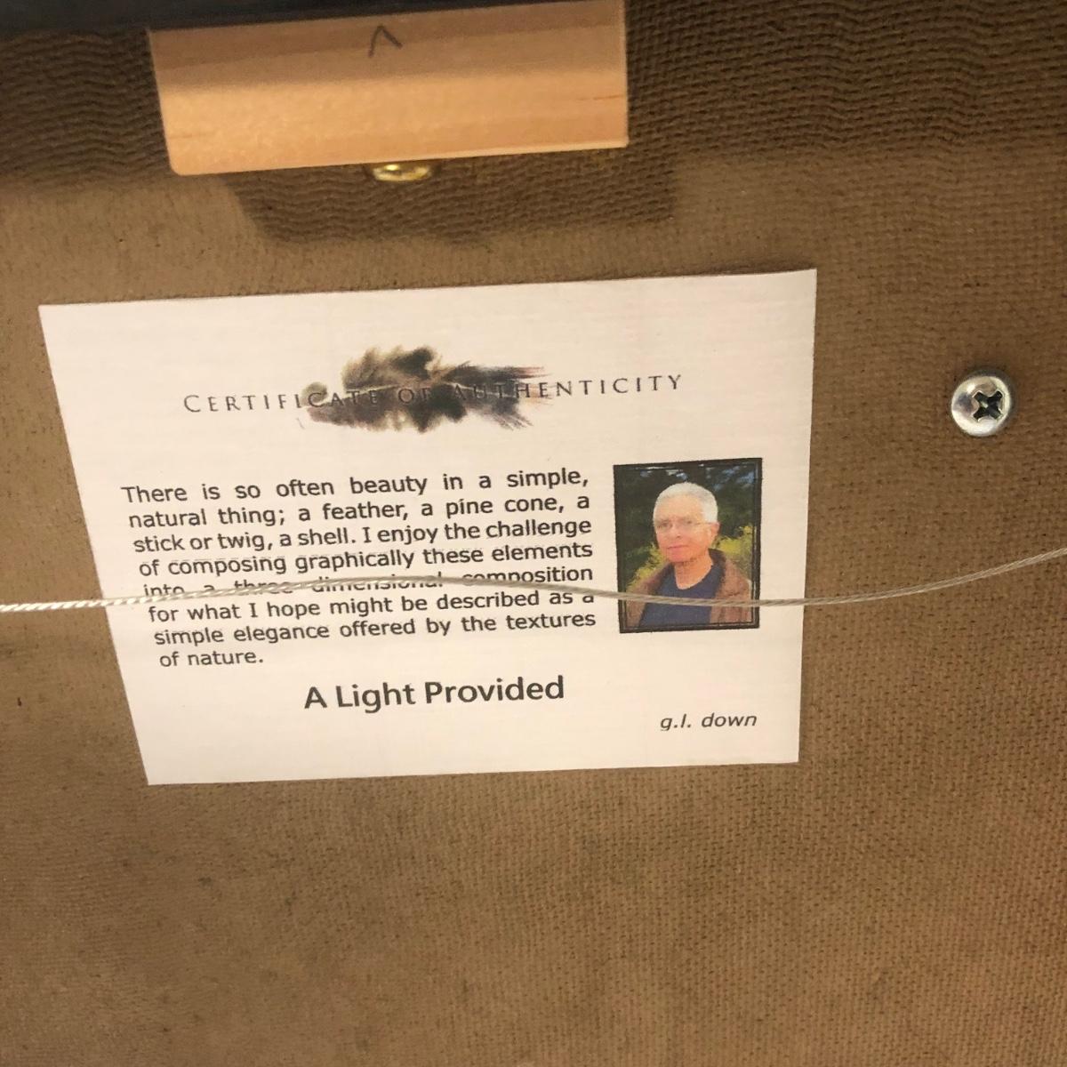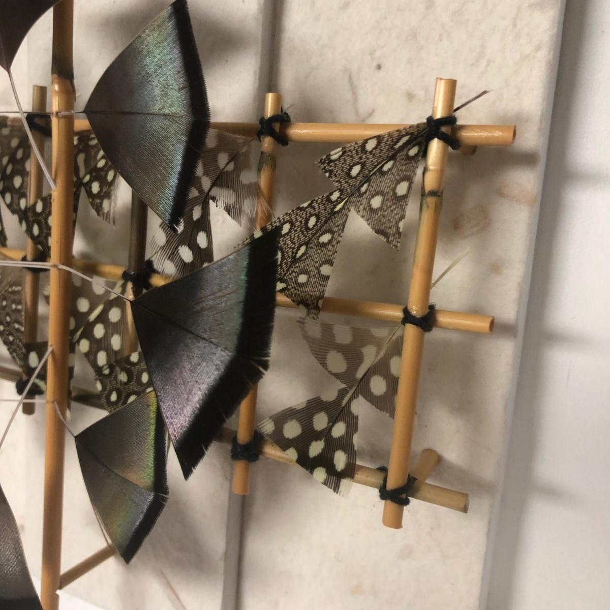 This exquisite artwork with frame measures 12” x 12”. With the three dimensional aspect of this piece of art, it extends about 4” out from the frame. Art is a blend of feathers, hollow dowels, and thread on a base that appears like handmade paper, but has a soft cloth feel. Shipping Available.