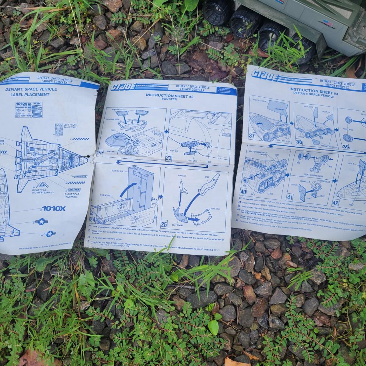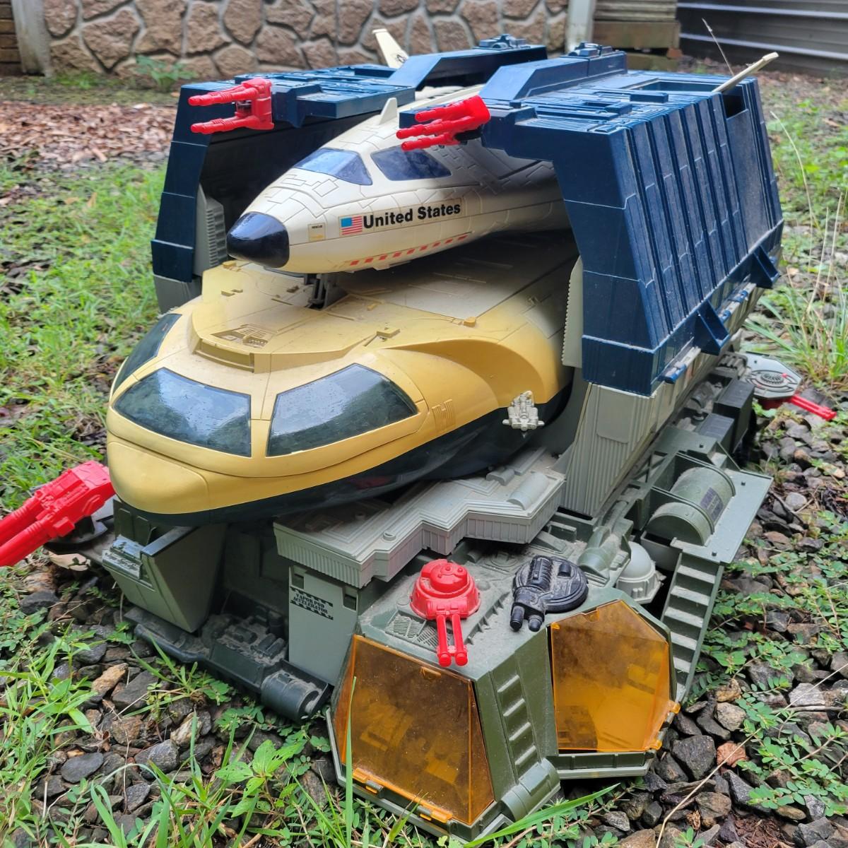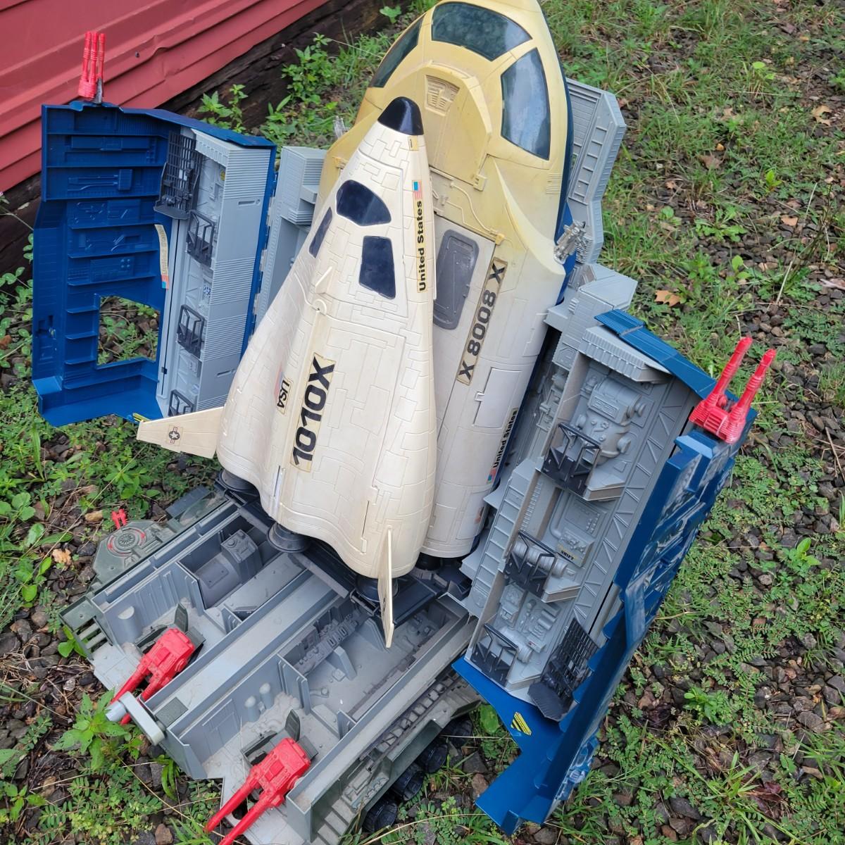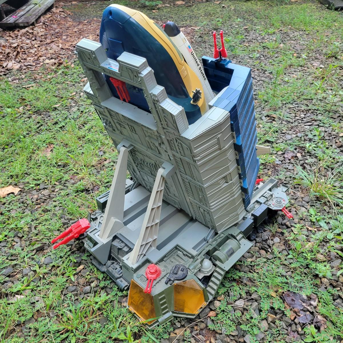 GI Joe Defiant Space Vehicle Launch Complex in good condition. The main fin on the the shuttle is broken and it appears to missing a gun on the complex, but is nearly complete. It is a little dusty from storage and has some sun fading. Lifting mechanism works, but is a little clunky. This is one of the largest GI Joe toys made and it is fairly rare to find one intact. Lot also includes most of the original instructions. Measures approximately 31" x 24" x 18" Shipping available.