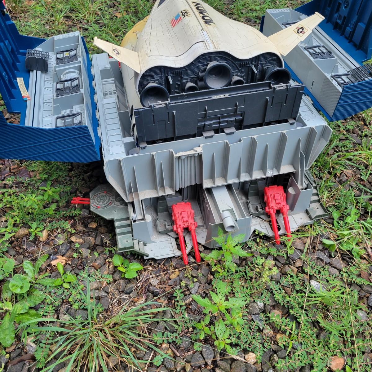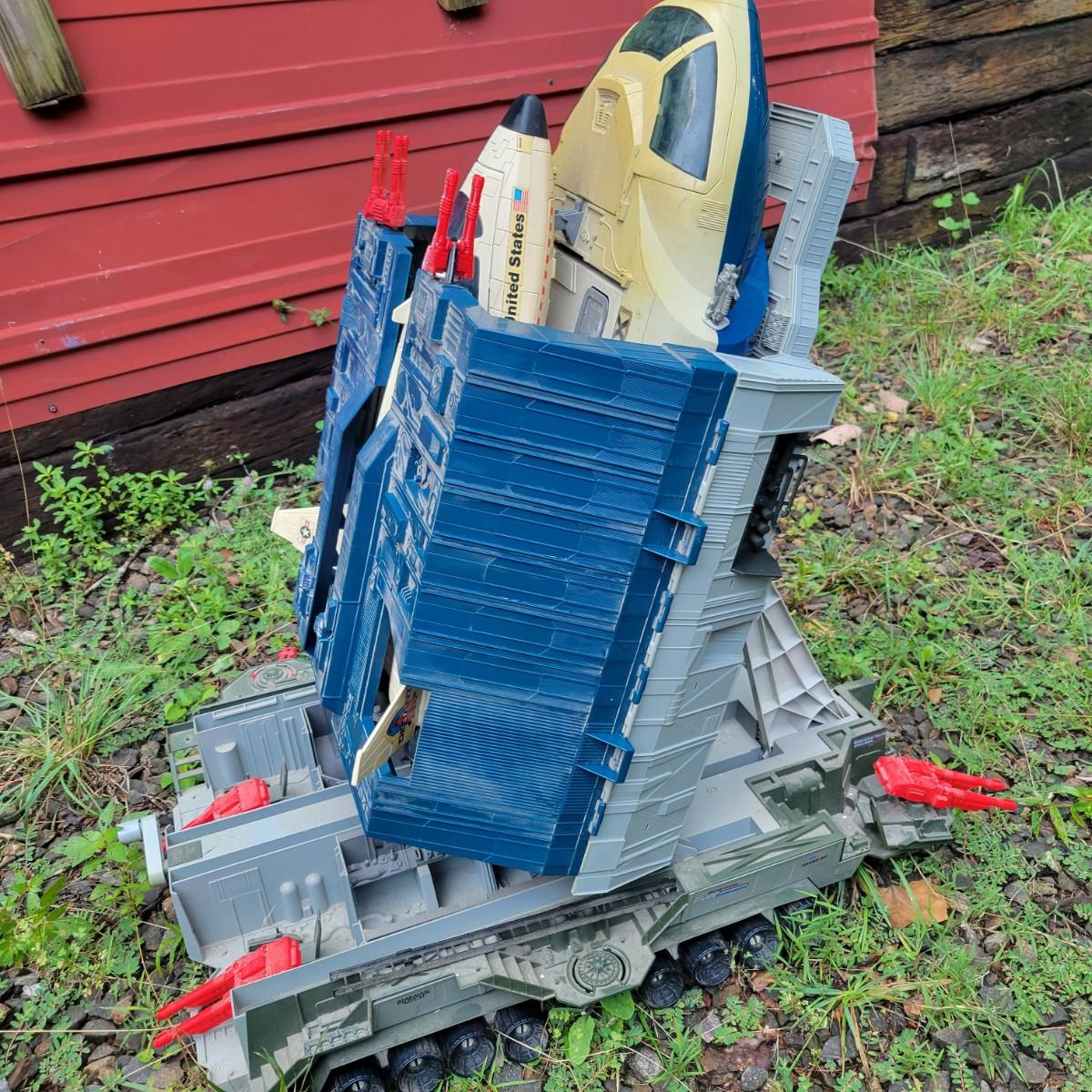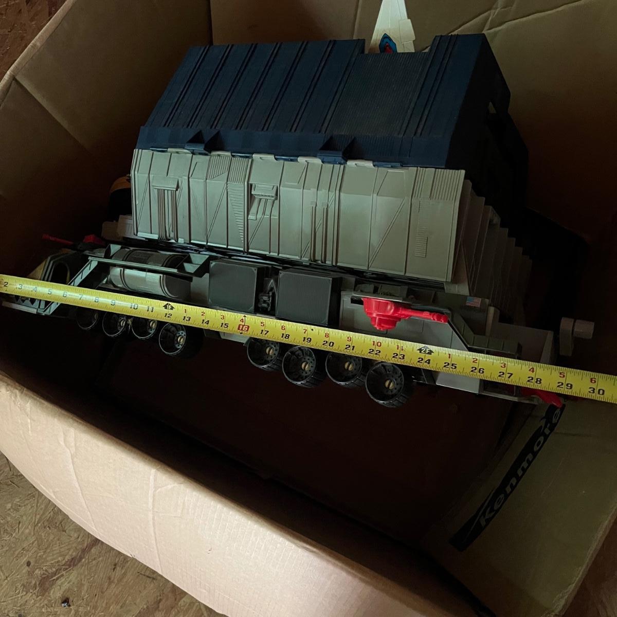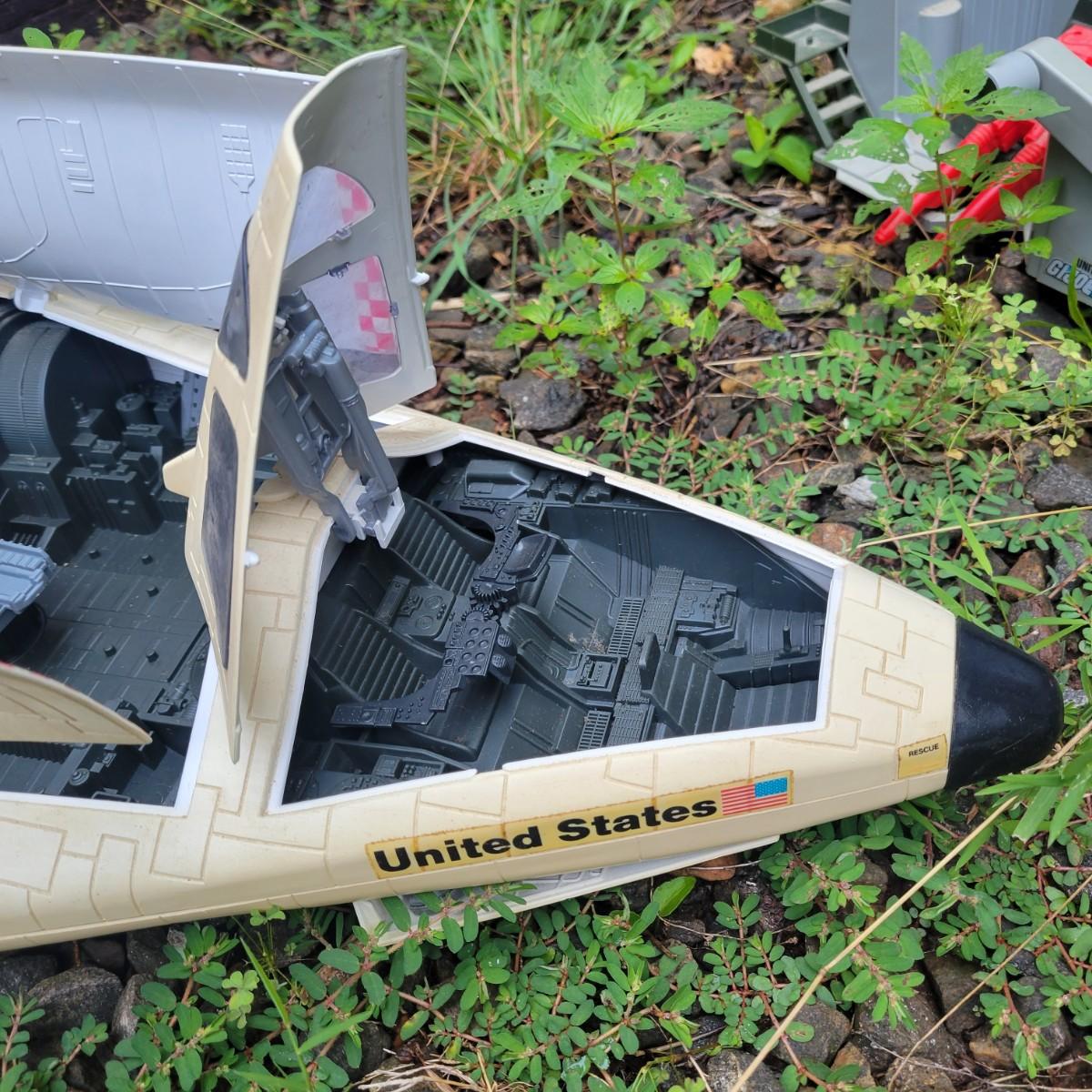 GI Joe Defiant Space Vehicle Launch Complex in good condition. The main fin on the the shuttle is broken and it appears to missing a gun on the complex, but is nearly complete. It is a little dusty from storage and has some sun fading. Lifting mechanism works, but is a little clunky. This is one of the largest GI Joe toys made and it is fairly rare to find one intact. Lot also includes most of the original instructions. Measures approximately 31" x 24" x 18" Shipping available.