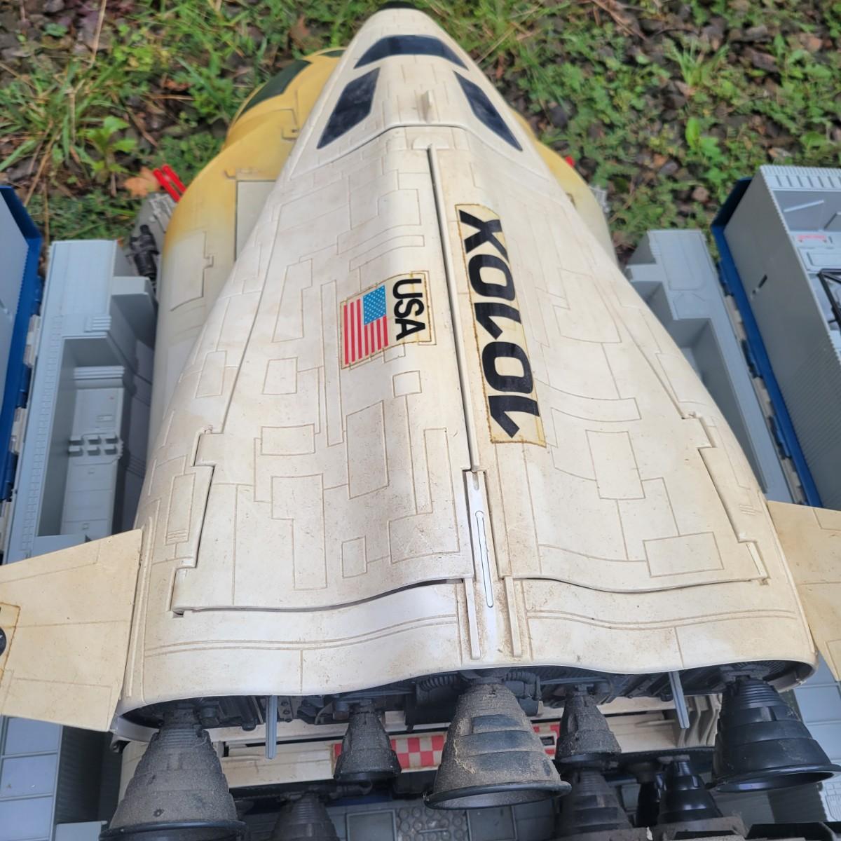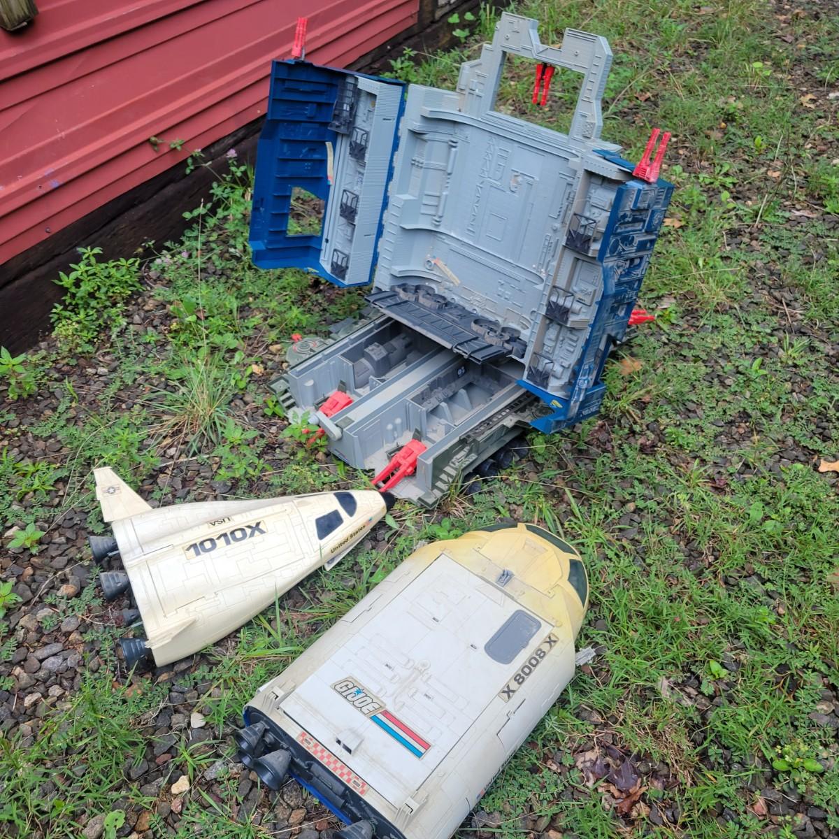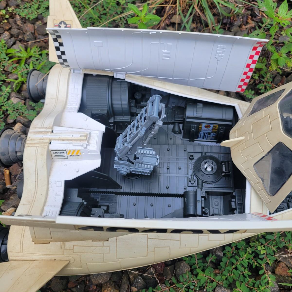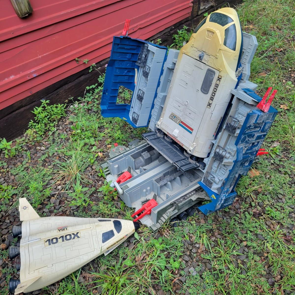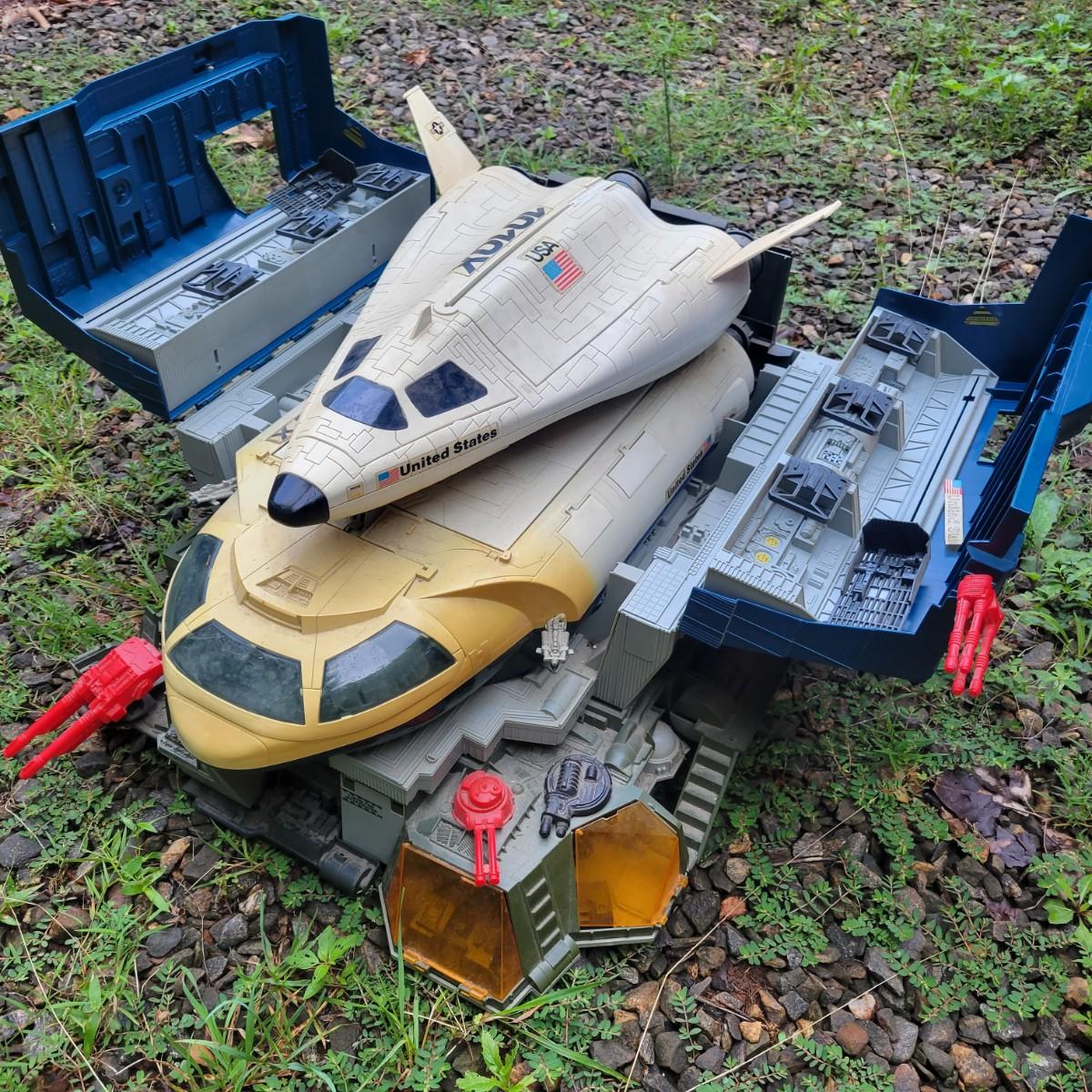 GI Joe Defiant Space Vehicle Launch Complex in good condition. The main fin on the the shuttle is broken and it appears to missing a gun on the complex, but is nearly complete. It is a little dusty from storage and has some sun fading. Lifting mechanism works, but is a little clunky. This is one of the largest GI Joe toys made and it is fairly rare to find one intact. Lot also includes most of the original instructions. Measures approximately 31" x 24" x 18" Shipping available.