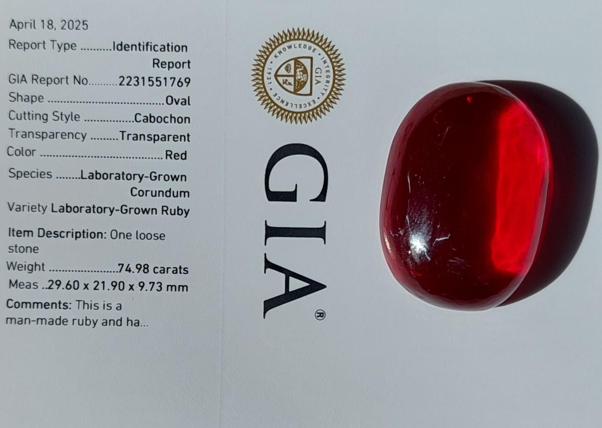 GIA CERTIFIED LAB GROWN RUBY 74.98 CT