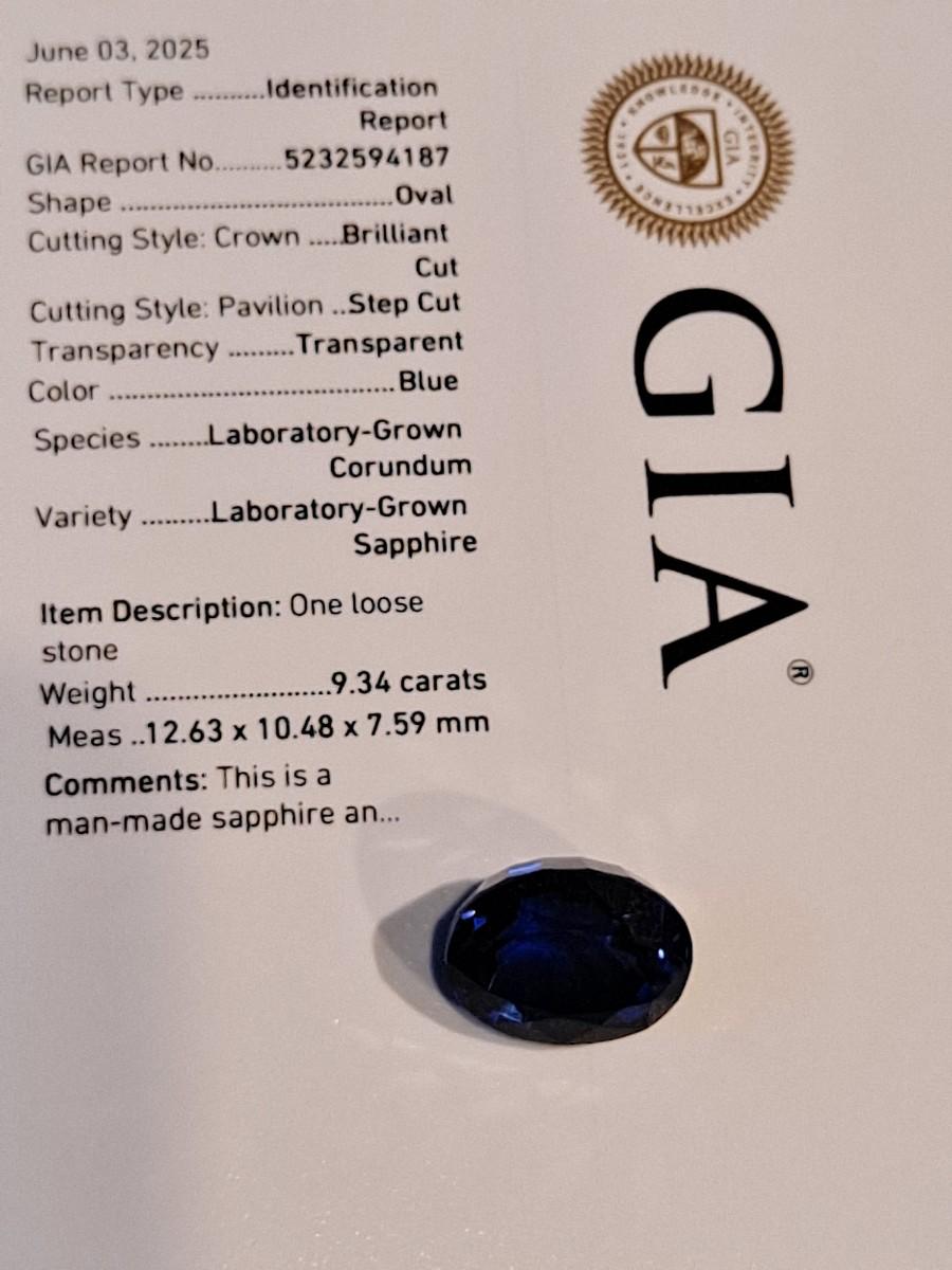 This beautiful gemstone is lab grown Sapphire 9.34 carat it is g i a certified valued at $3600