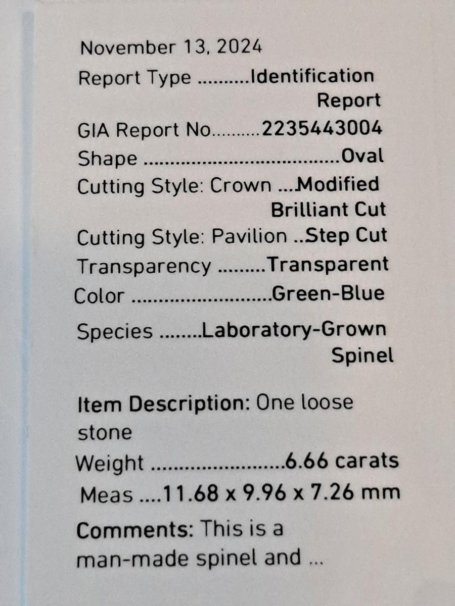 GIA CERTIFIED LAB GROWN Spinel 6.66 CTS