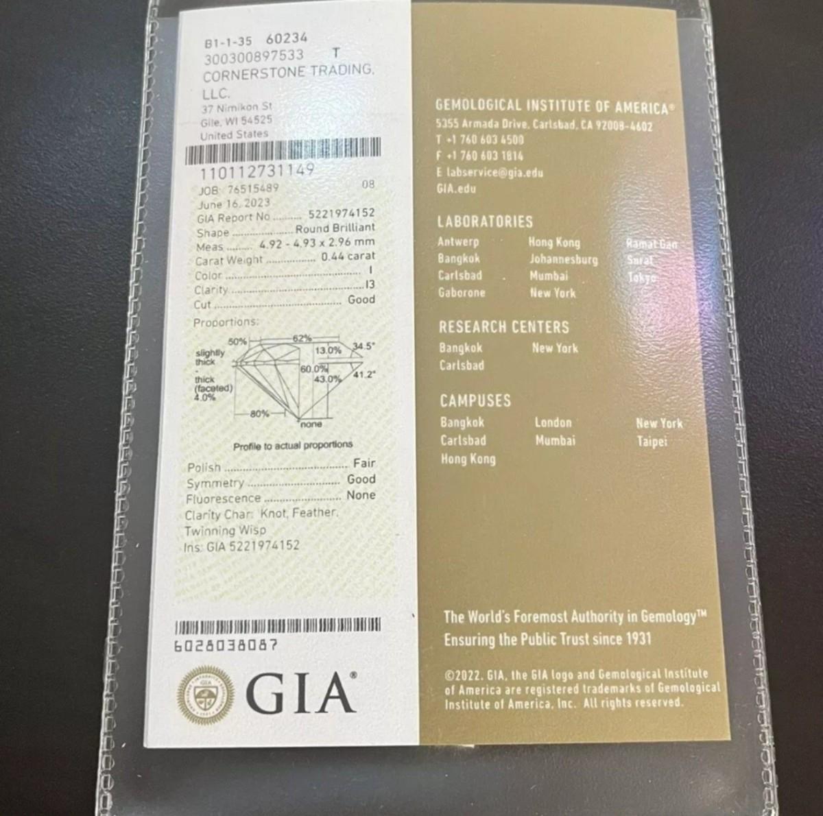 GIA certified loose diamond Natural 0.44 CT I Color I3 Good Cut with Insurance Appraisal