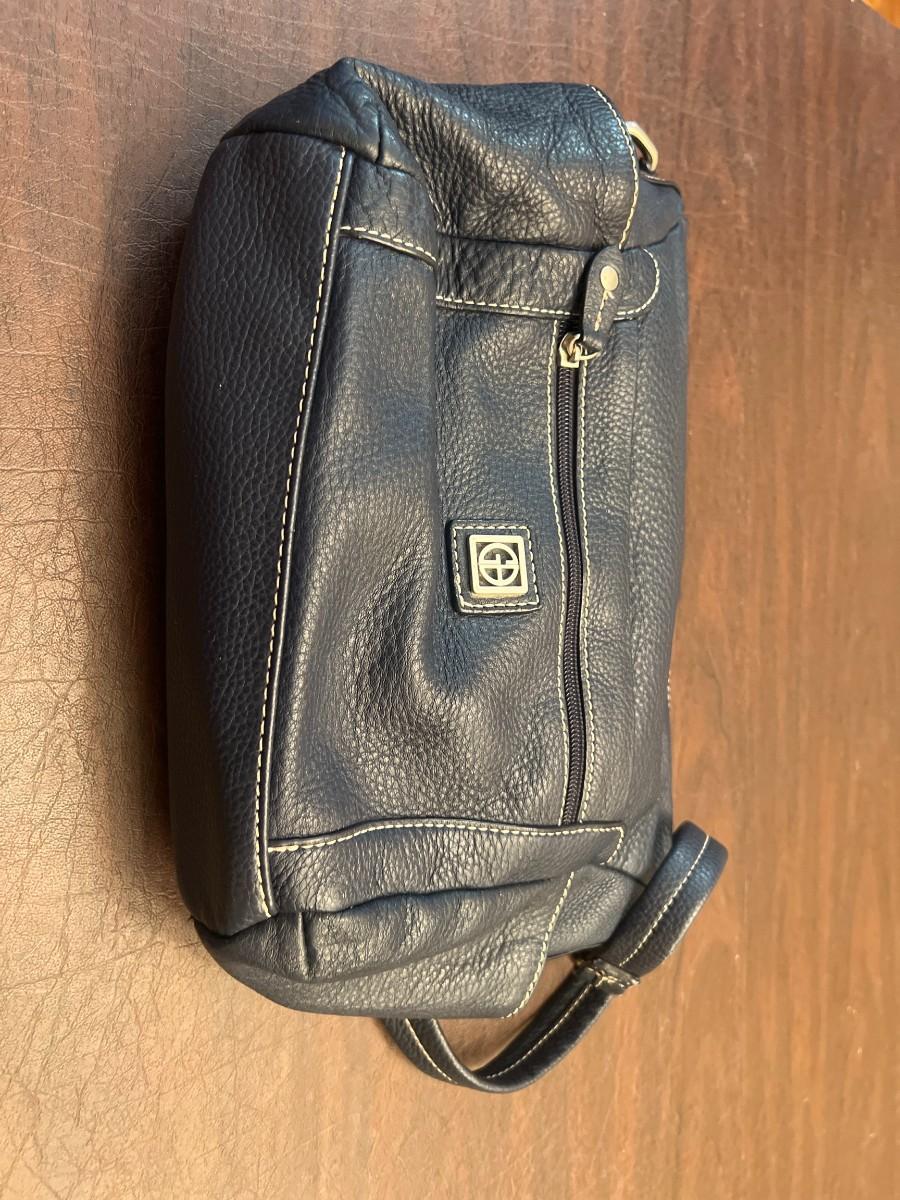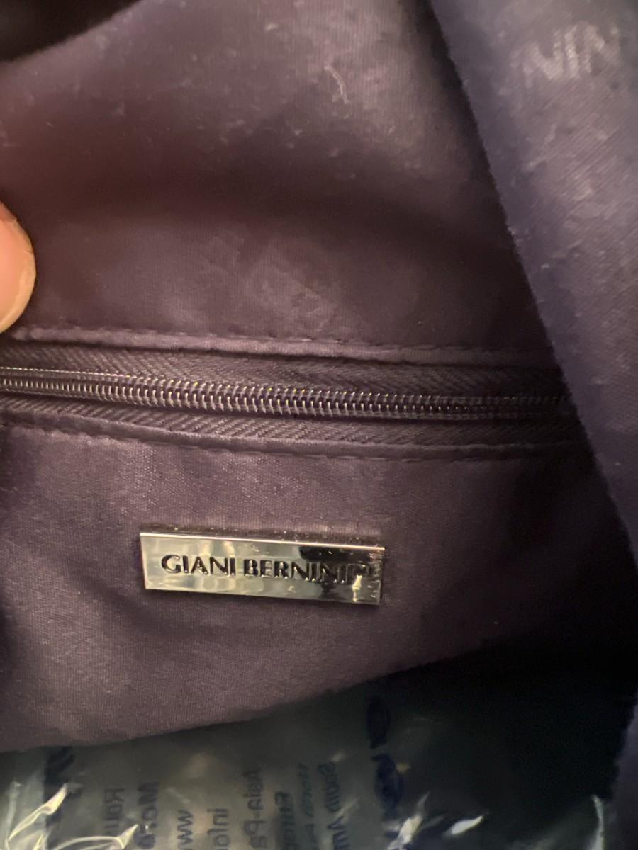 Genuine Giani Bernini leather crossbody bag in rich navy blue. Features soft pebbled leather, front zip pocket, adjustable shoulder strap, and silver-tone hardware. Interior includes zippered pocket and fabric lining stamped with the Giani Bernini logo. Classic, durable, and ideal for everyday use. Clean and in very good condition with minimal signs of wear.