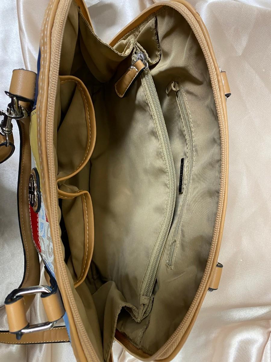 Shoulder strap and handles 2 zipper interior pockets, 2 interior open pockets, 1 exterior zipper pocket.