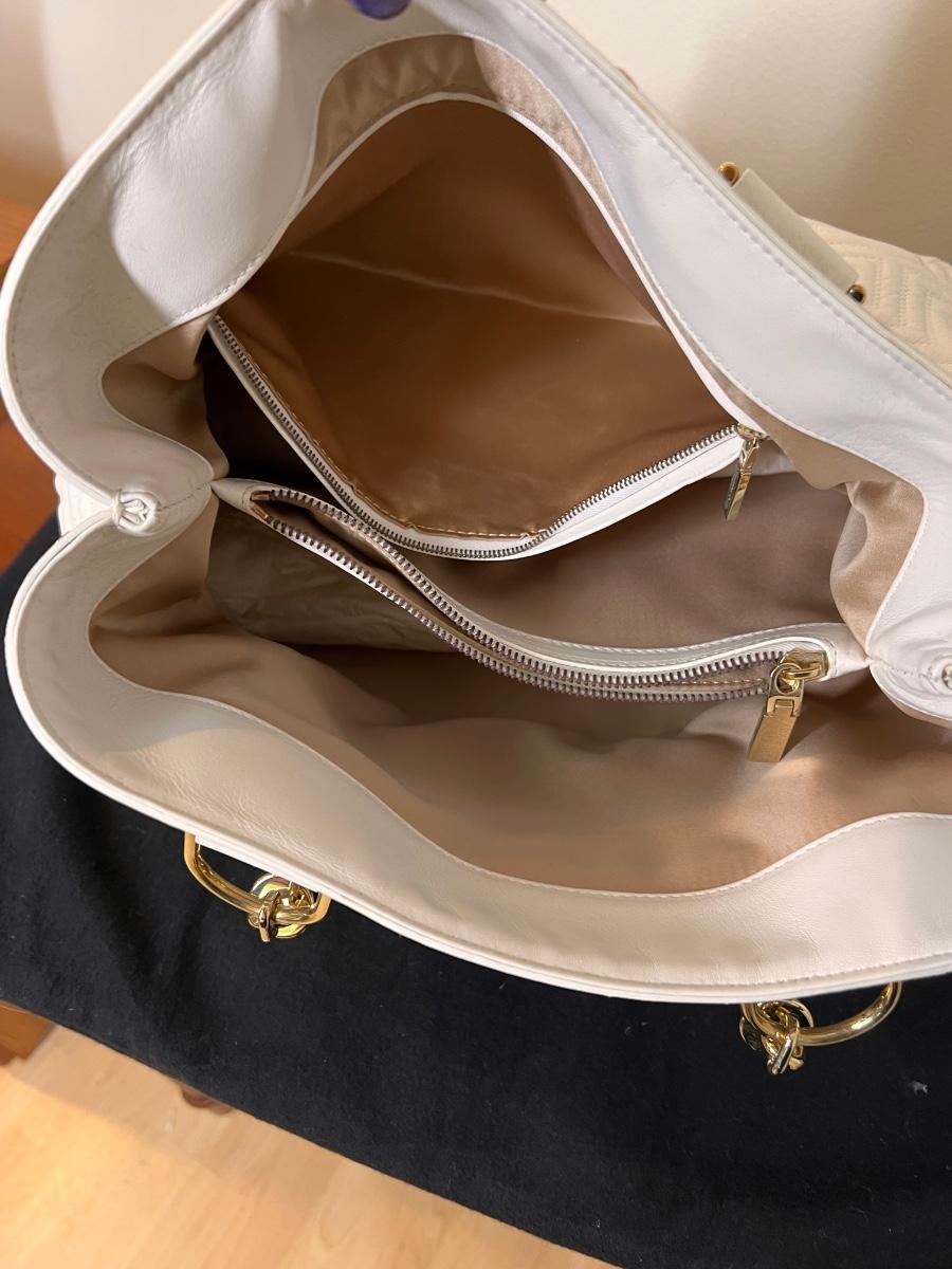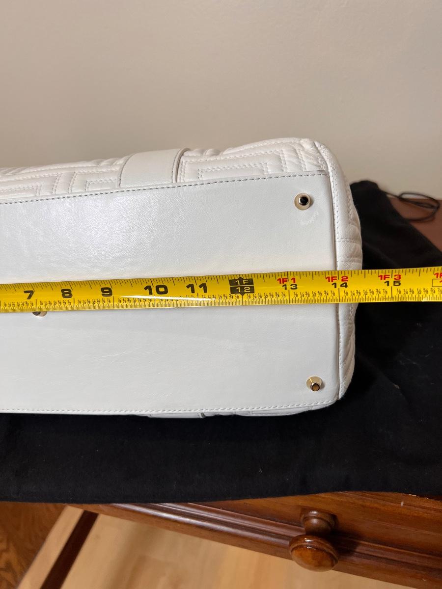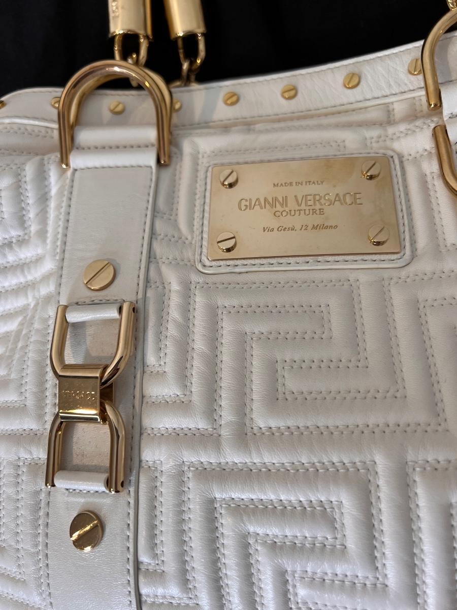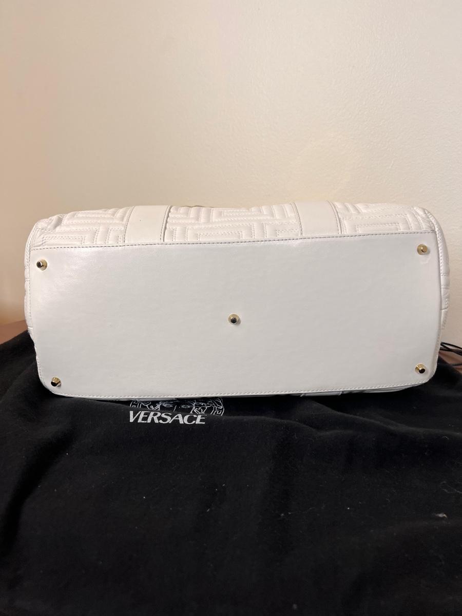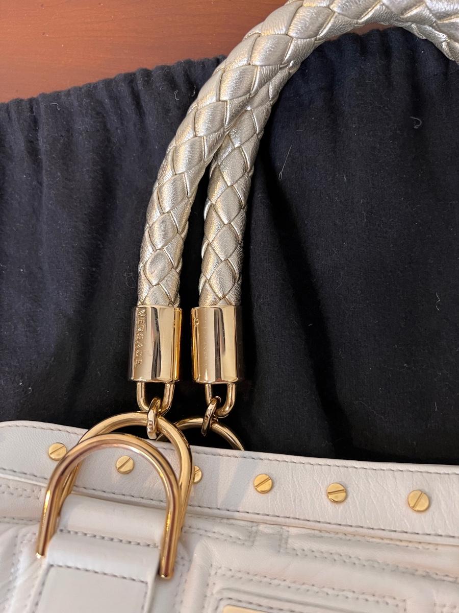 Gianni Versace Top Handle Bag, braided brushed gold colored handles, satin lining and 4 interior pockets. Quilted with classic Versace design. Open top, protective feet at base.