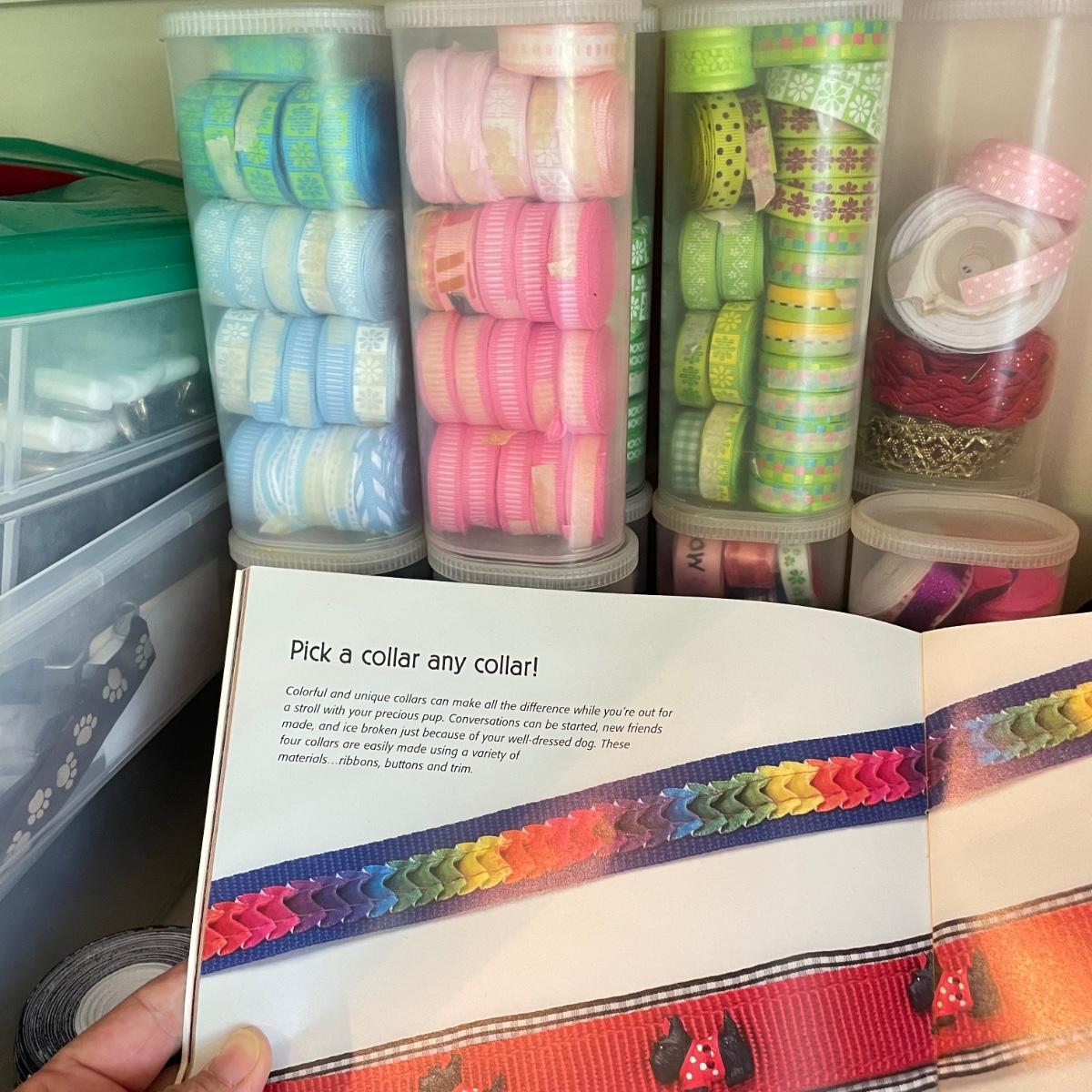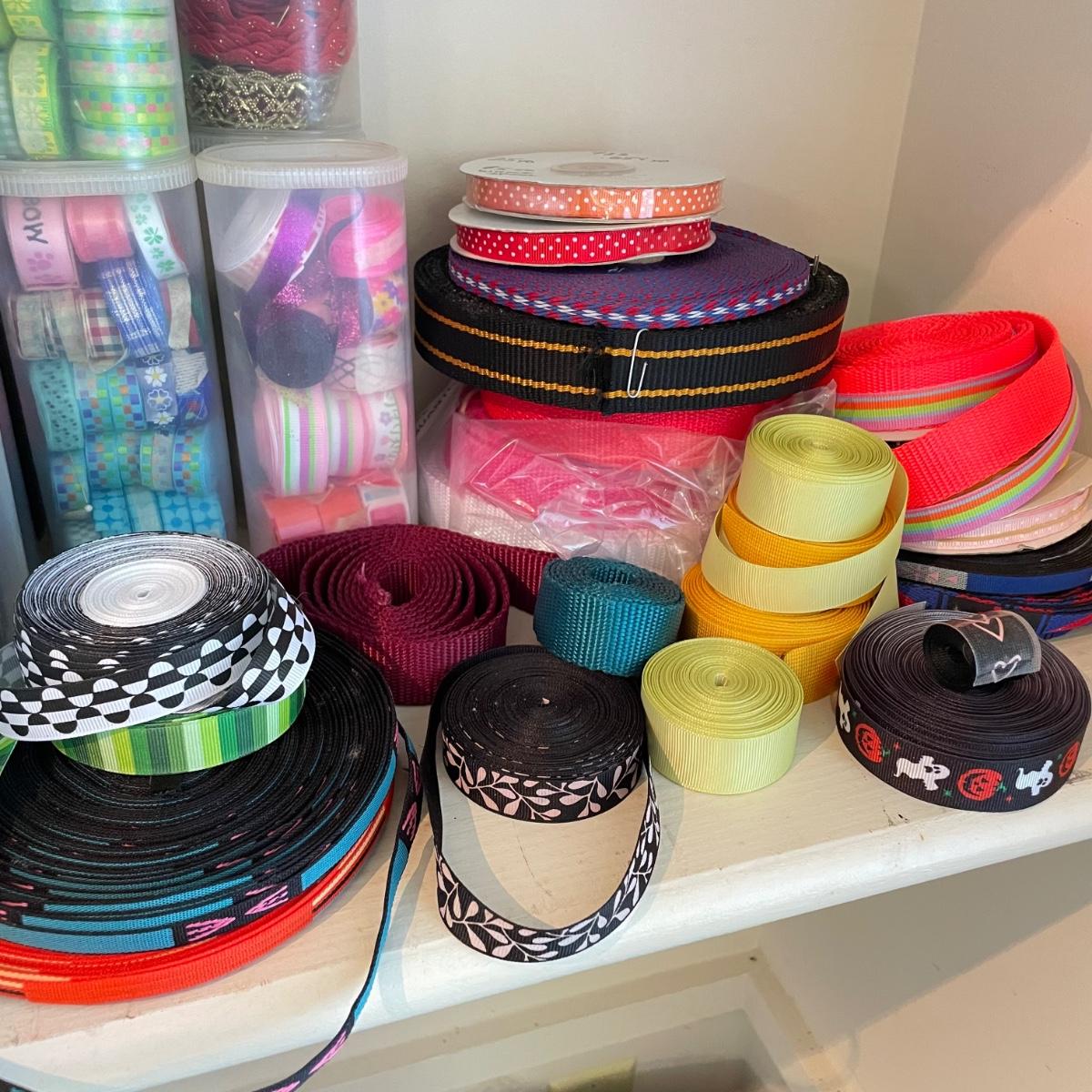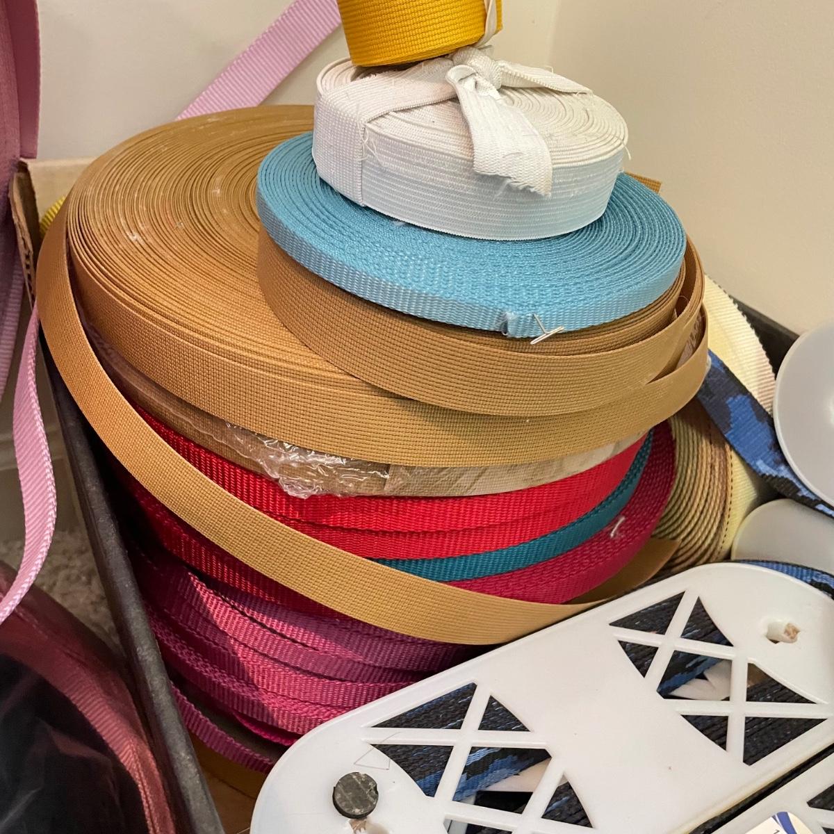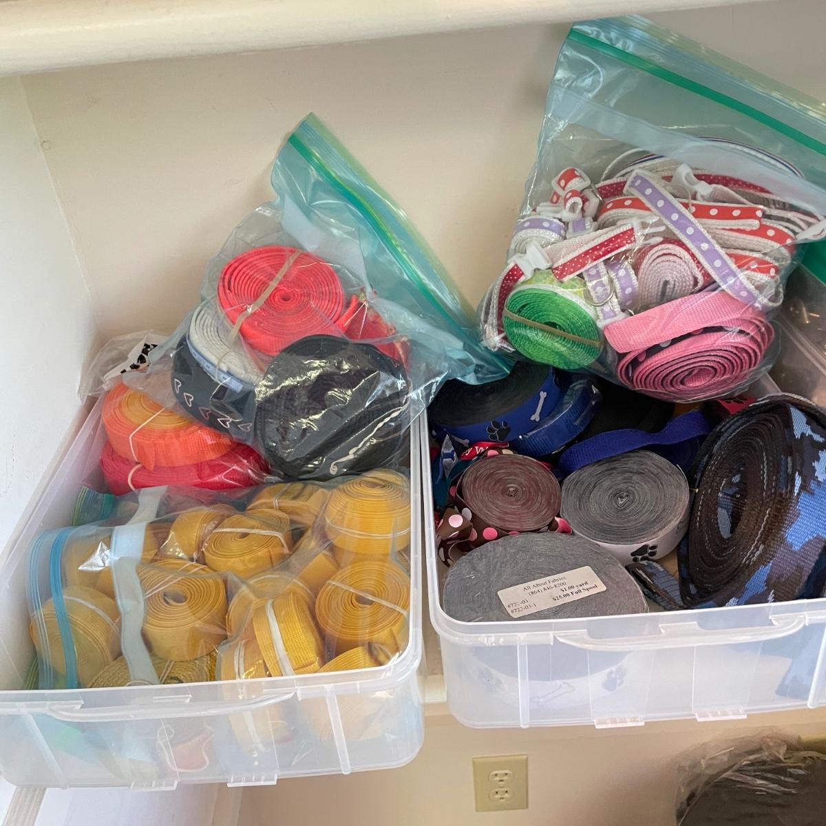 All the supplies needed to make a plethora of pet collars. Lot includes a huge variety of what appears to be mostly nylon ribbon (thick and thinner), plus decorative ribbon, metal D rings, attachment clips, buckles. Lot also has a pet craft magazine. Total inventory photo has a yard stick pictured for reference, it is not included in the lot. See images. Local pick up Only