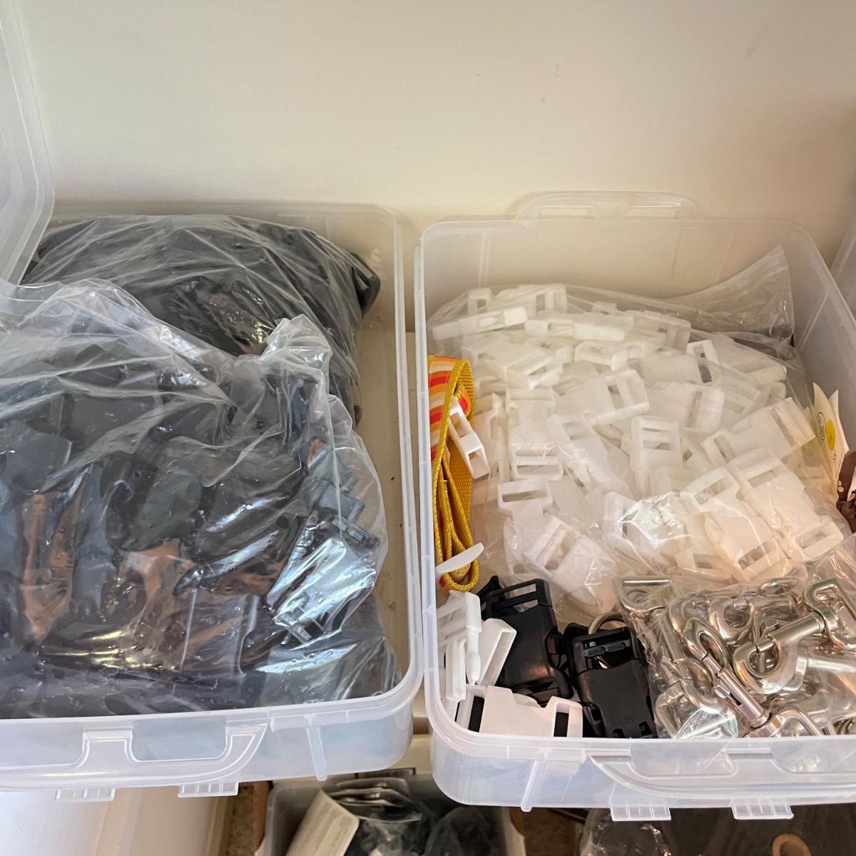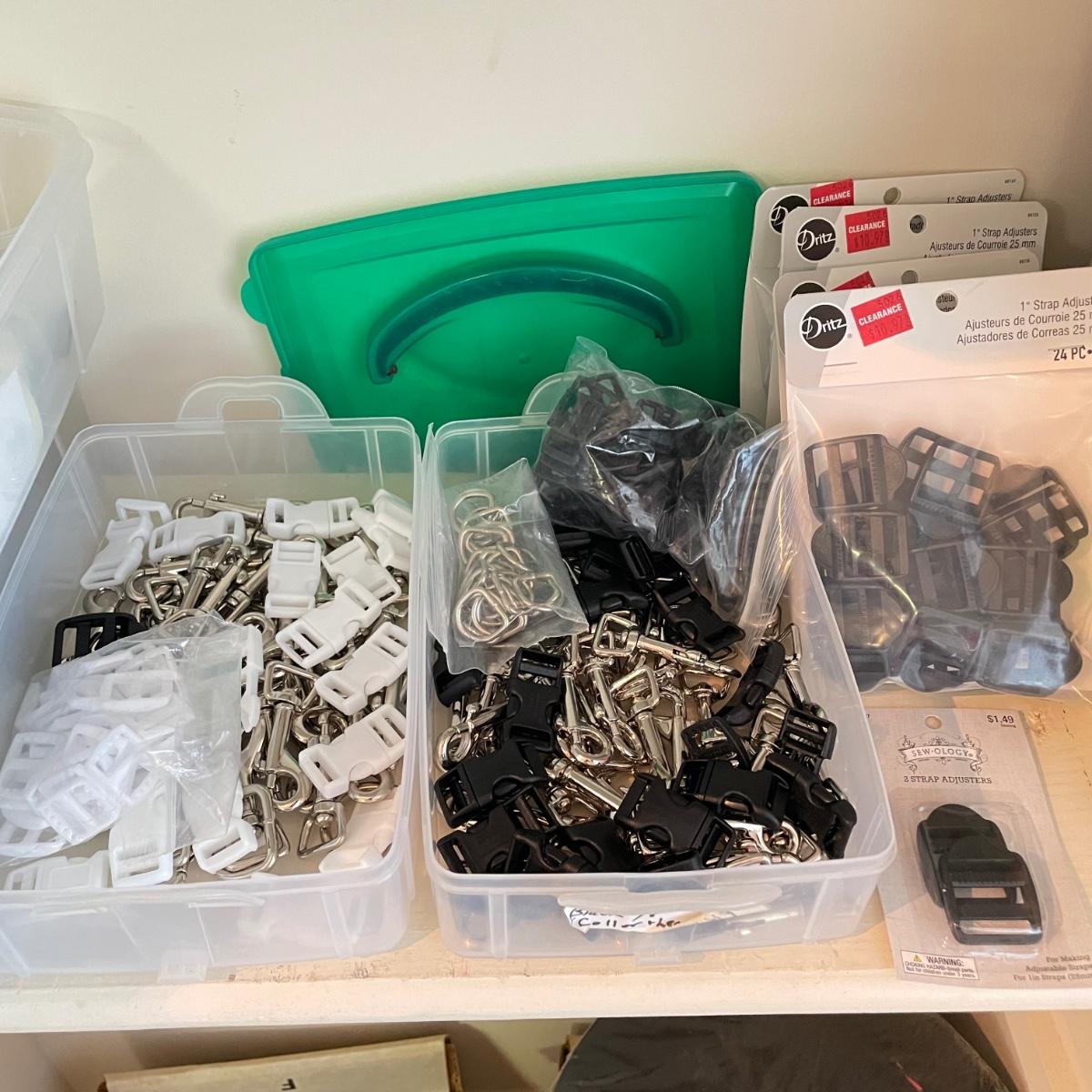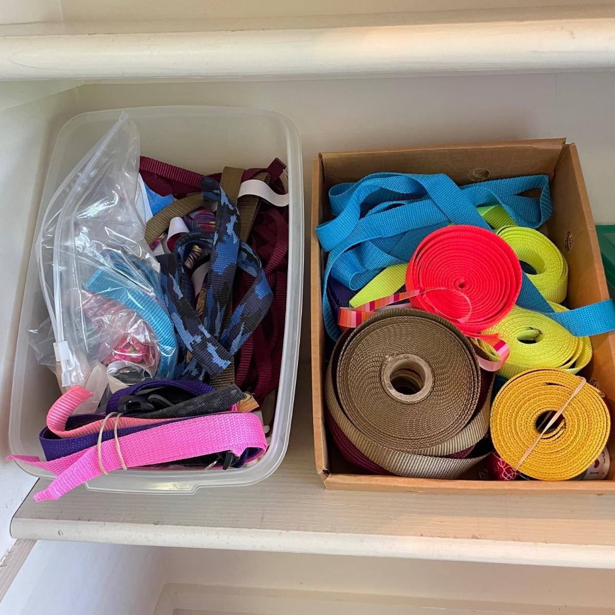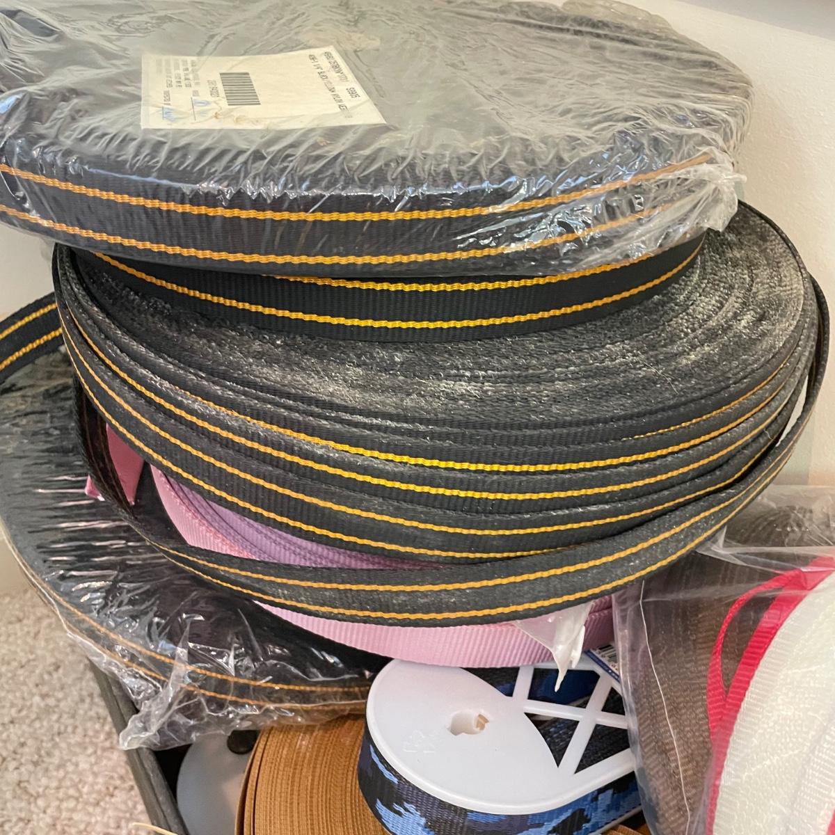 All the supplies needed to make a plethora of pet collars. Lot includes a huge variety of what appears to be mostly nylon ribbon (thick and thinner), plus decorative ribbon, metal D rings, attachment clips, buckles. Lot also has a pet craft magazine. Total inventory photo has a yard stick pictured for reference, it is not included in the lot. See images. Local pick up Only