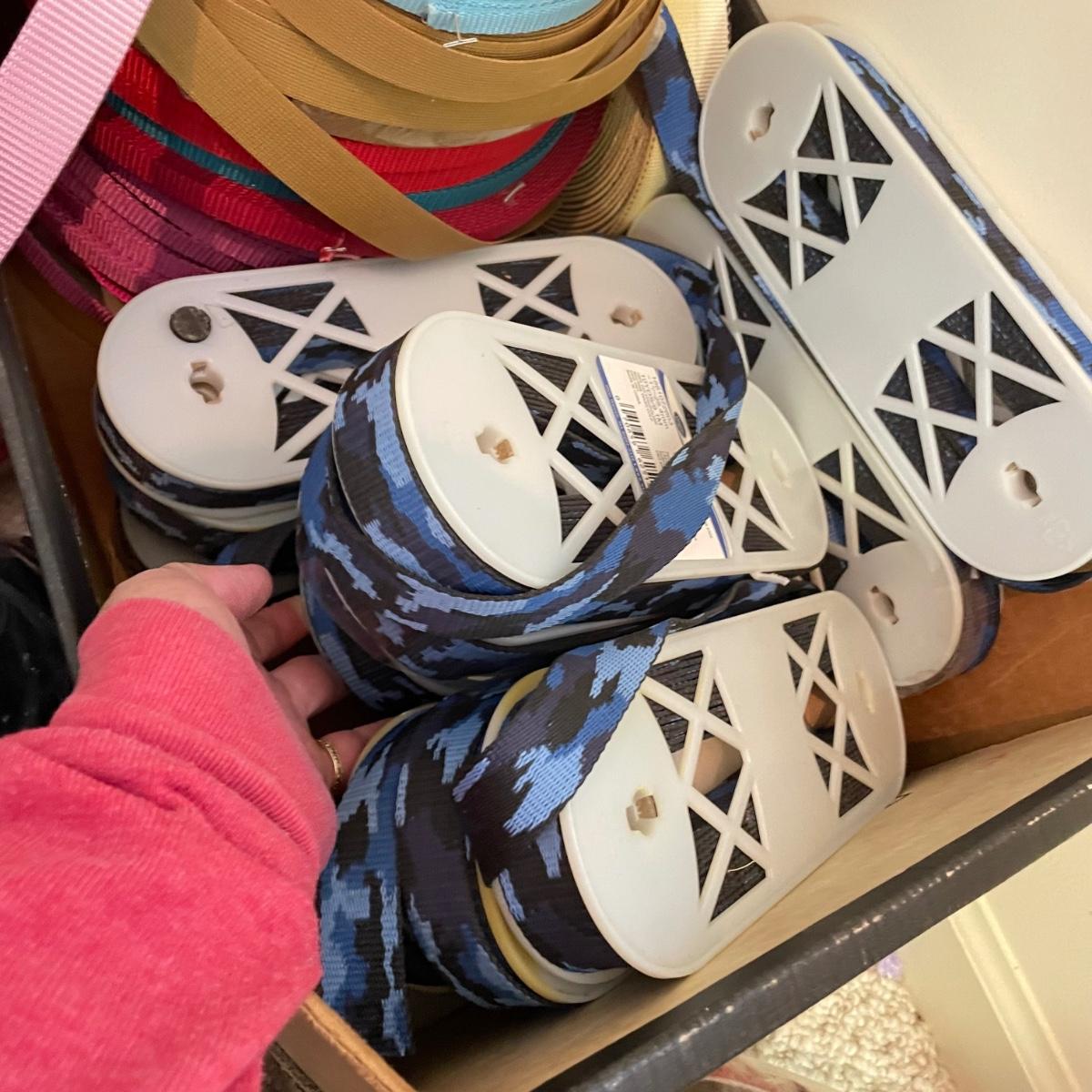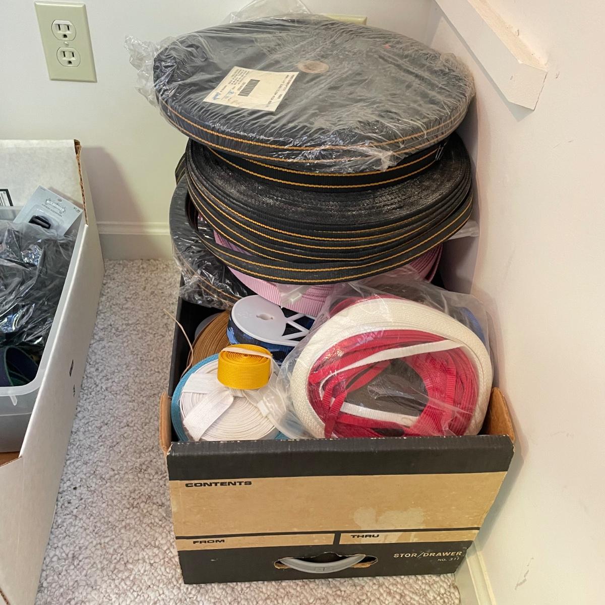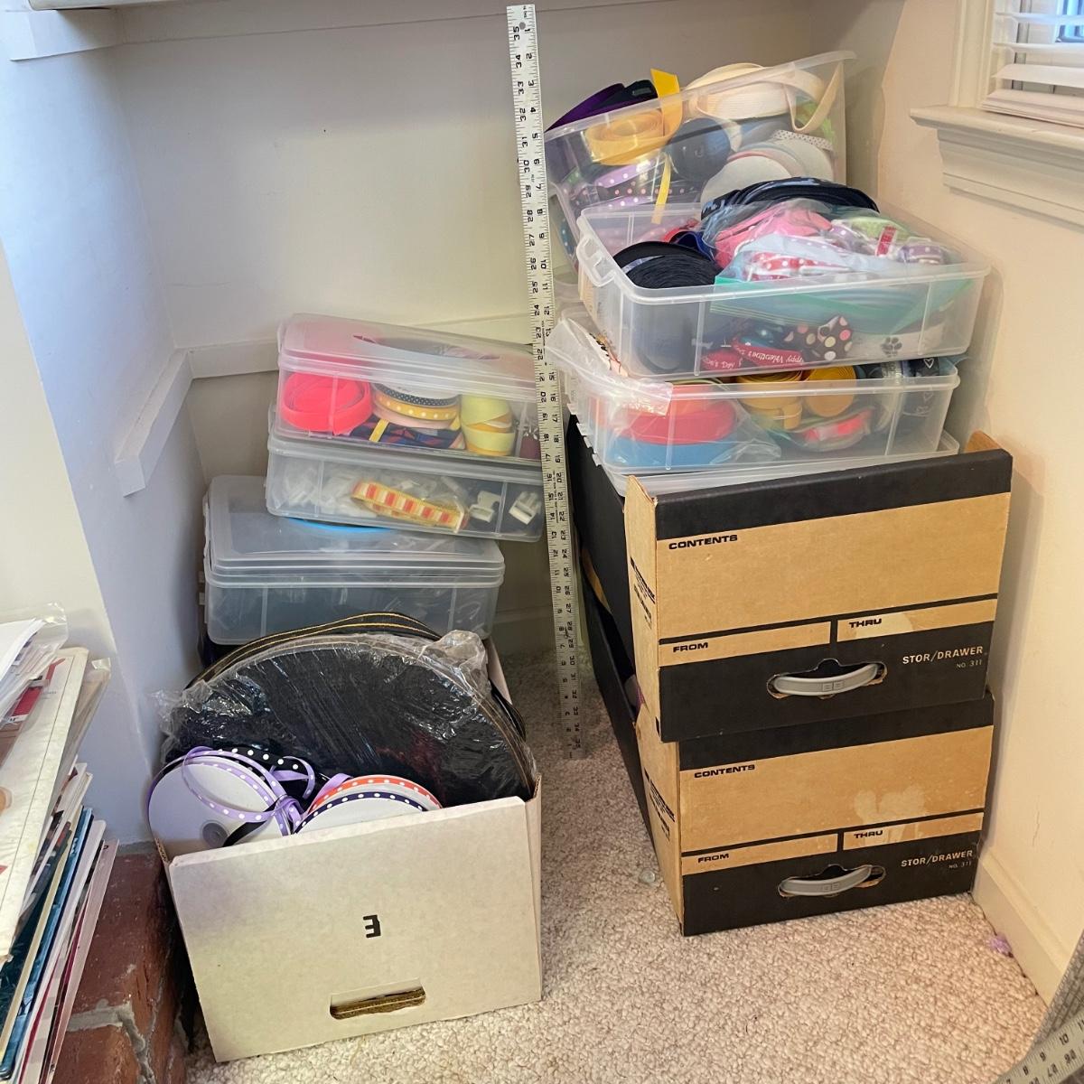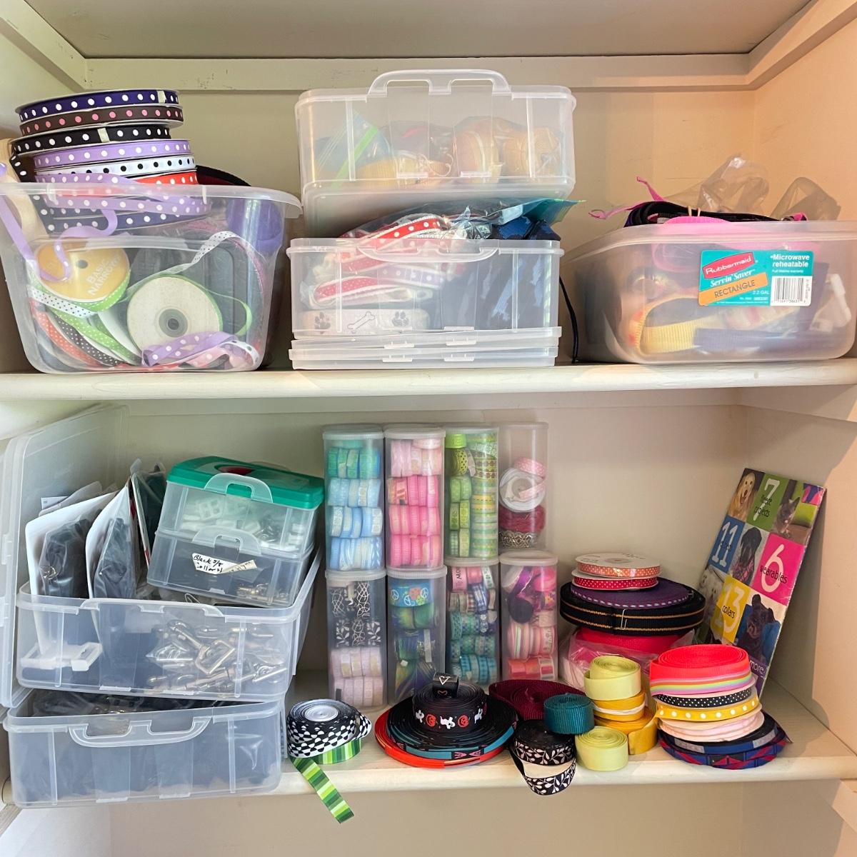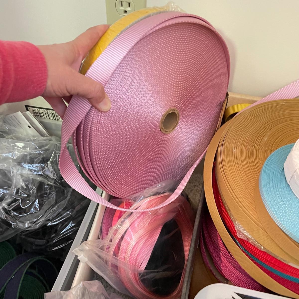 All the supplies needed to make a plethora of pet collars. Lot includes a huge variety of what appears to be mostly nylon ribbon (thick and thinner), plus decorative ribbon, metal D rings, attachment clips, buckles. Lot also has a pet craft magazine. Total inventory photo has a yard stick pictured for reference, it is not included in the lot. See images. Local pick up Only