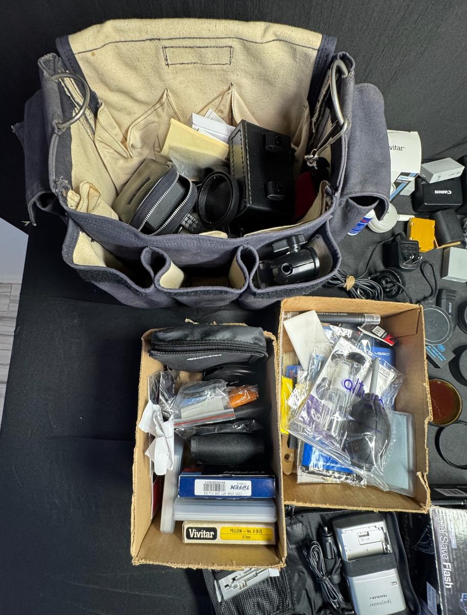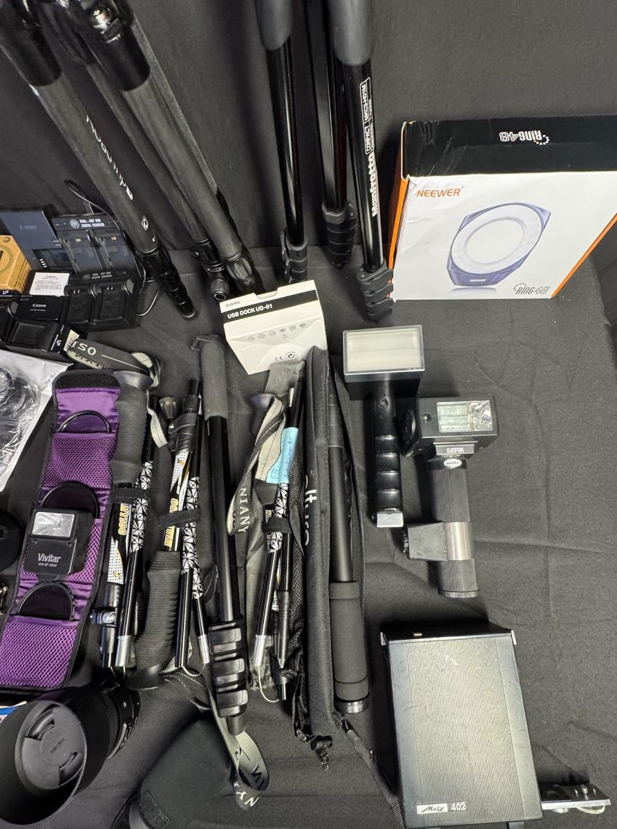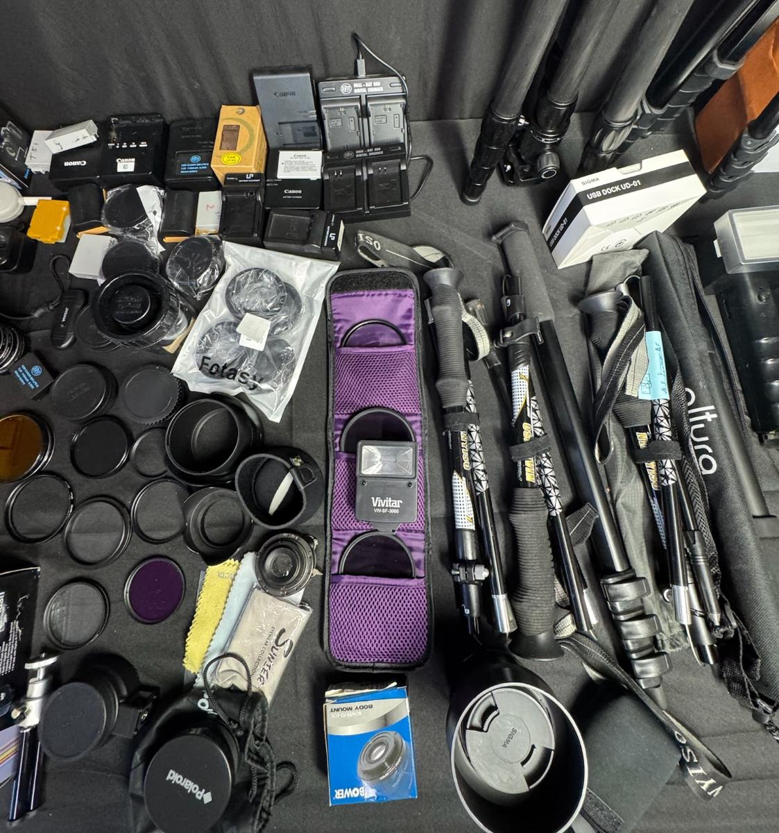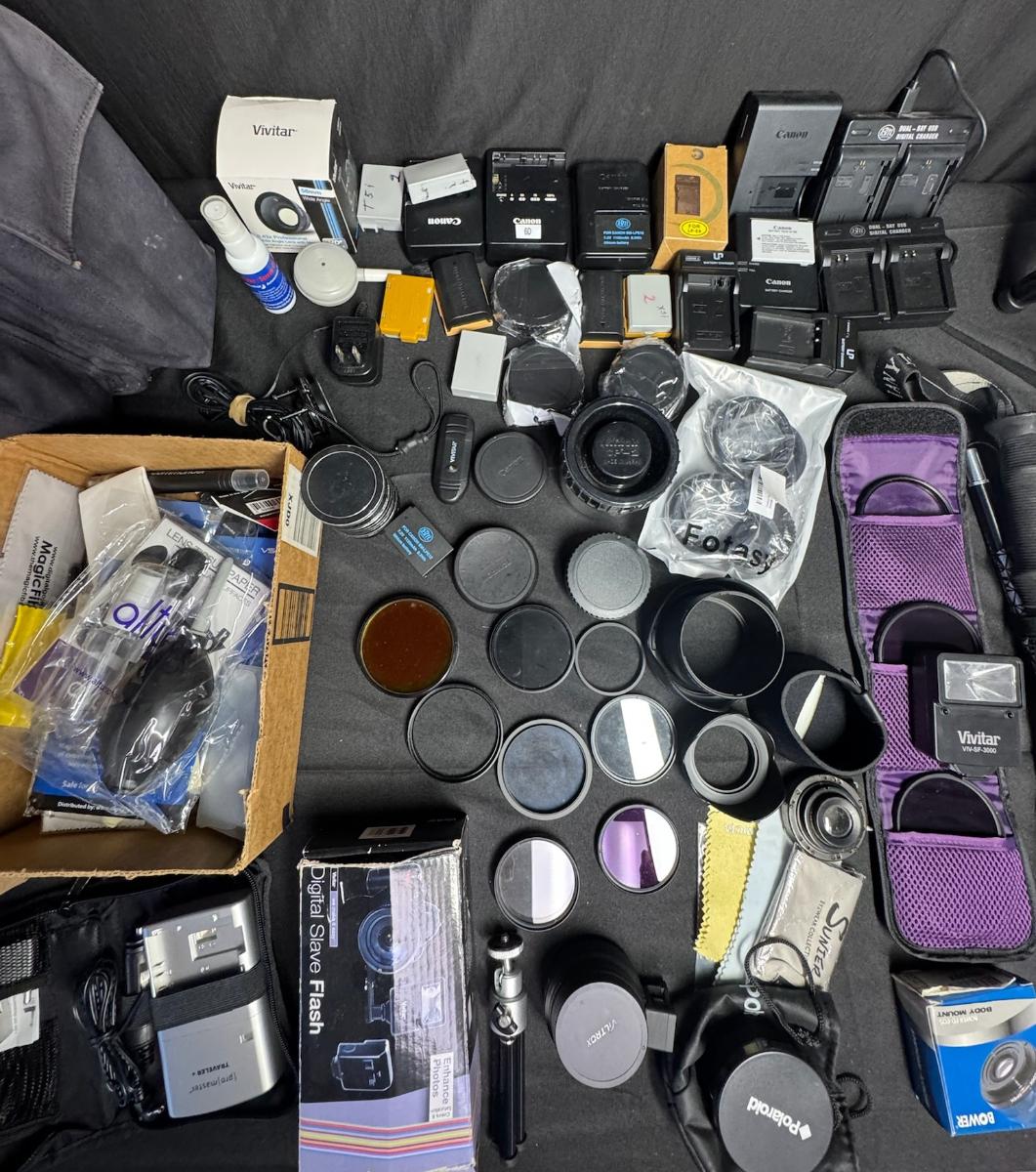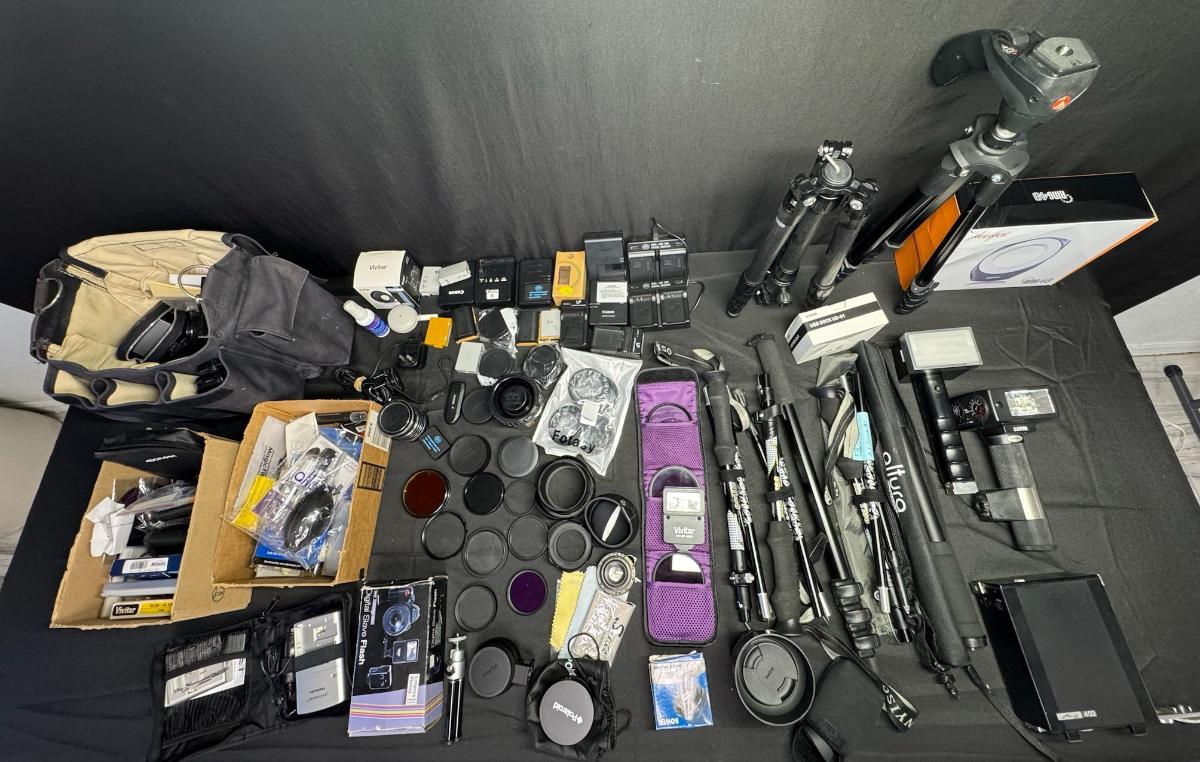 Includes lenses, tripods, batteries, chargers, filters, flashes, and more. Not tested. [JL]