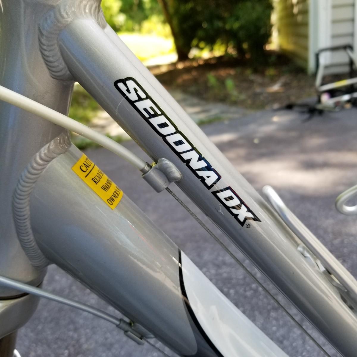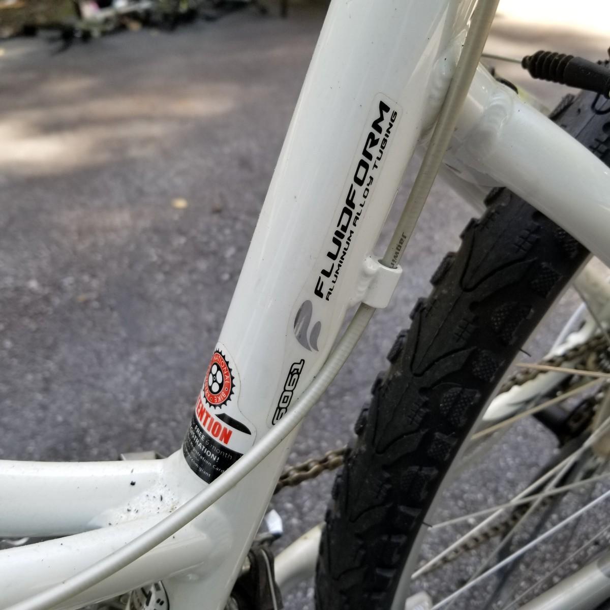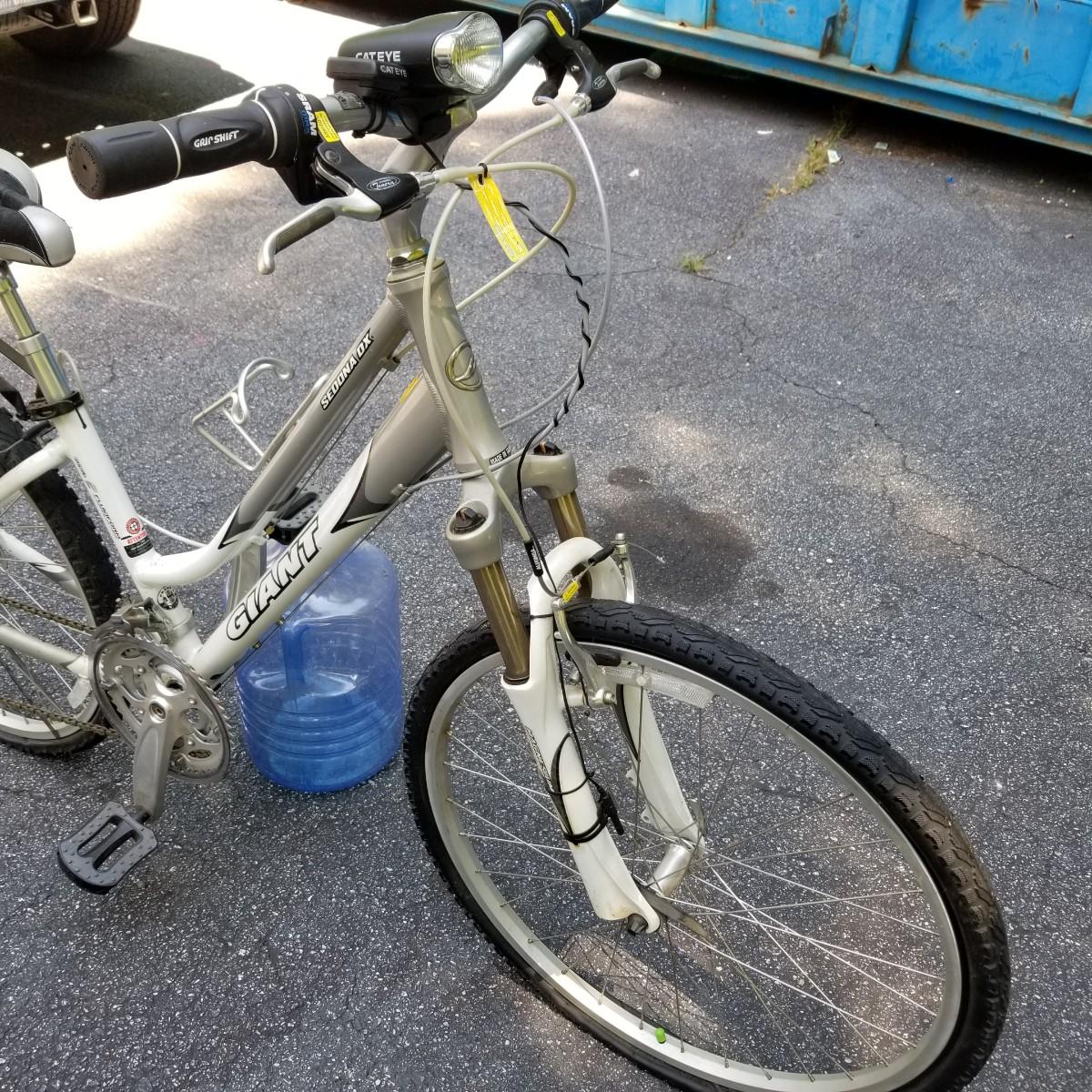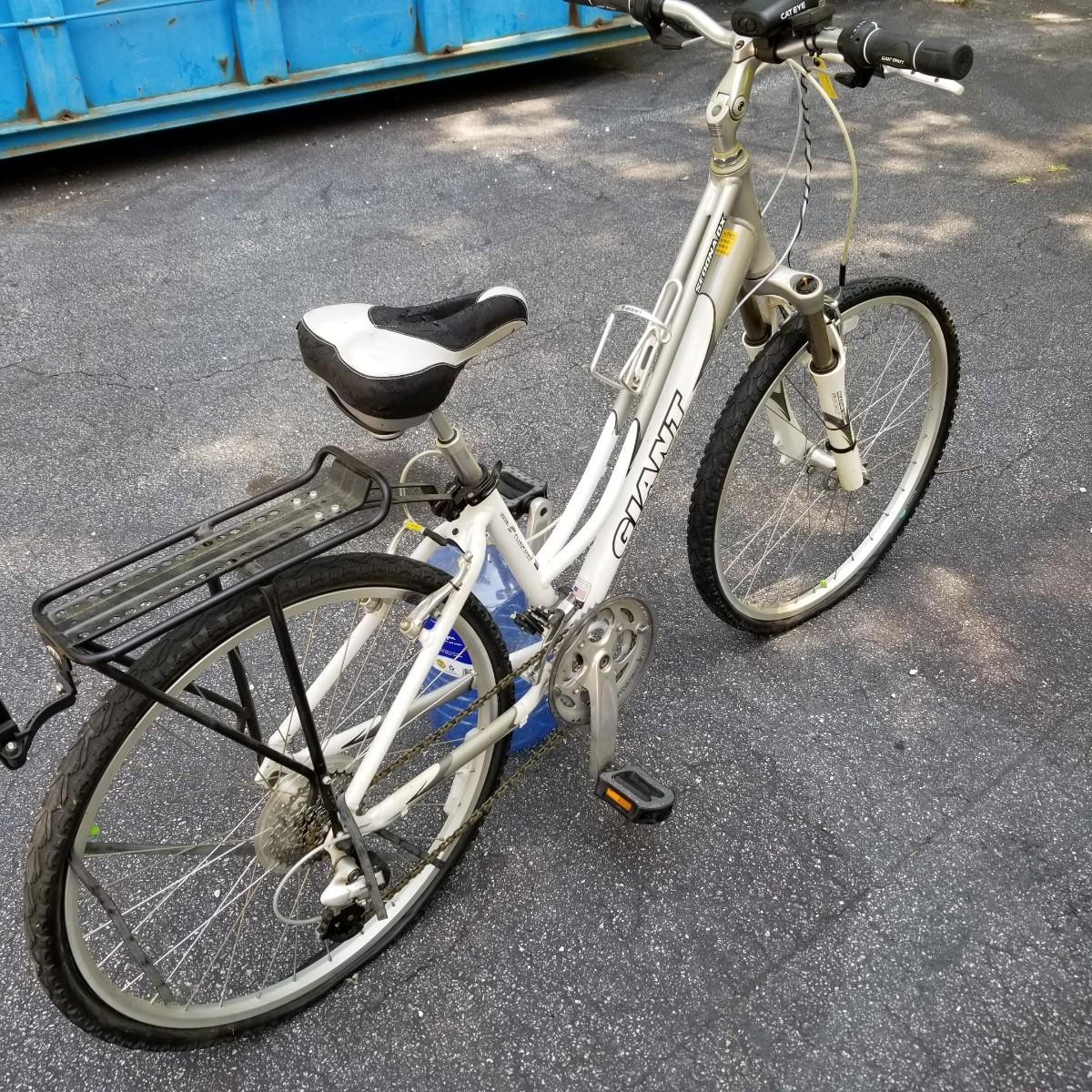 Giant Sedona DX 26" ladies bike. White aluminum frame with cushion shock front forks. Twenty-four speed Shimano Acera gear set, SRam handle shifters, Tektro brakes. Rear luggage rack, water bottle holder, Cateye speedometer that appears to need batteries as it would not power on and light. See photos for details. Local pickup only.