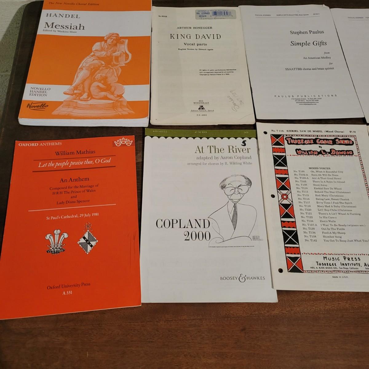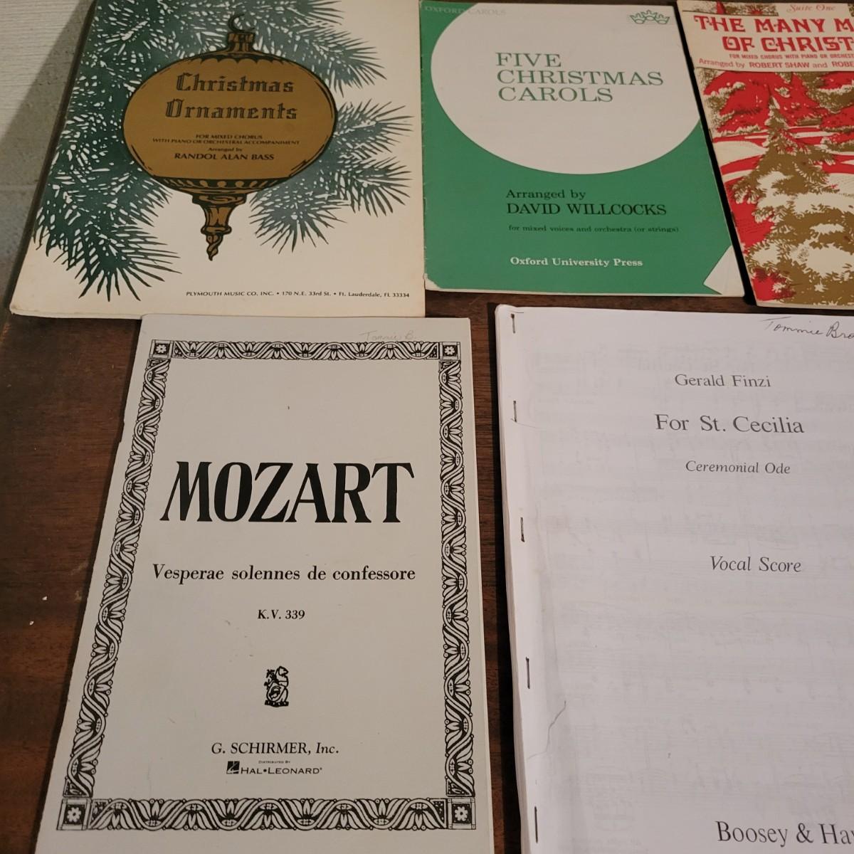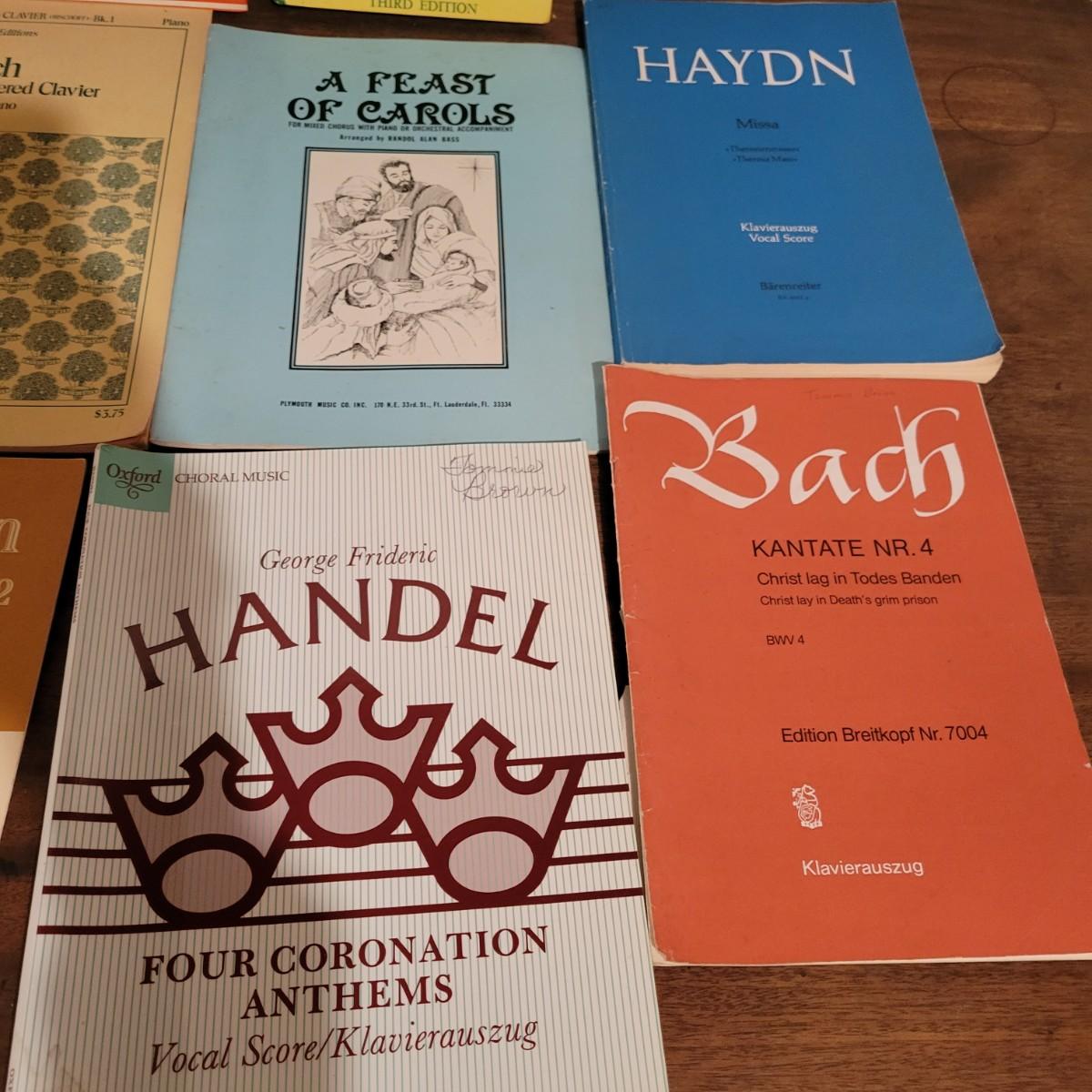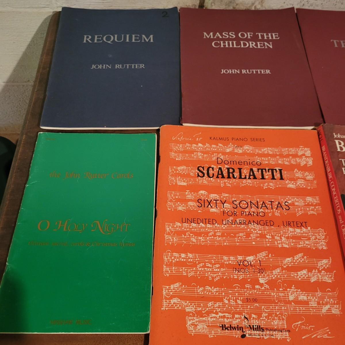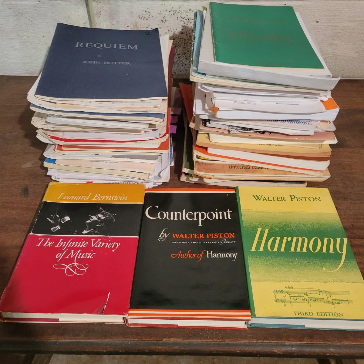A giant selection of piano and choral sheet music in good condition. There are a multitude of pieces that have notes and are highlighted. Too many scores to show everything in this collection that ranges from classical masters to Christmas pieces. A variety of formats from bound books to loose sheet music and also includes three hardback books. Local pickup only