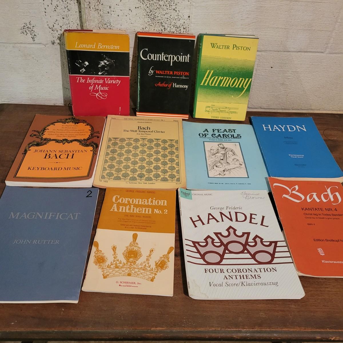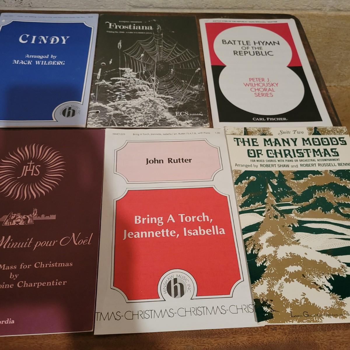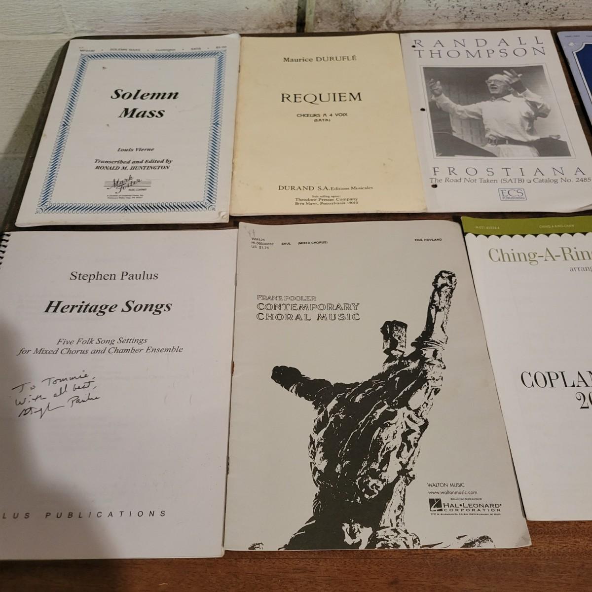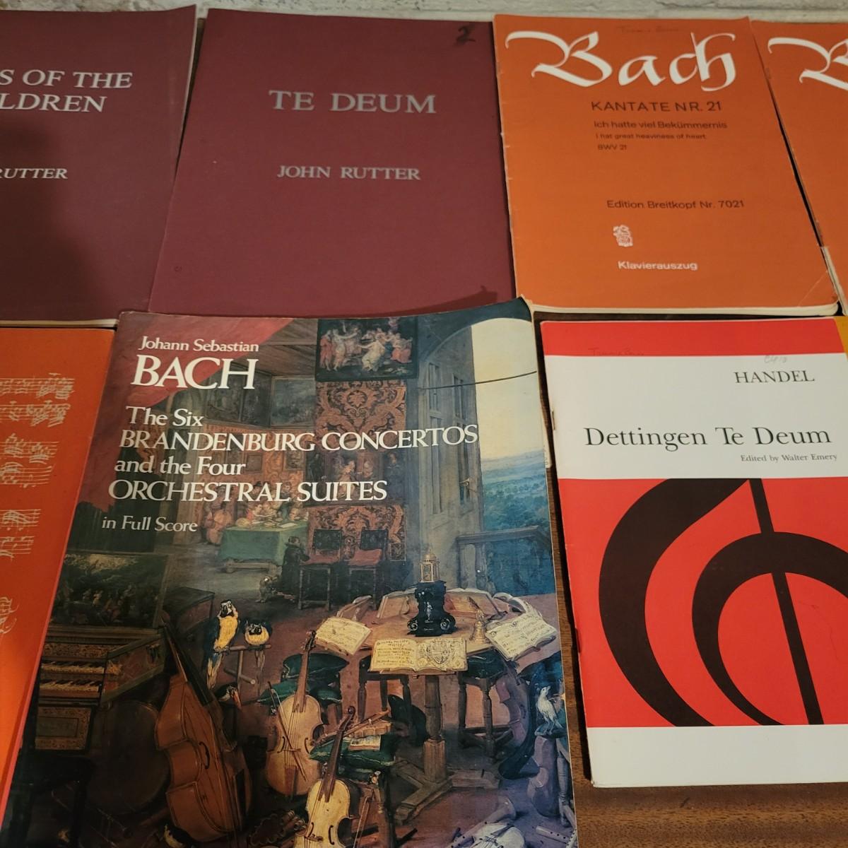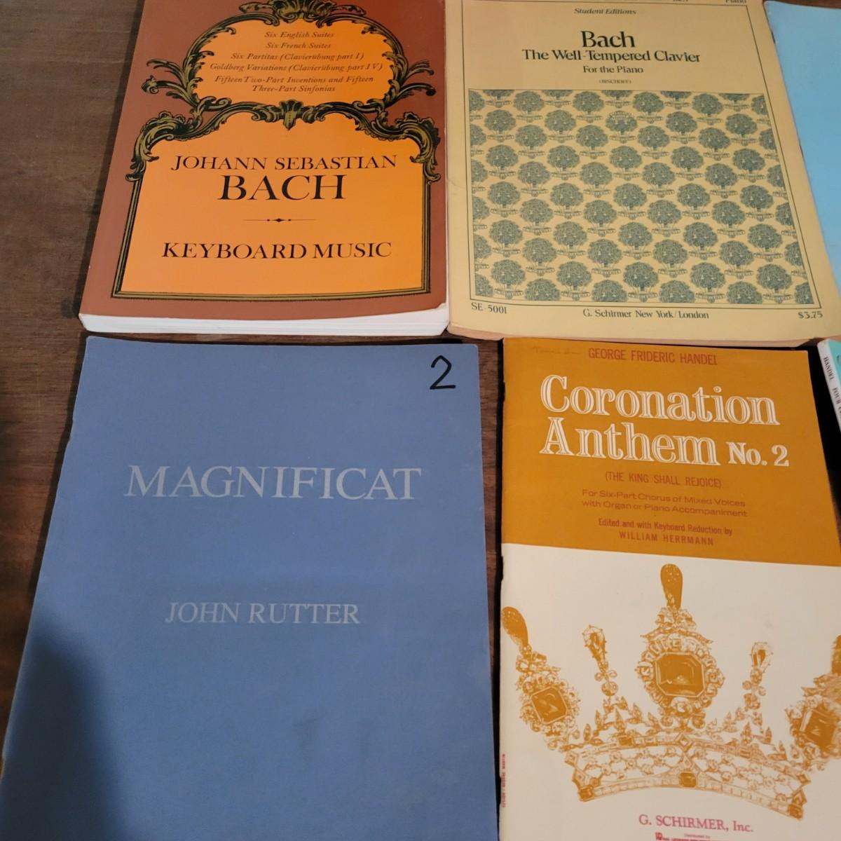 A giant selection of piano and choral sheet music in good condition. There are a multitude of pieces that have notes and are highlighted. Too many scores to show everything in this collection that ranges from classical masters to Christmas pieces. A variety of formats from bound books to loose sheet music and also includes three hardback books. Local pickup only