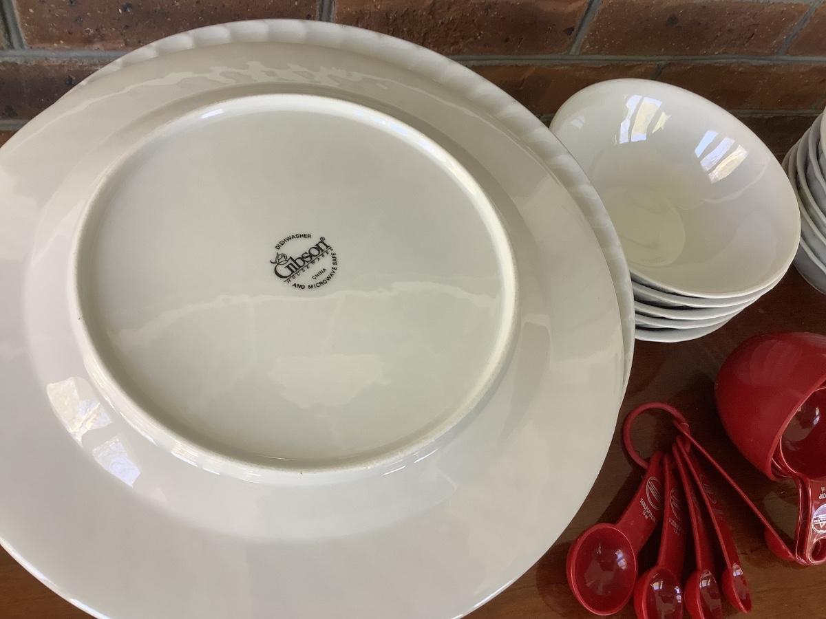 Gibson dinnerware 12 salad/dessert plates, 10 bowls, 12 plates, measuring spoons/cups