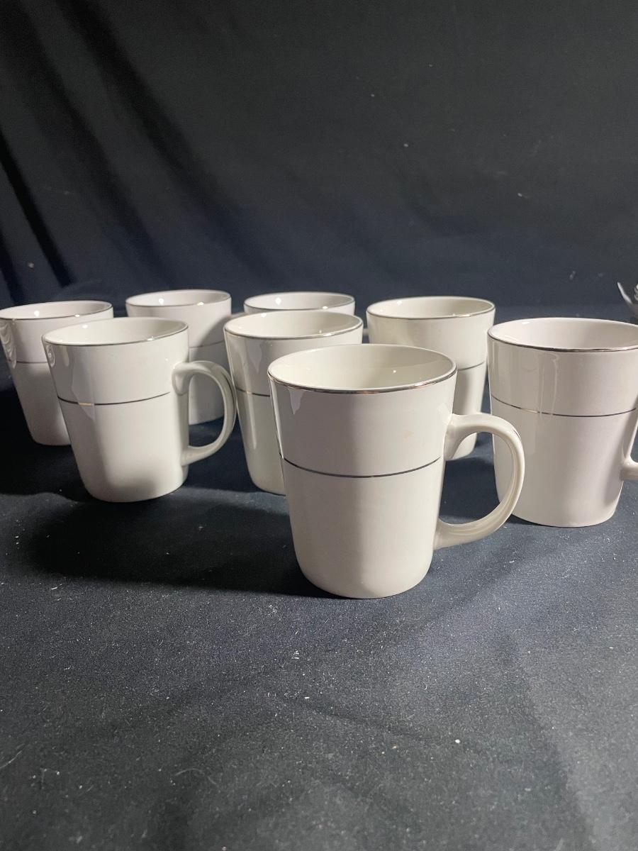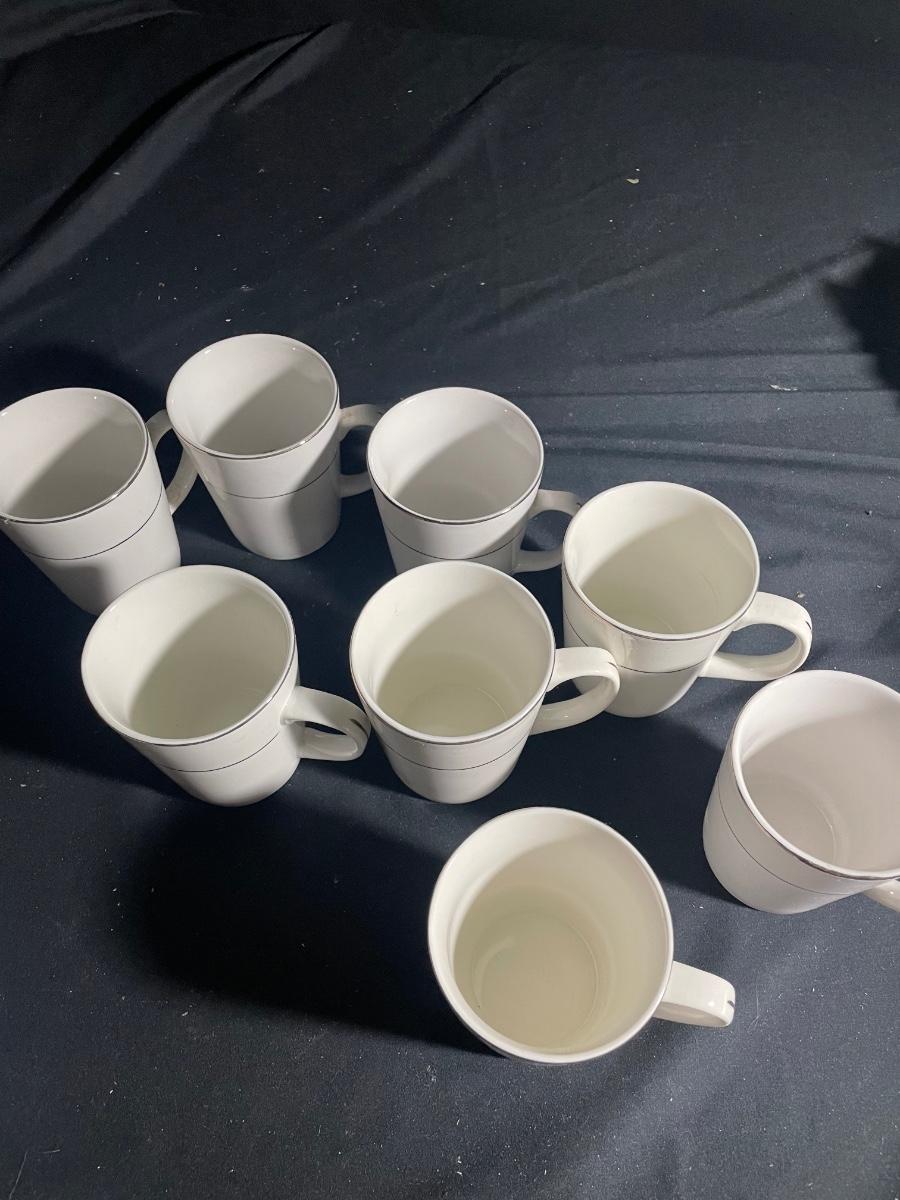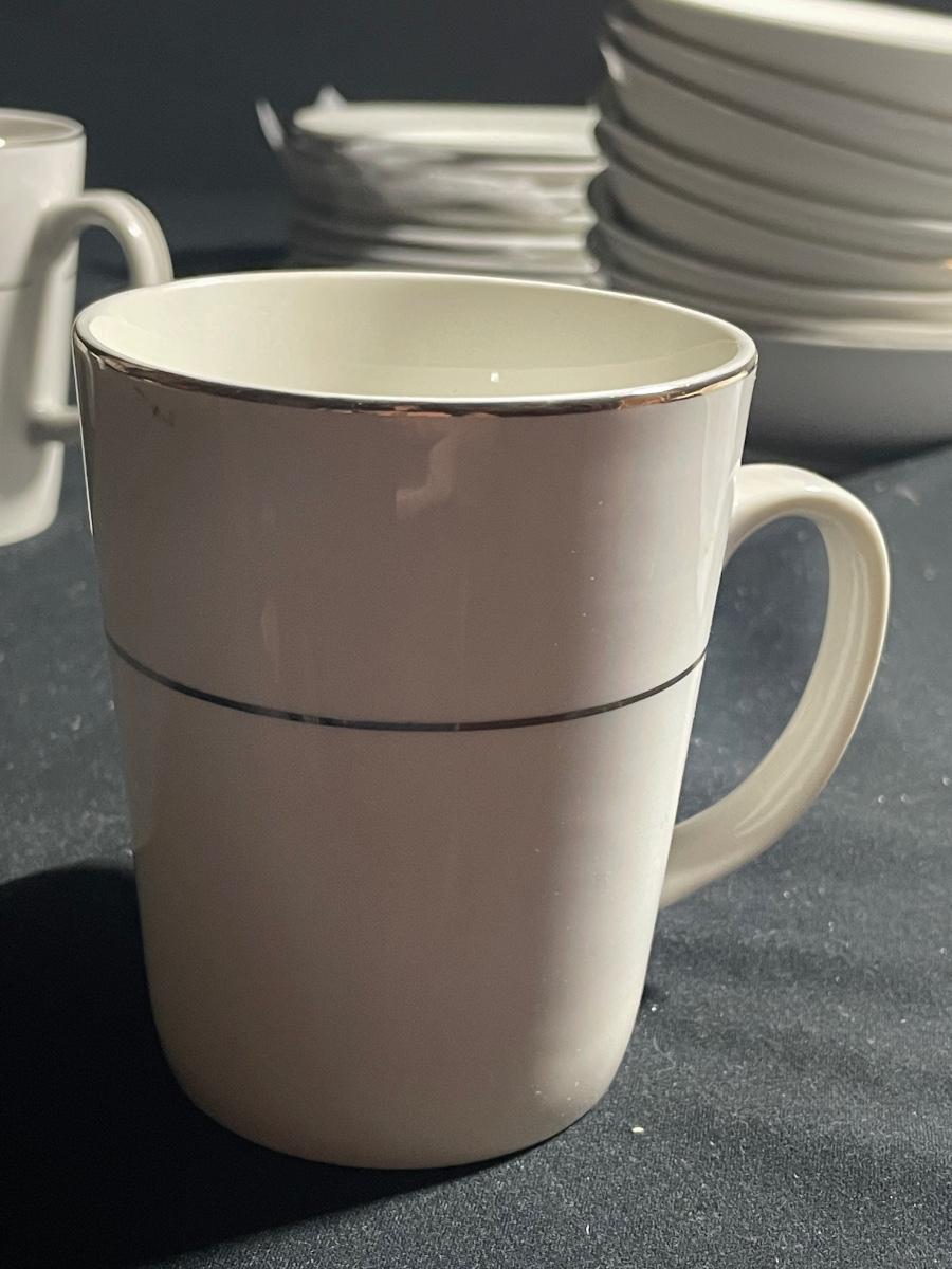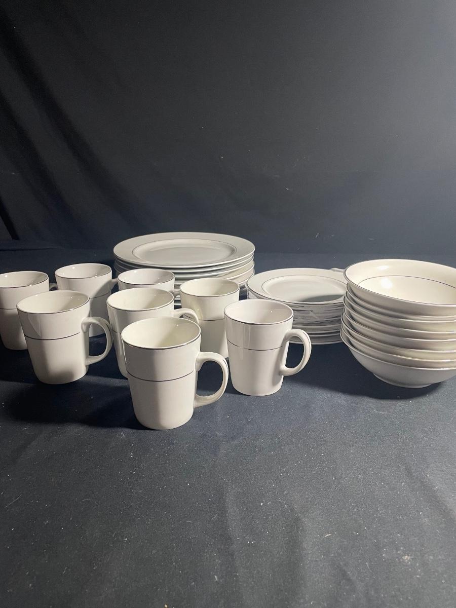 This elegant white with silver rims China dinnerware set by Gibson is an 8 person setting. 8 of everything - dinner plates (10.5”), side plates, bowls and cups. Set is in excellent condition with no cracks or chips.
