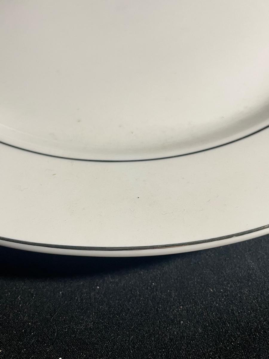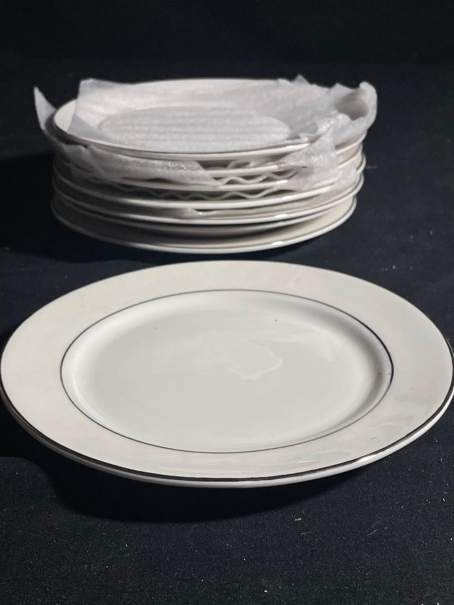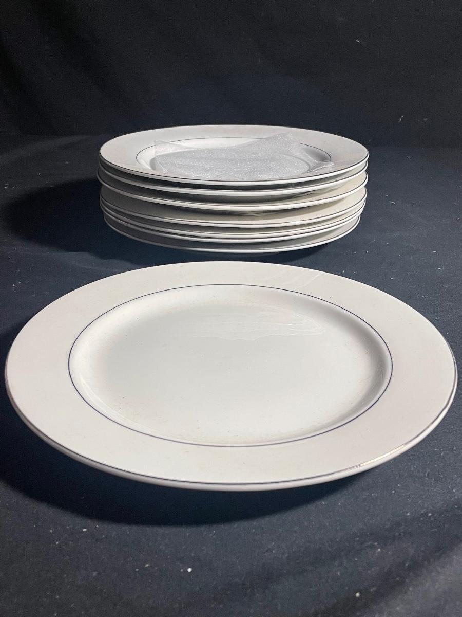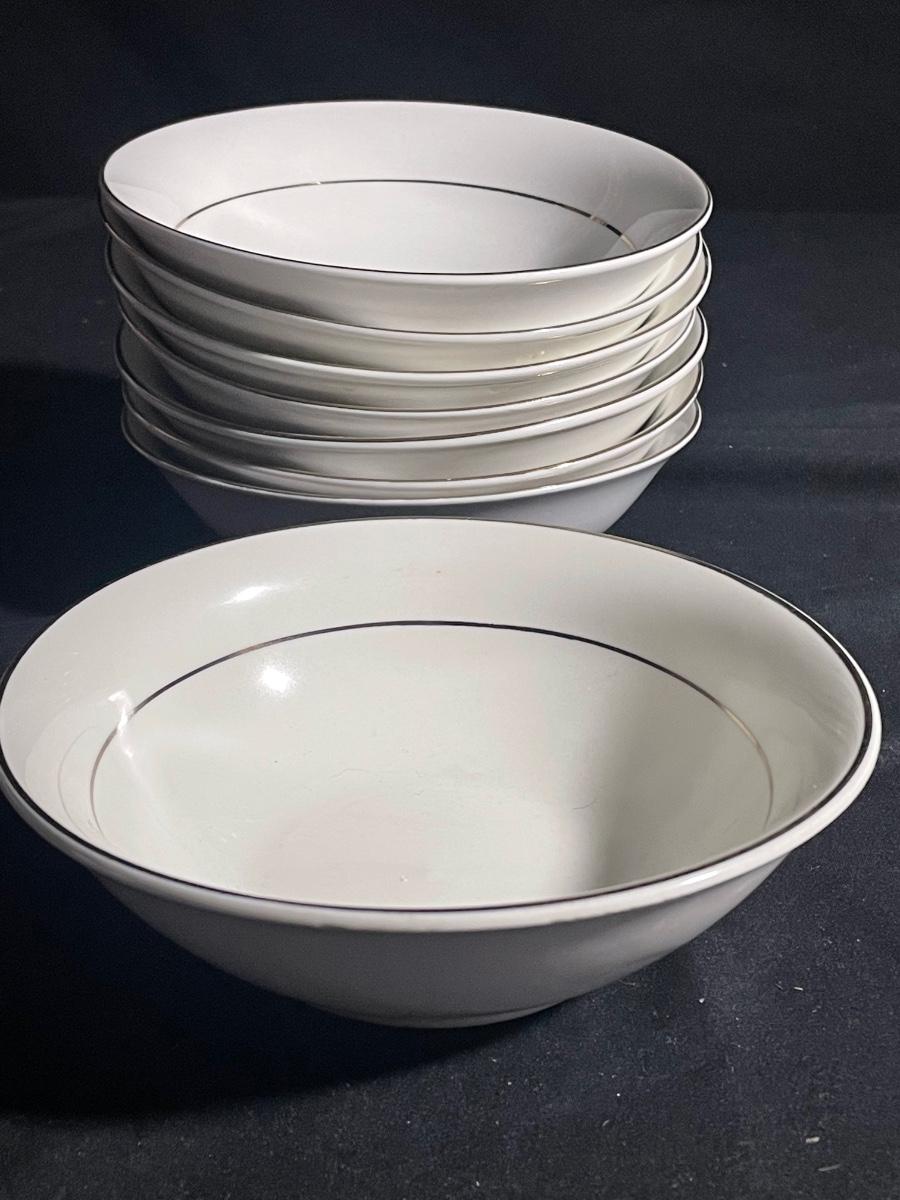 This elegant white with silver rims China dinnerware set by Gibson is an 8 person setting. 8 of everything - dinner plates (10.5”), side plates, bowls and cups. Set is in excellent condition with no cracks or chips.