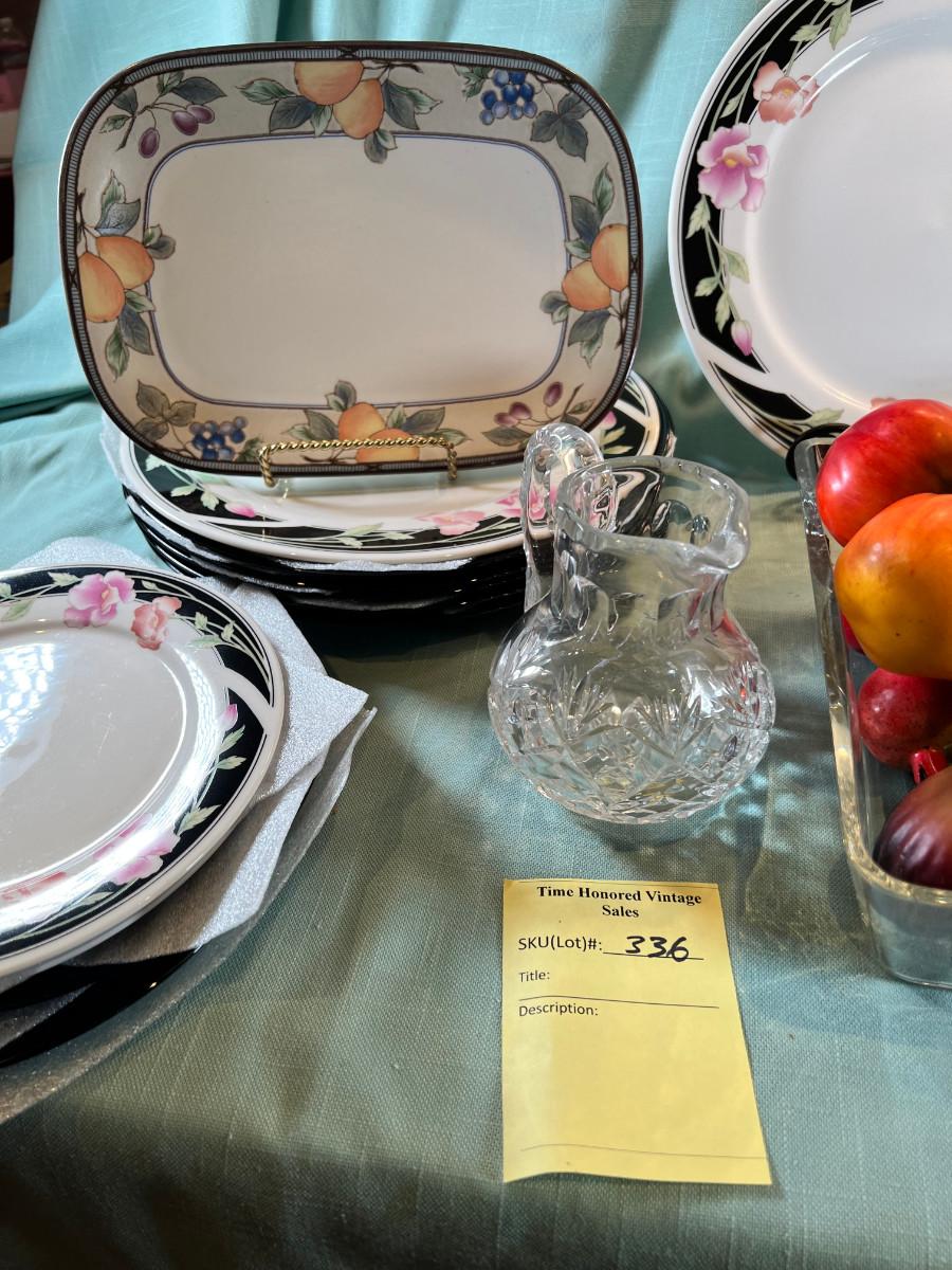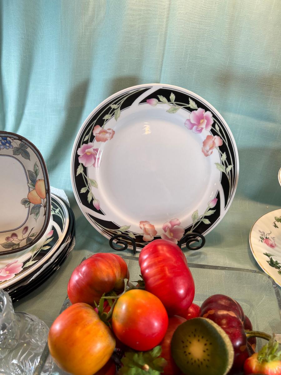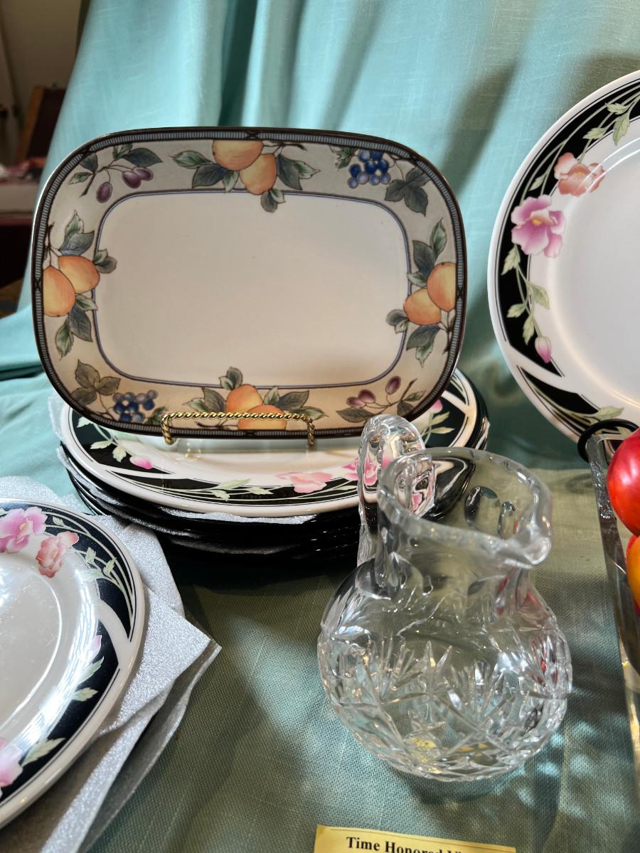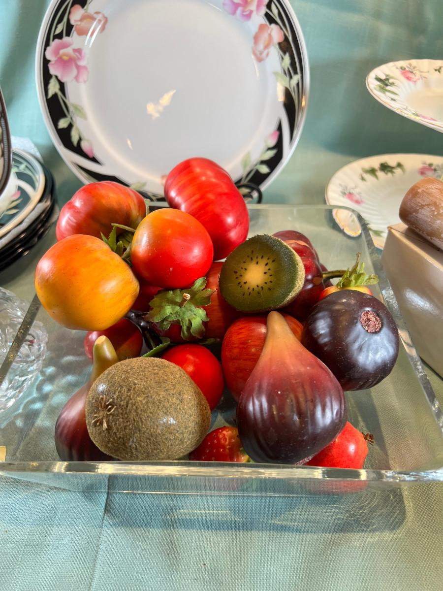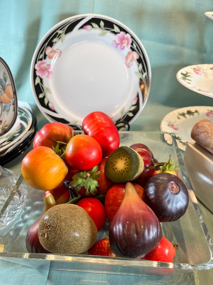 Gibson Floral dinner plates, regency bone china triple desert plate, Glass bowl with fruit. Vintage cut glass pitcher, thick glass bowl with faux fruit, plate with lemons, White ceramic utensils cylinder." Pop vase" paper flower portable vase, 2 new beeswax candle tapers,
