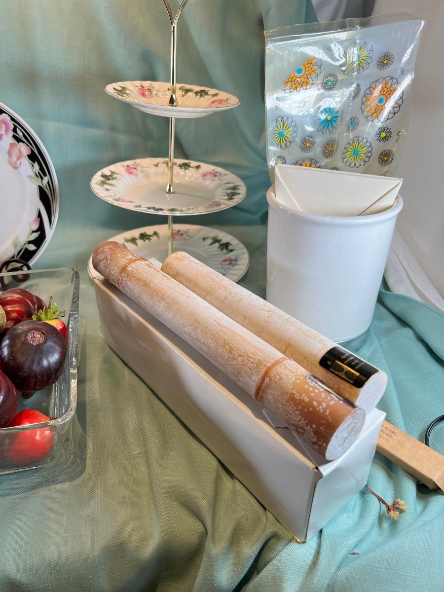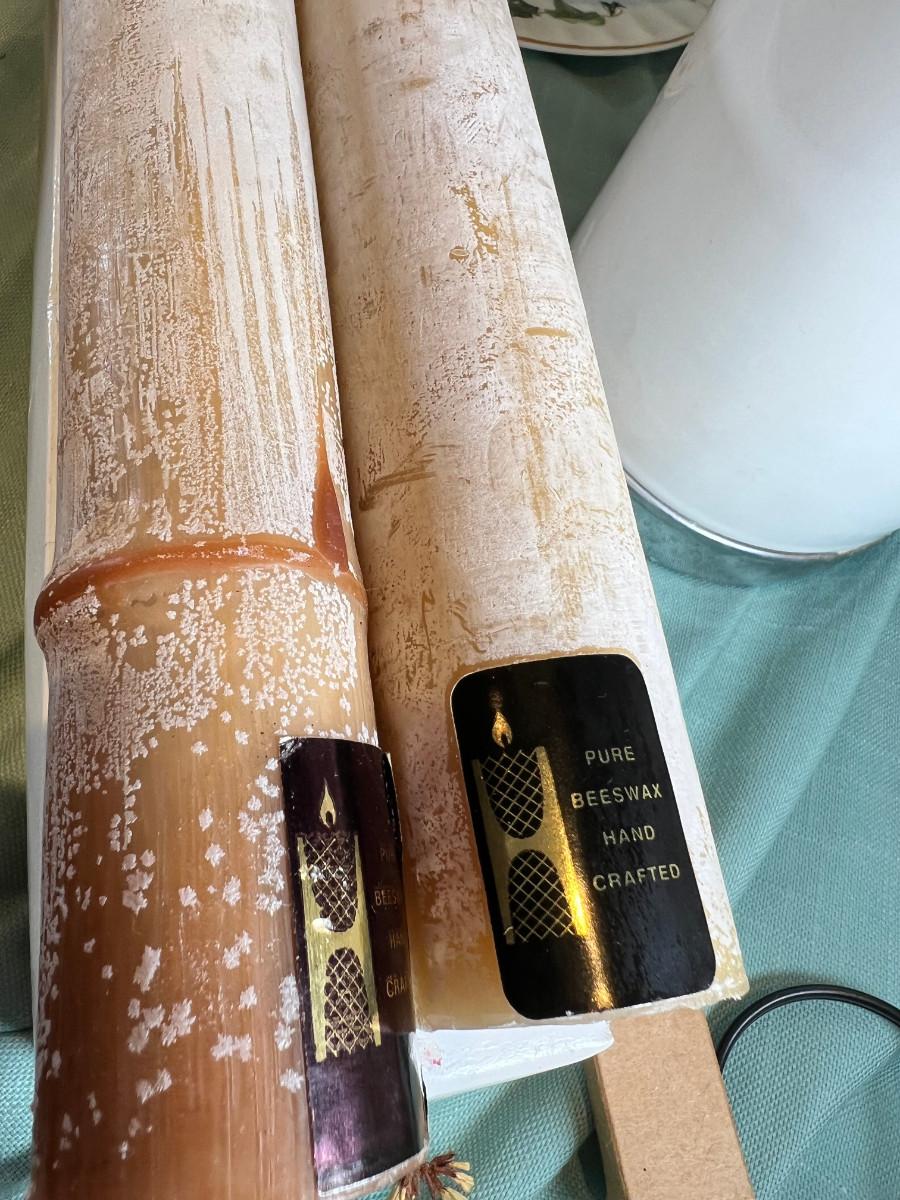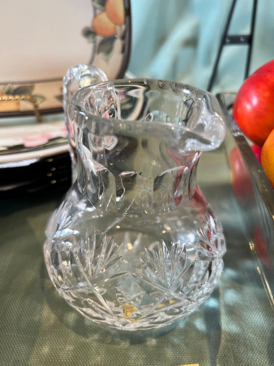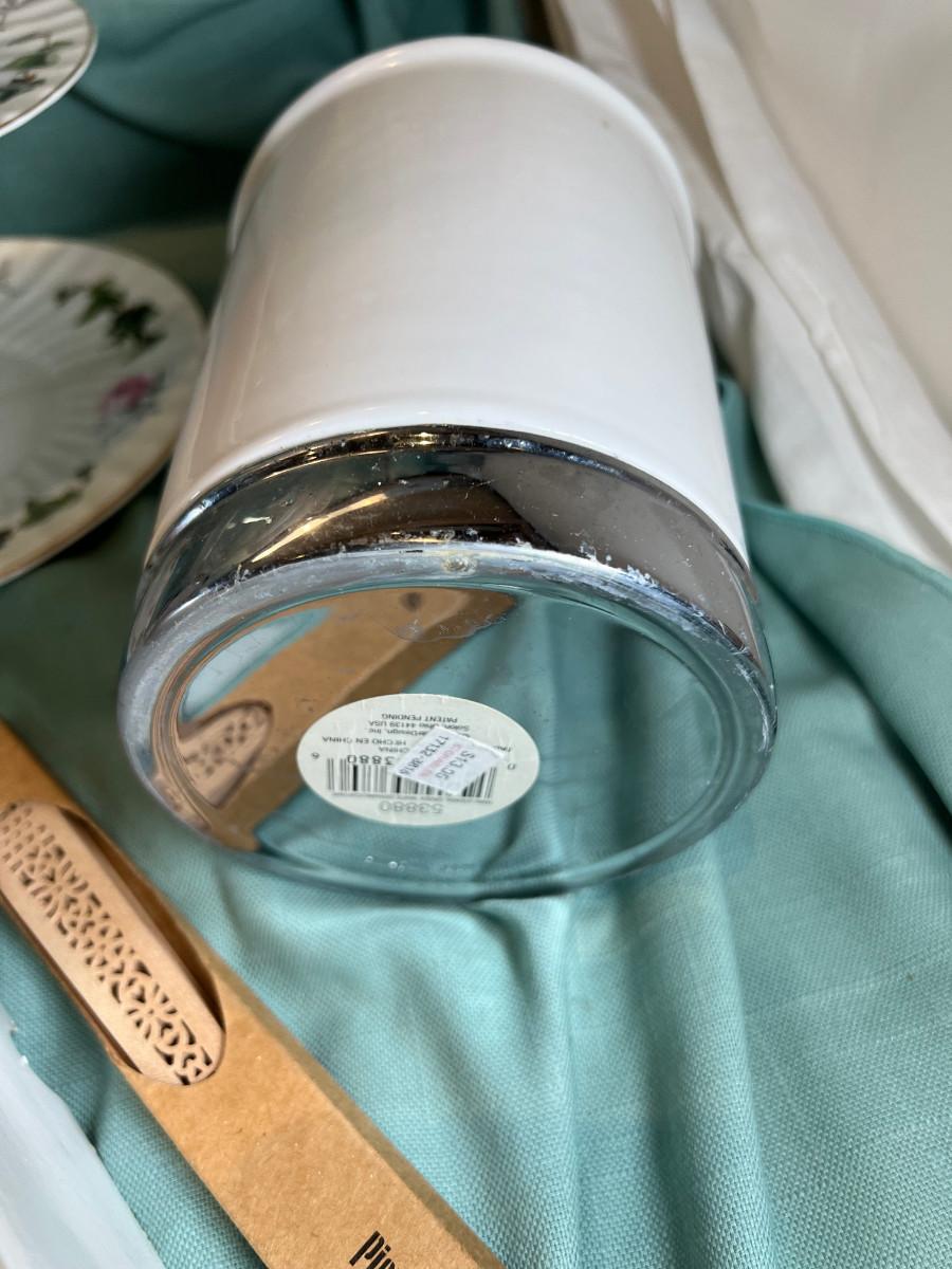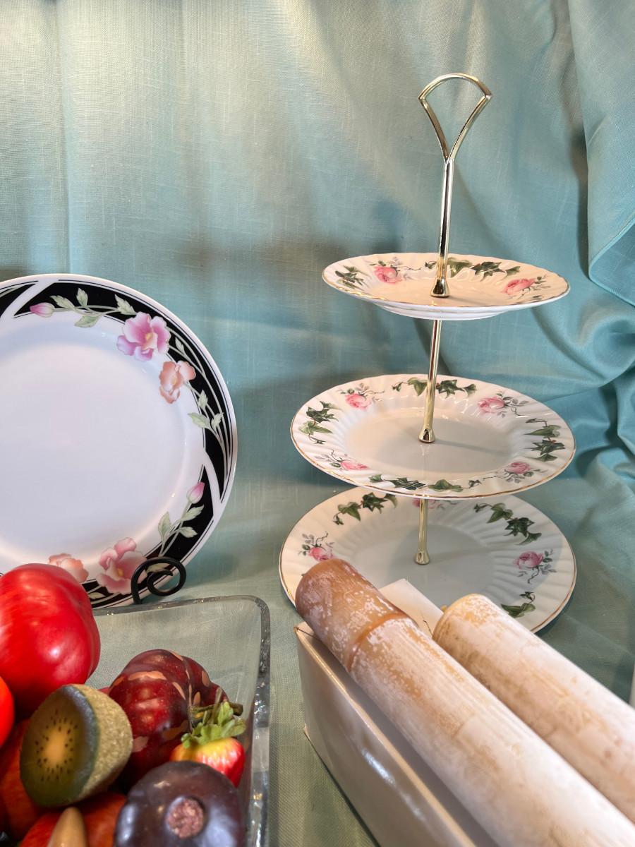Gibson Floral dinner plates, regency bone china triple desert plate, Glass bowl with fruit. Vintage cut glass pitcher, thick glass bowl with faux fruit, plate with lemons, White ceramic utensils cylinder." Pop vase" paper flower portable vase, 2 new beeswax candle tapers,