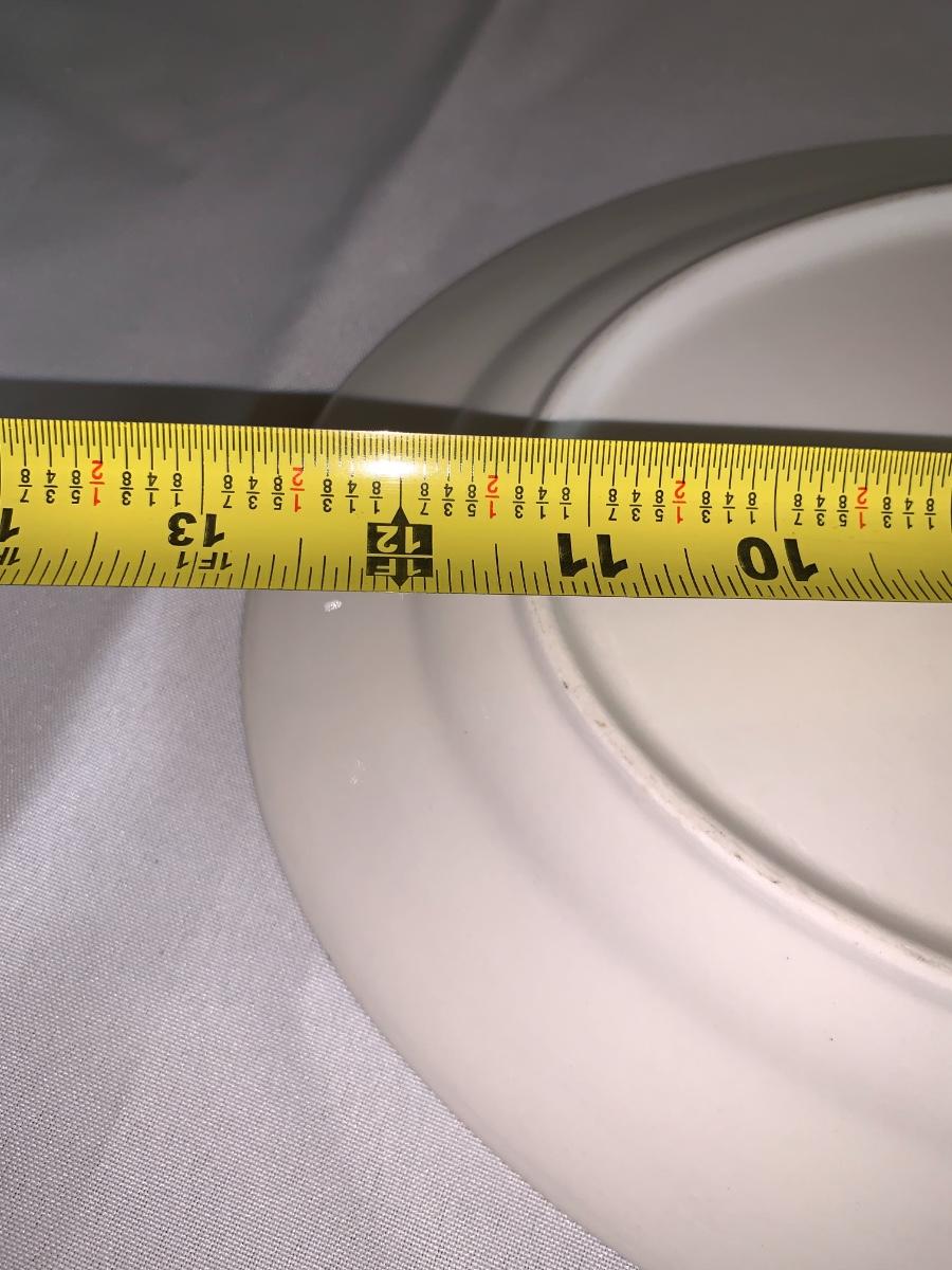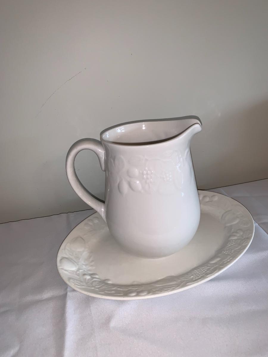 Set of pitcher and platter with a fruit design border on both. Pitcher is 8" high , platter is 13" diameter