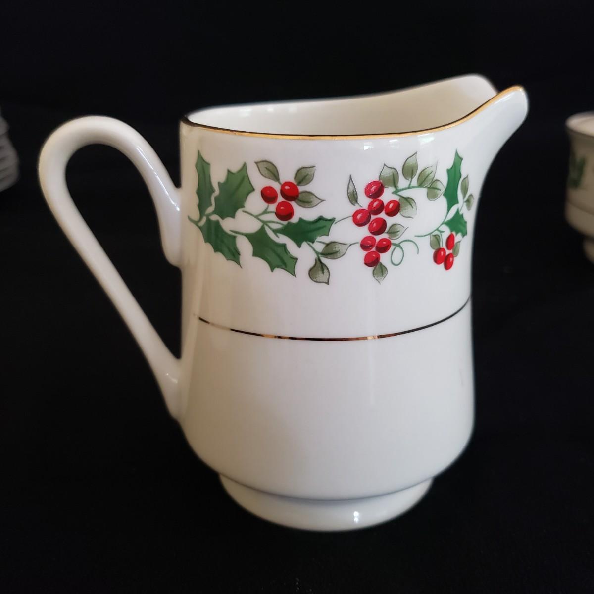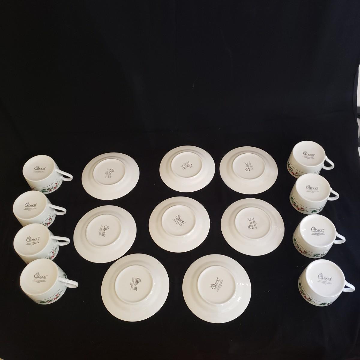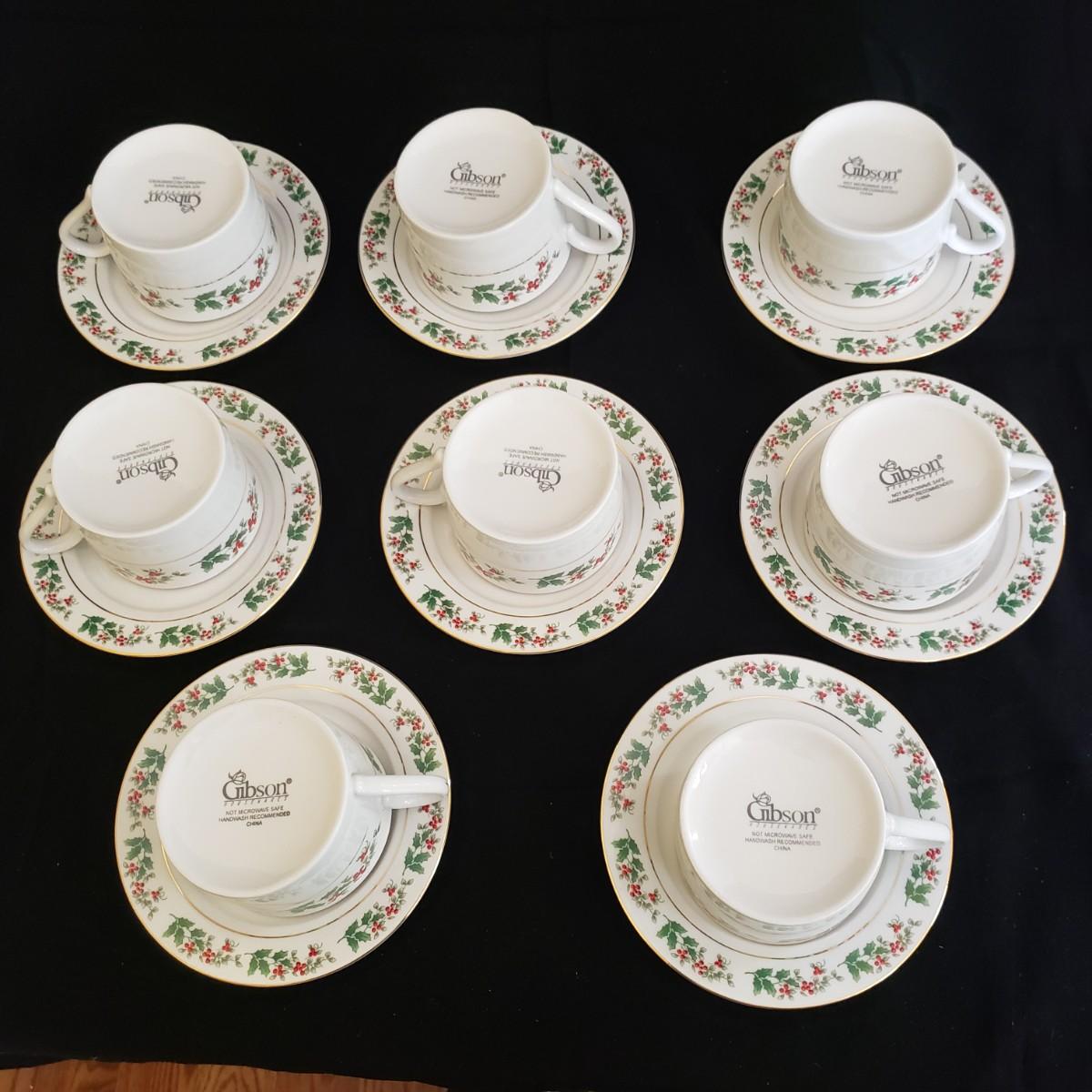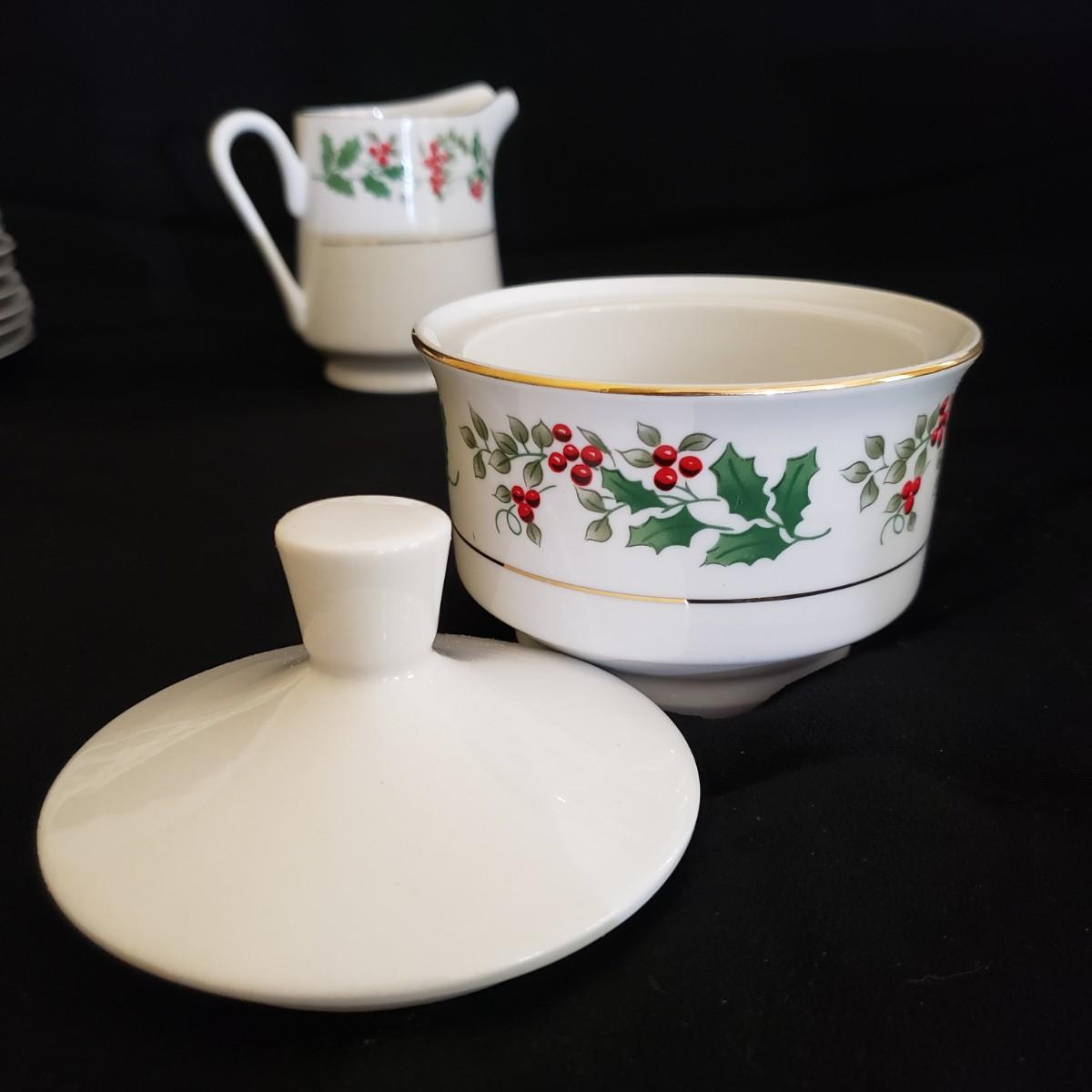 This lot features Gibson housewares vintage Christmas Charm China. There is one large bowl approximately 9", one cream and sugar bowl, eight bowls approximately 8", eight plates approximately 8", one 12" plate, eight saucers with matching cups, and eight large plates approximately 10".
