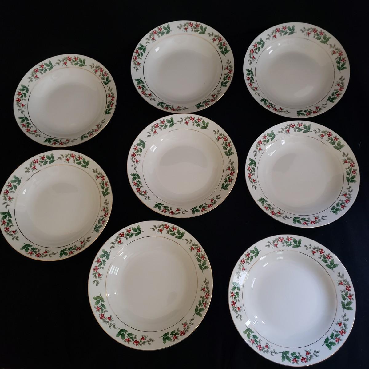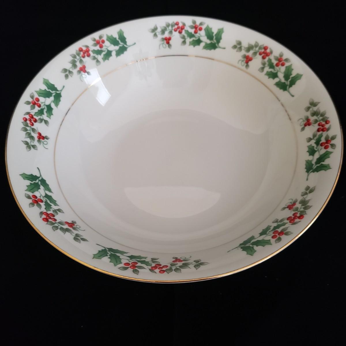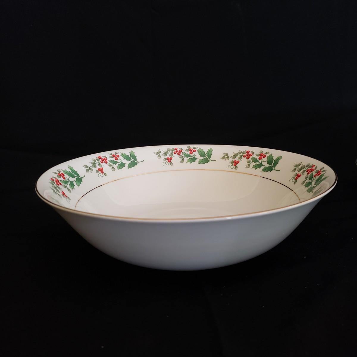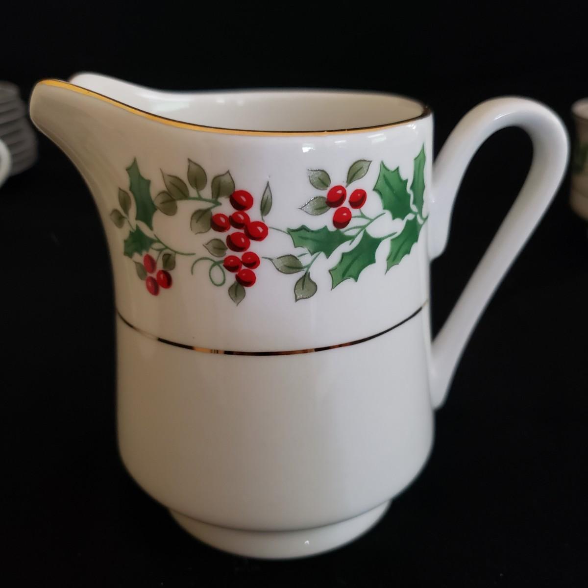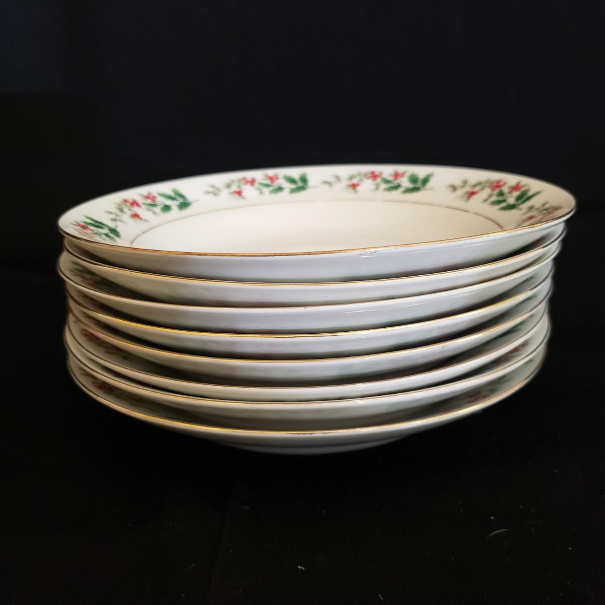 This lot features Gibson housewares vintage Christmas Charm China. There is one large bowl approximately 9", one cream and sugar bowl, eight bowls approximately 8", eight plates approximately 8", one 12" plate, eight saucers with matching cups, and eight large plates approximately 10".