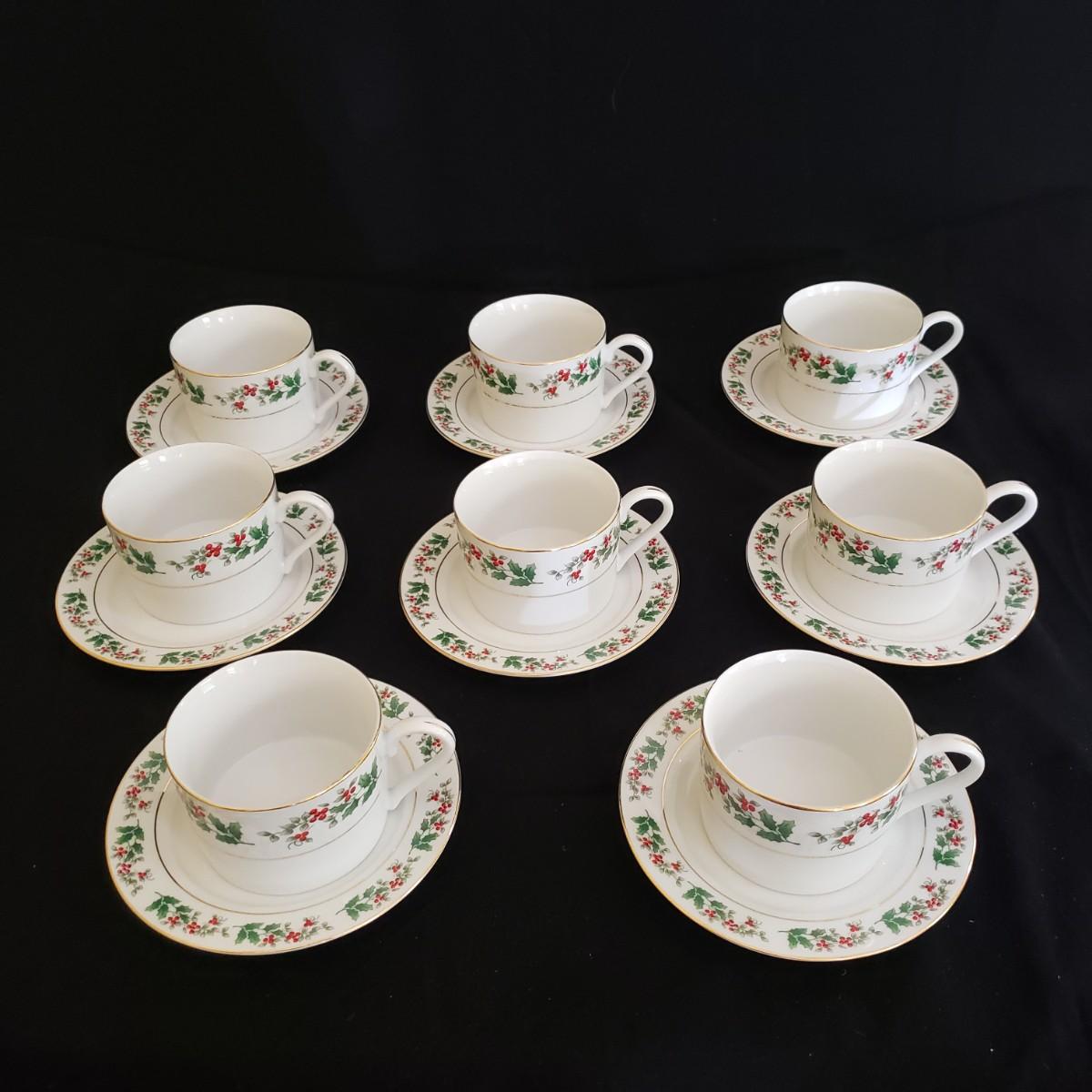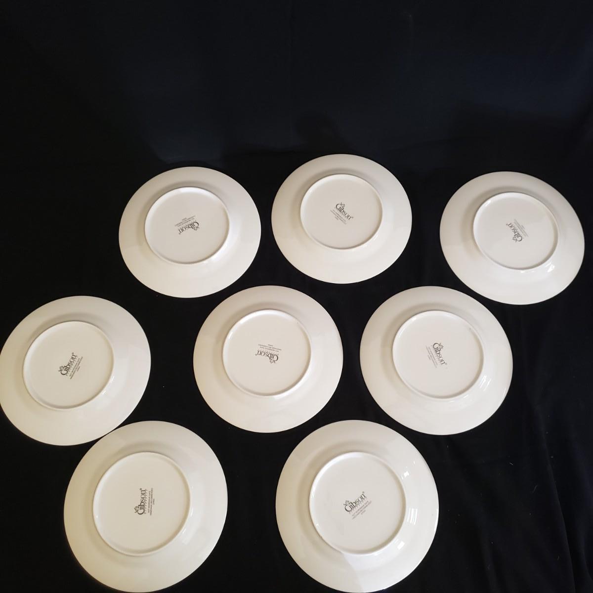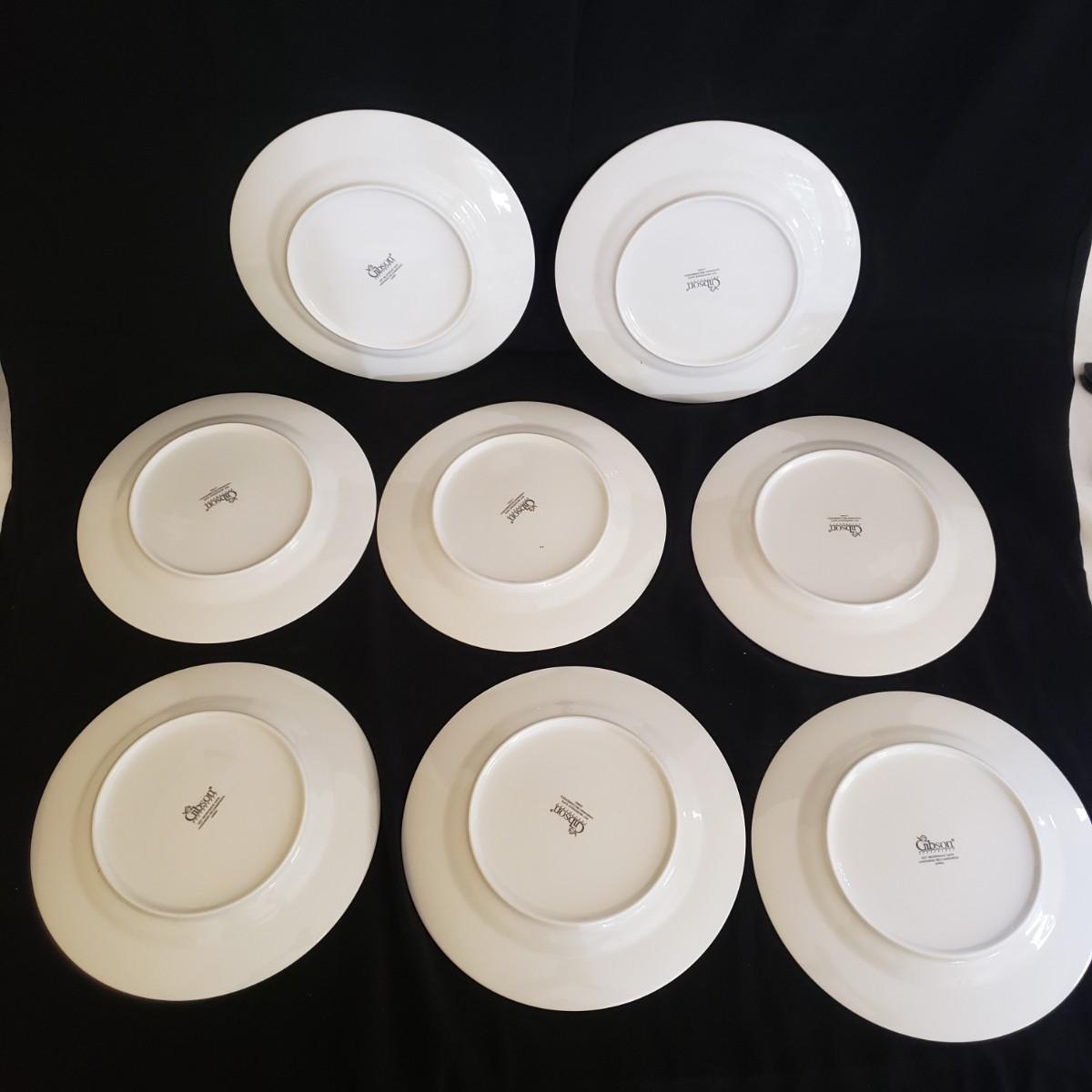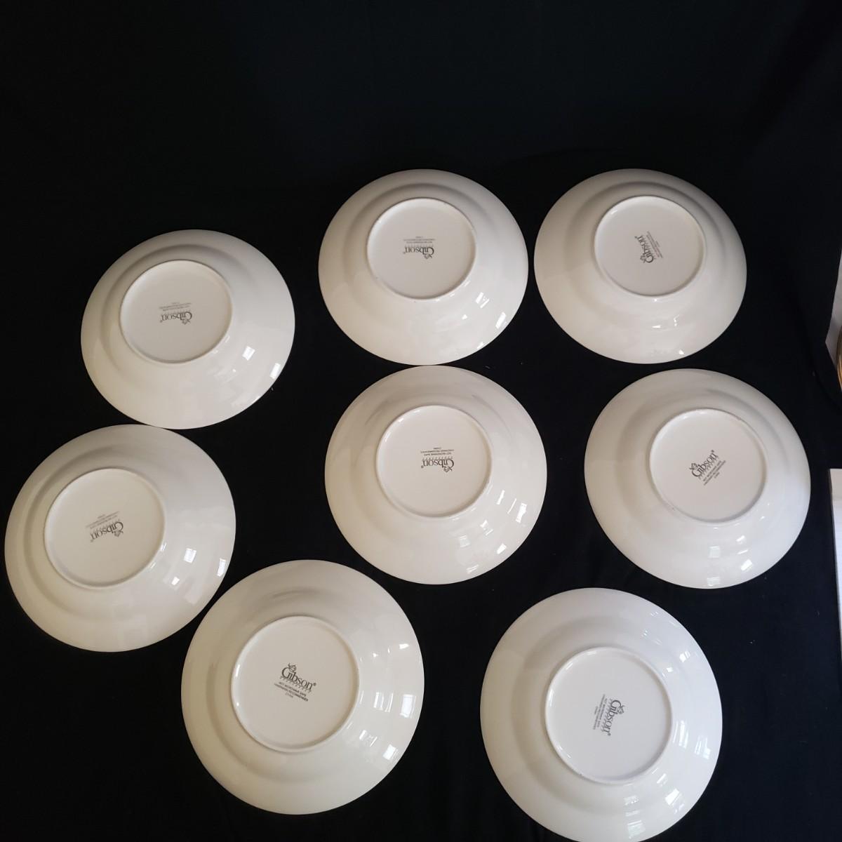 This lot features Gibson housewares vintage Christmas Charm China. There is one large bowl approximately 9", one cream and sugar bowl, eight bowls approximately 8", eight plates approximately 8", one 12" plate, eight saucers with matching cups, and eight large plates approximately 10".