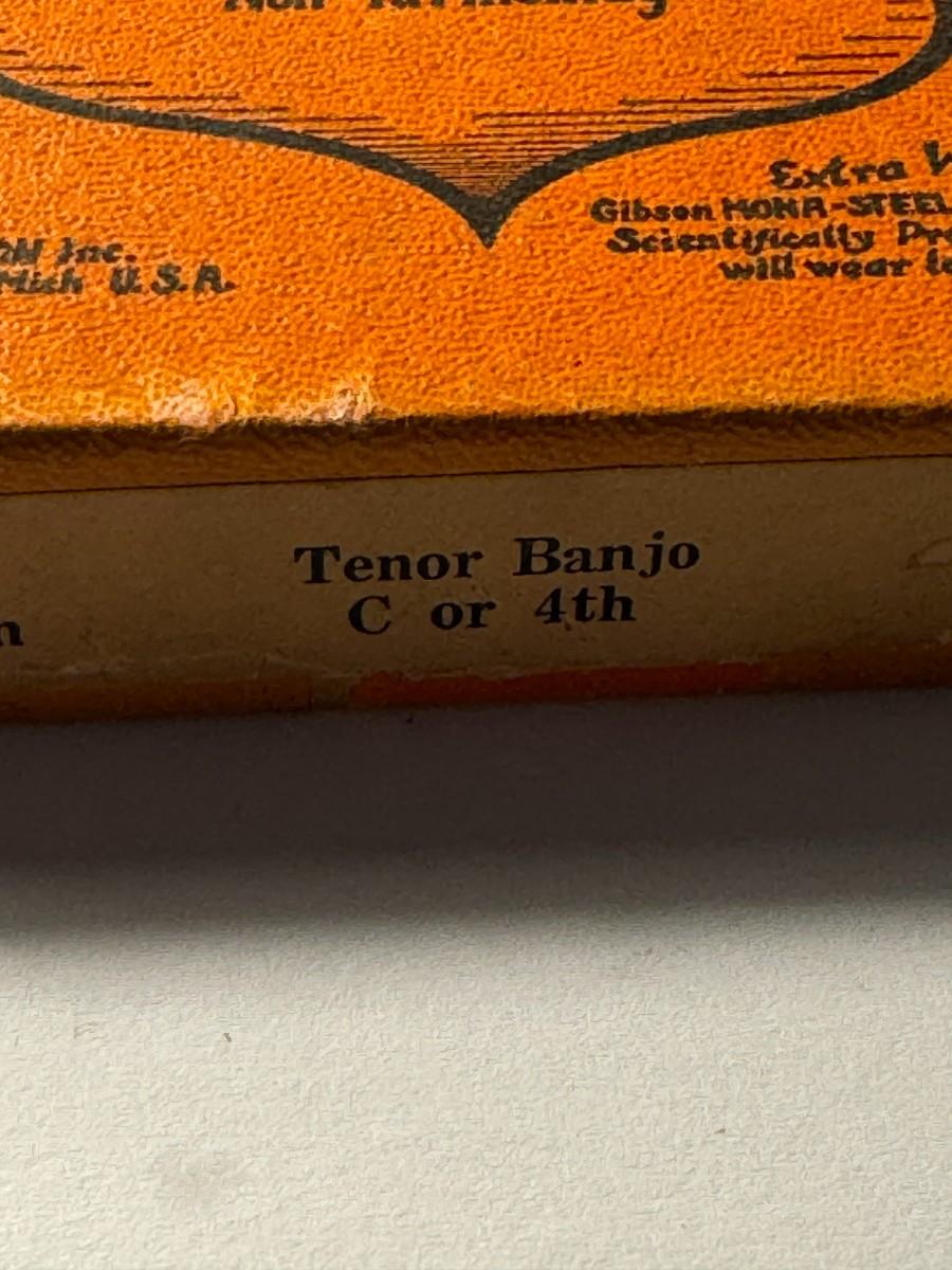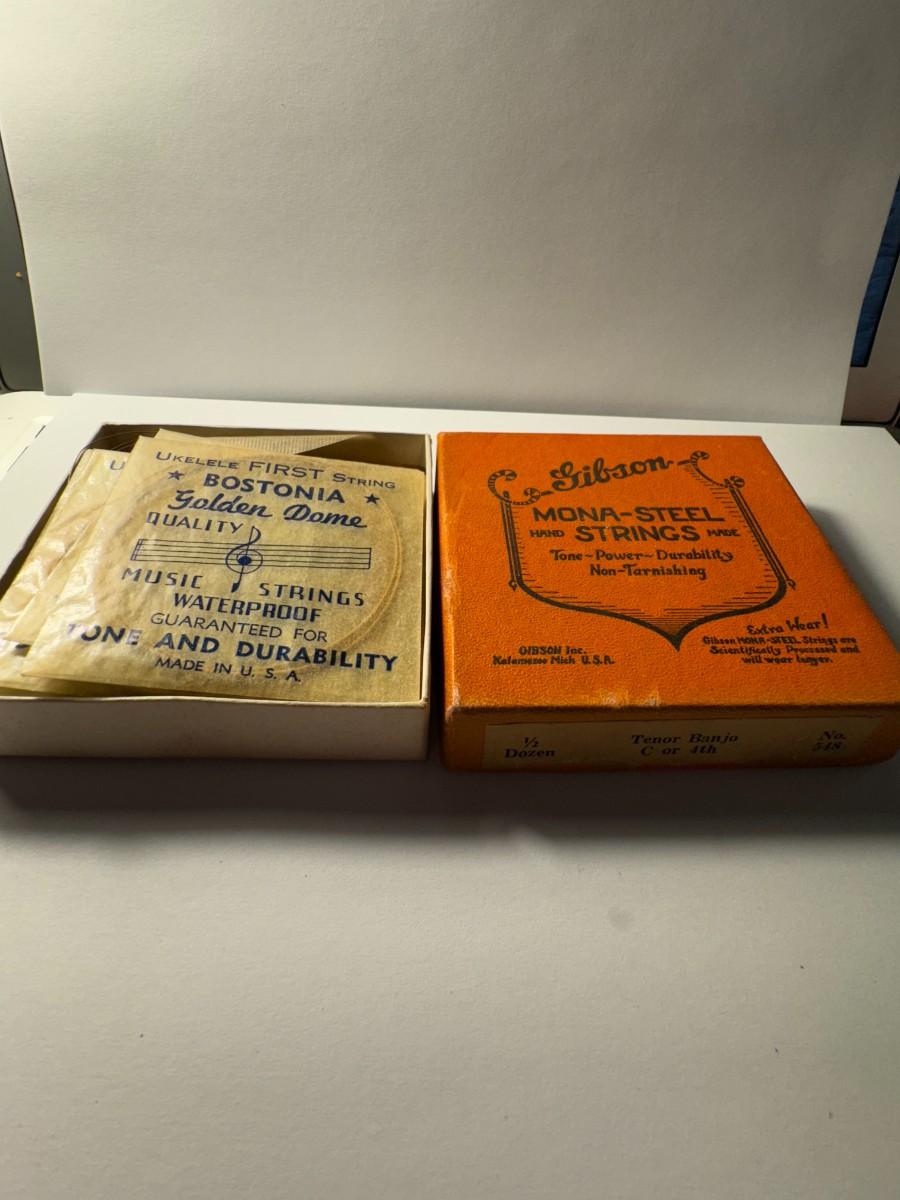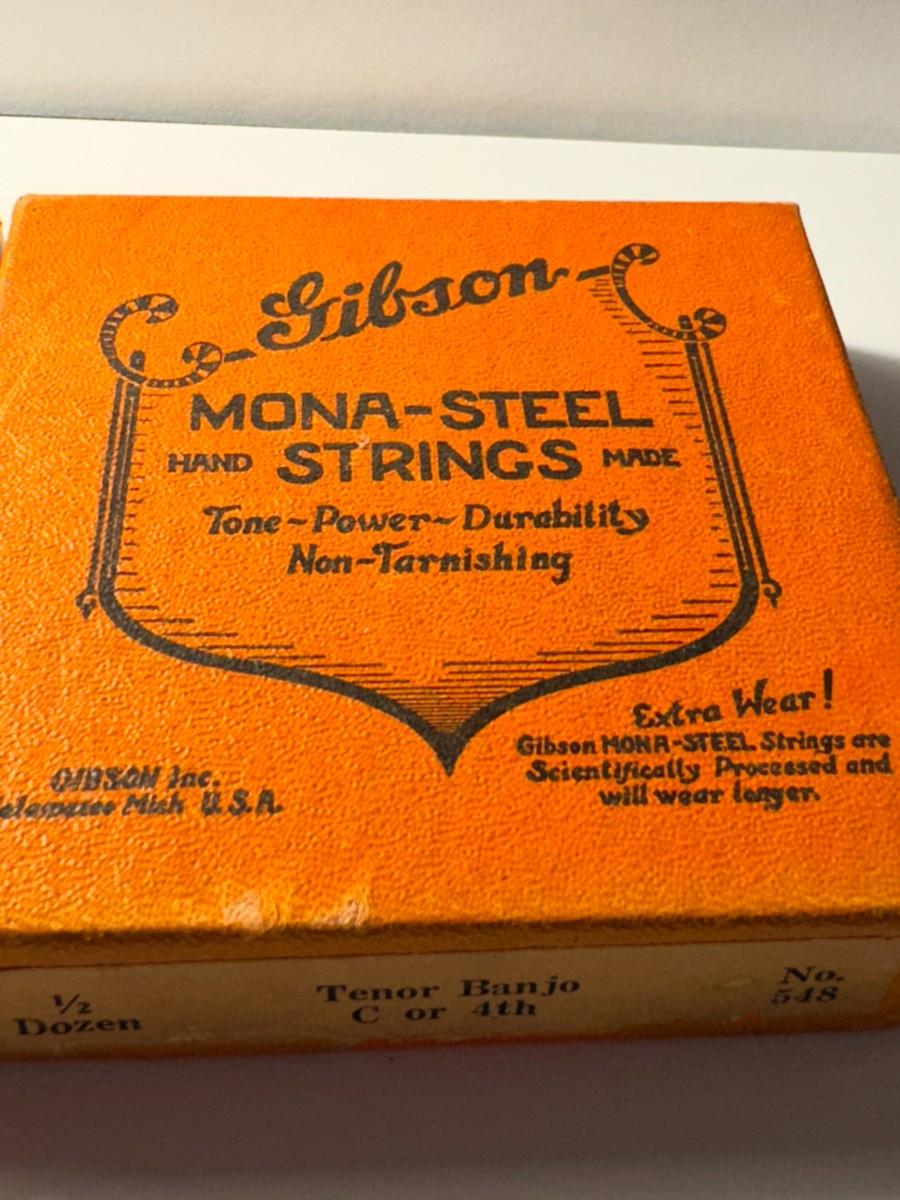 vintage orange box of Gibson Mona-Steel strings. These strings are described as "hand made" and offer "Tone-Power-Durability Non-Tarnishing", according to the box label.