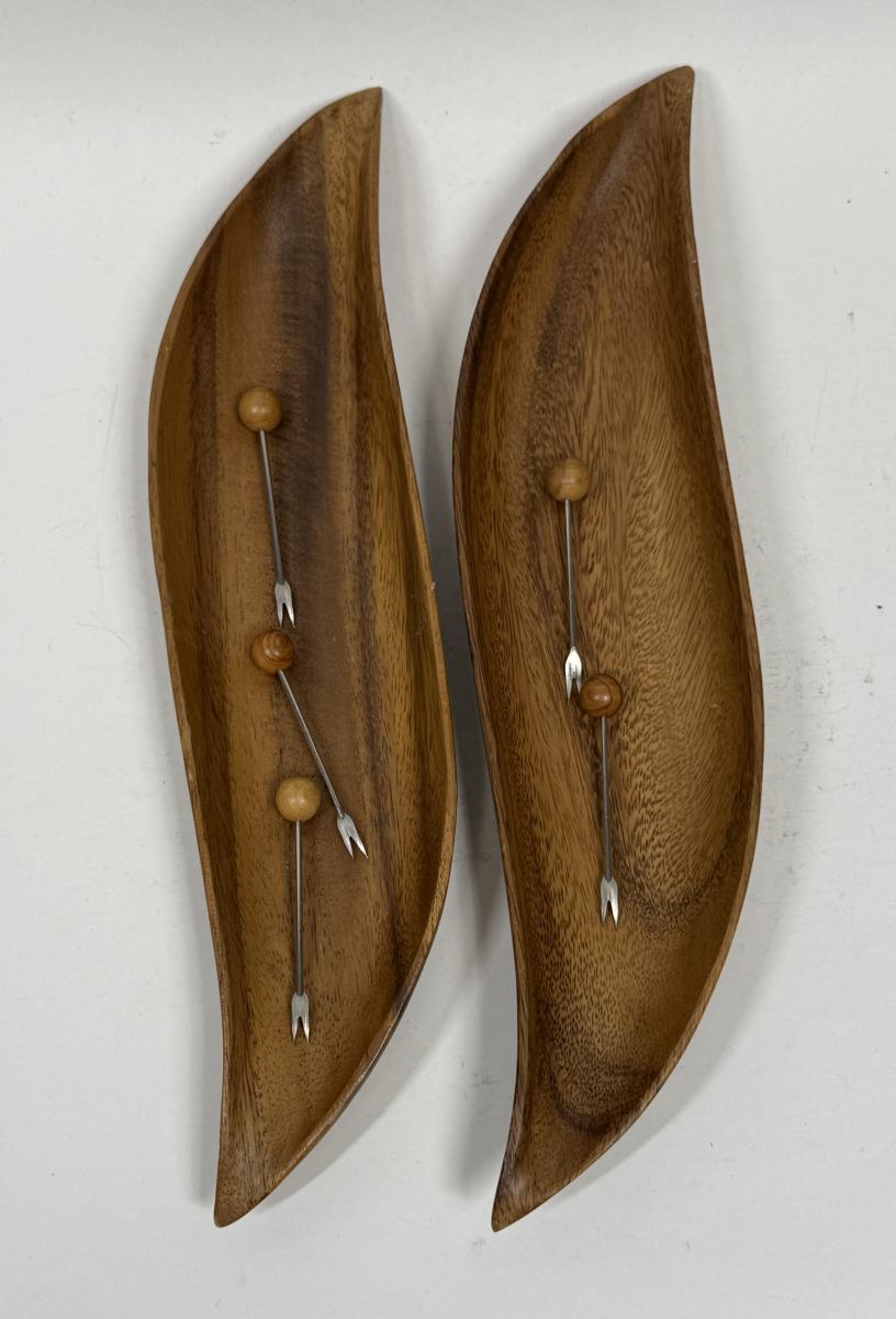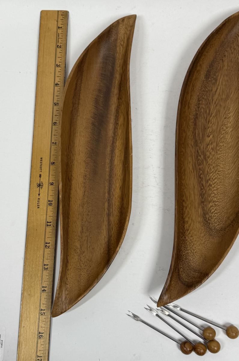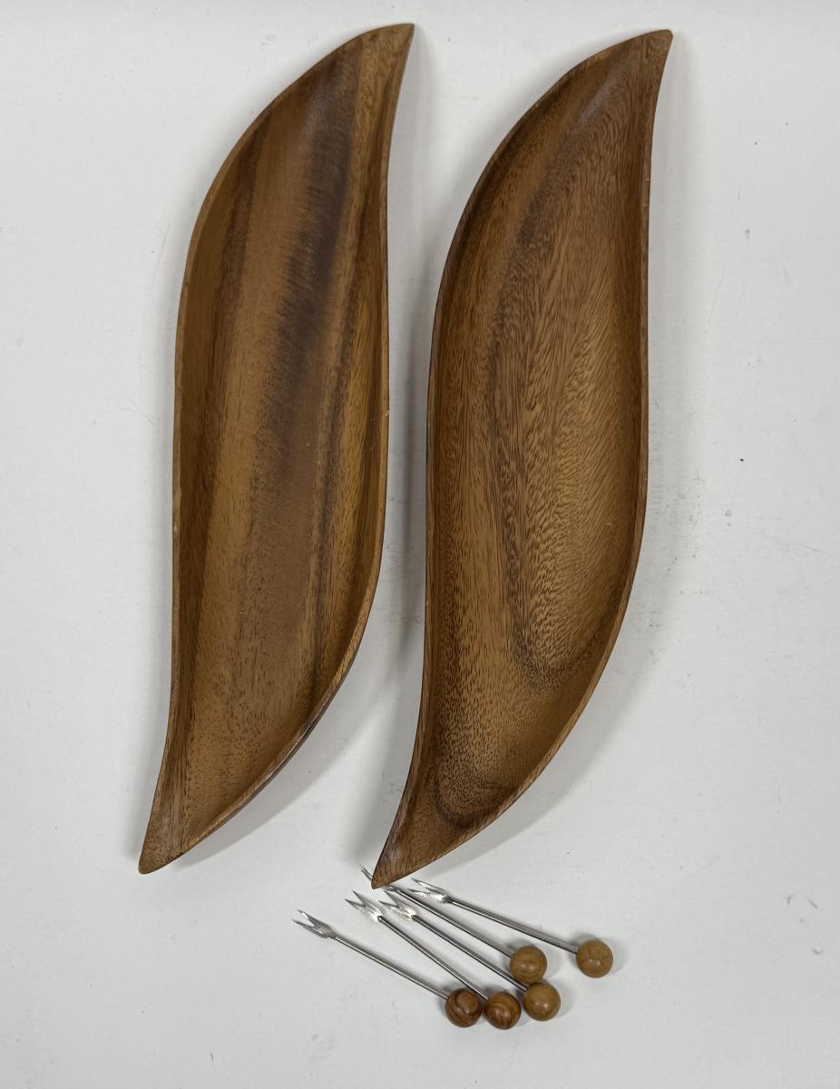 Mid Century Pair of Carved Wooden "Monkey Pod" hors d'oeuvre tray with small wooden handle picks