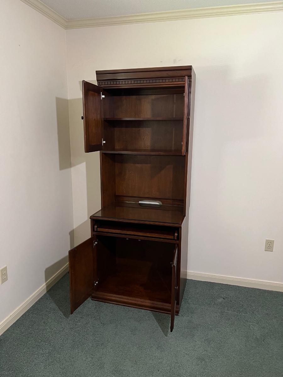 2 pieces ~ No brand name ~ Bottom glass top piece = 30” H x 30” W x 22.25” D ~ Top Cabinet = 46” H x 30” W x 14.5” D