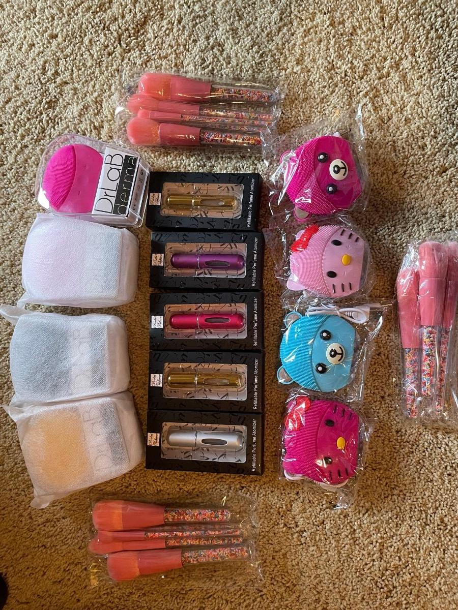 Derma facial scrubbers, 4 small animal themed facial scrubbers, 3 sets of confetti make up brushes & 5 travel size atomizers, These items make great gifts!