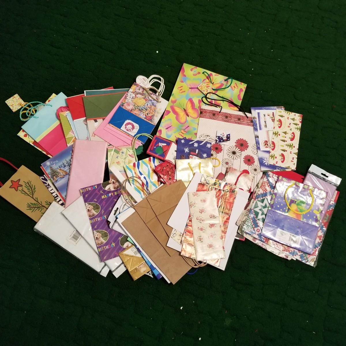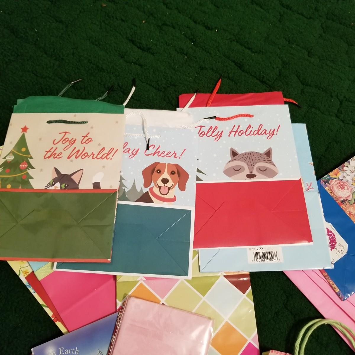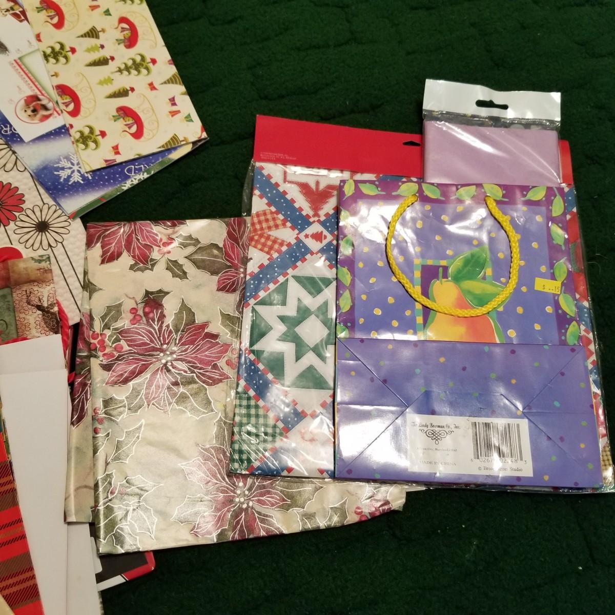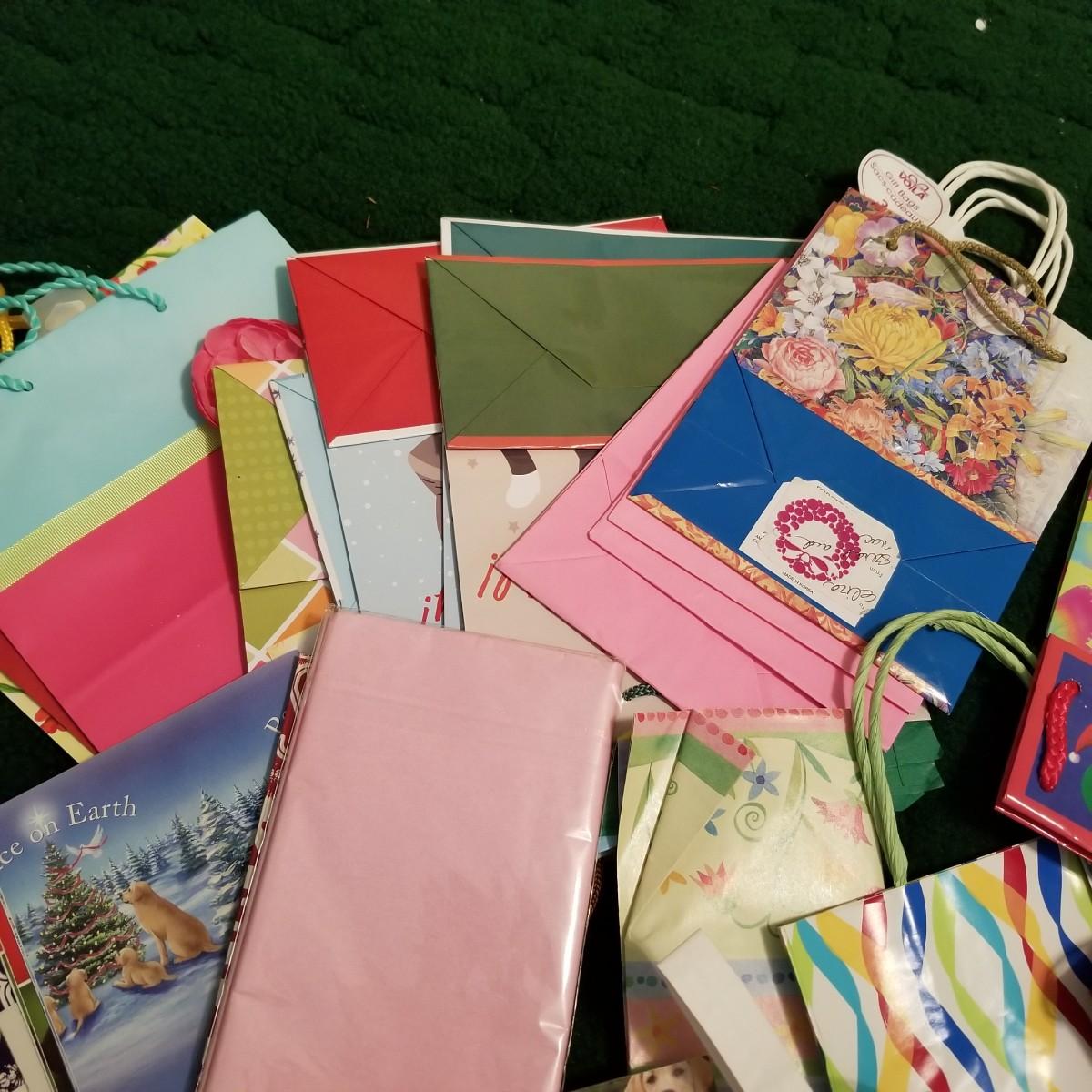 A mixture of bags and boxes to use for gift giving. Christmas, birthday, all occasions. Bags, boxes, tissue and wrapping paper. Something for everyone. Small to large, bags are 3" x5" to 13" x16". Boxes are 9" x14" x2" to 11" x17" x2". Some plain and others themed. Shipping available.