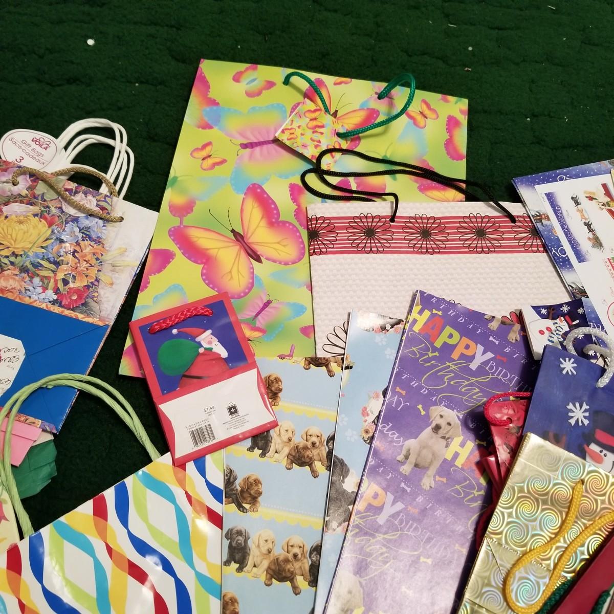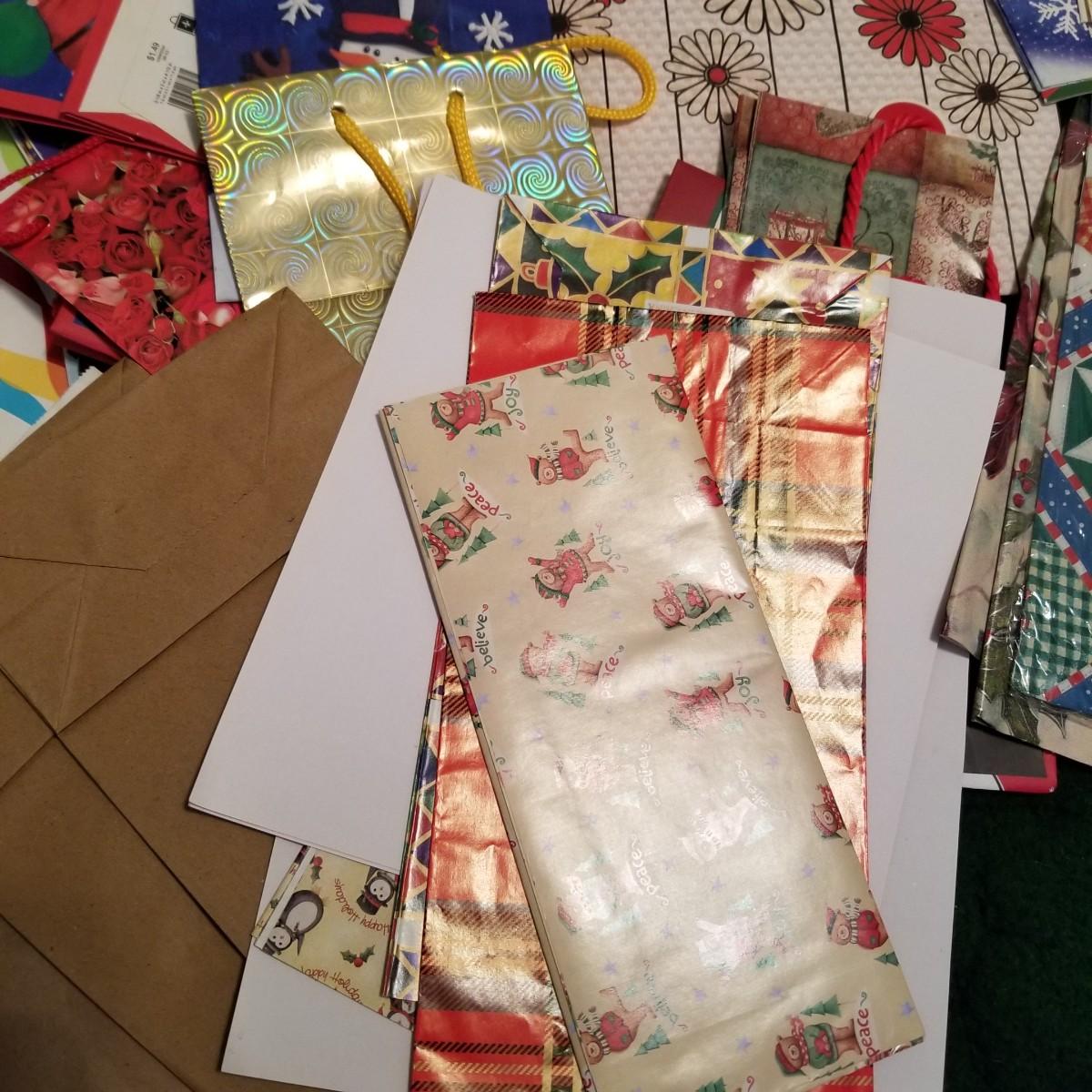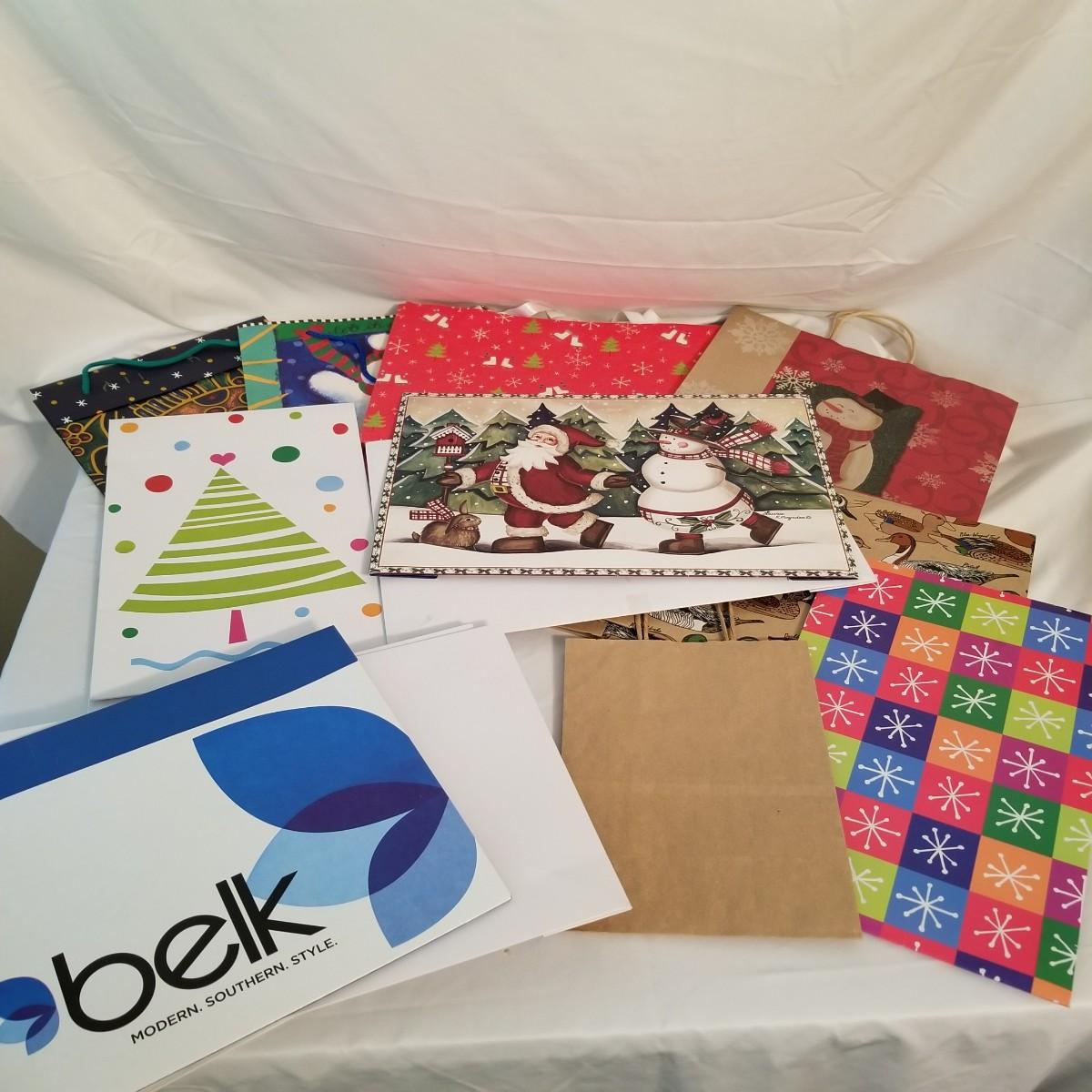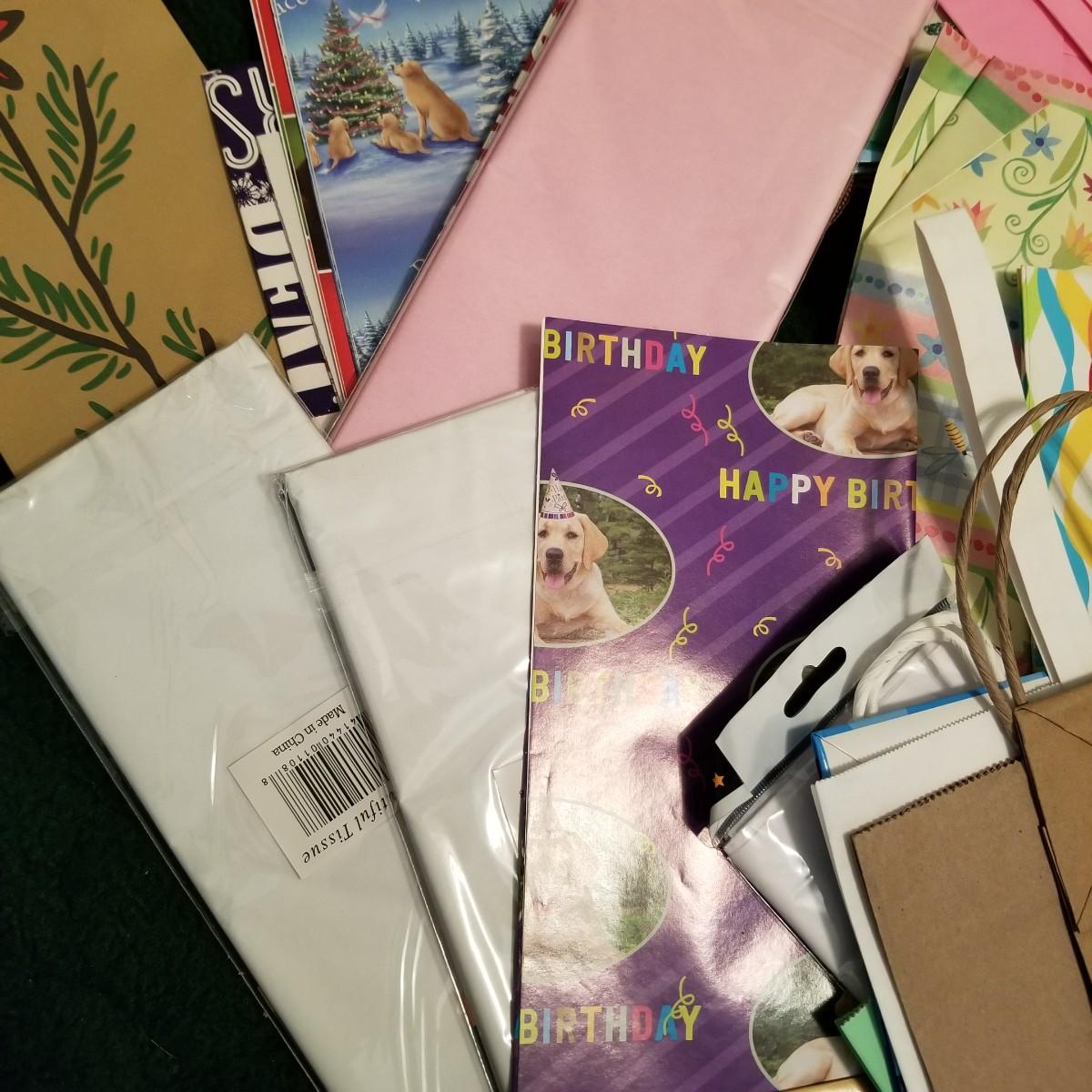 A mixture of bags and boxes to use for gift giving. Christmas, birthday, all occasions. Bags, boxes, tissue and wrapping paper. Something for everyone. Small to large, bags are 3" x5" to 13" x16". Boxes are 9" x14" x2" to 11" x17" x2". Some plain and others themed. Shipping available.