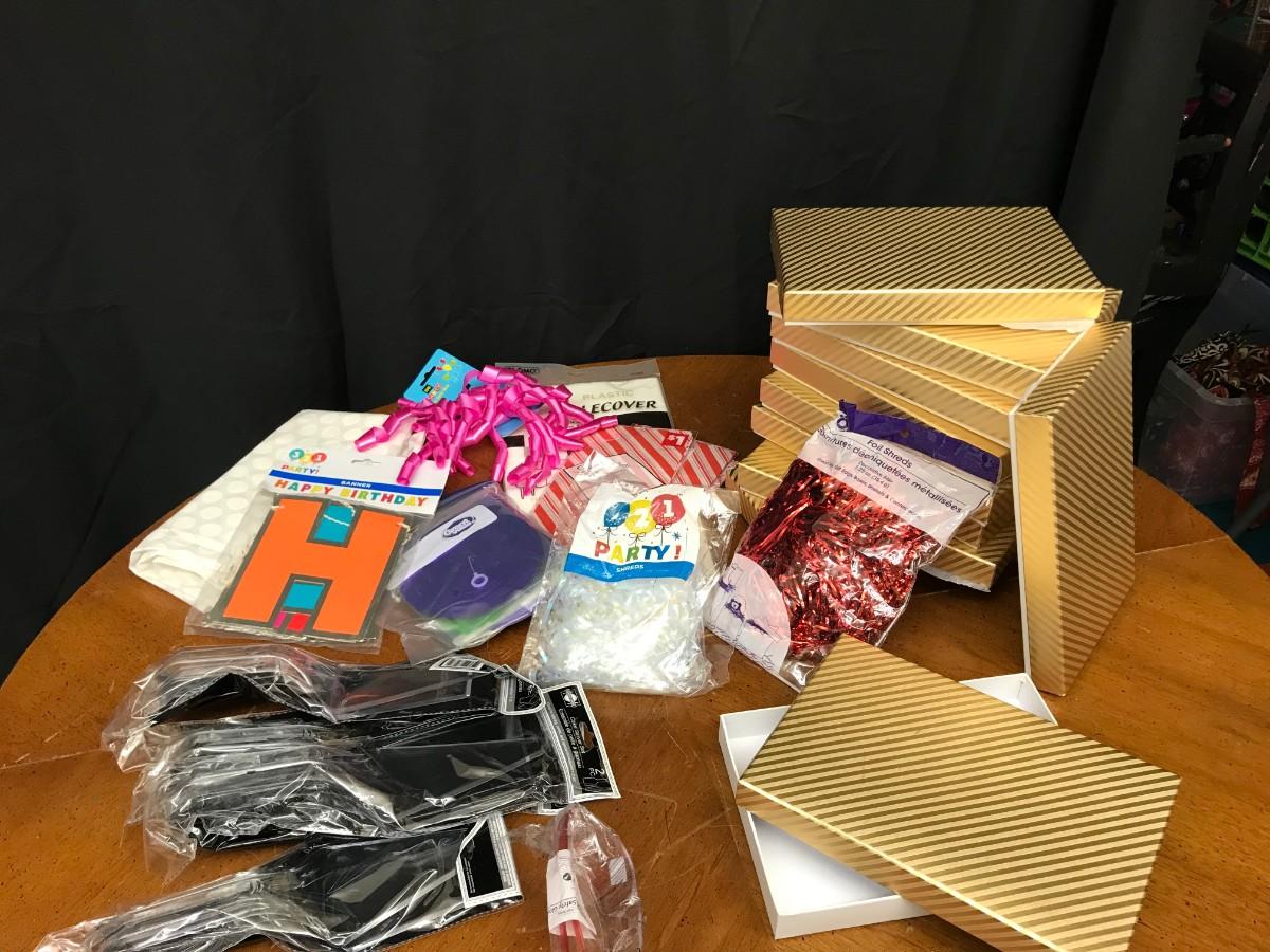 party supplies: gift boxes, happy birthday banner, gift bags, gift wrap materials;
