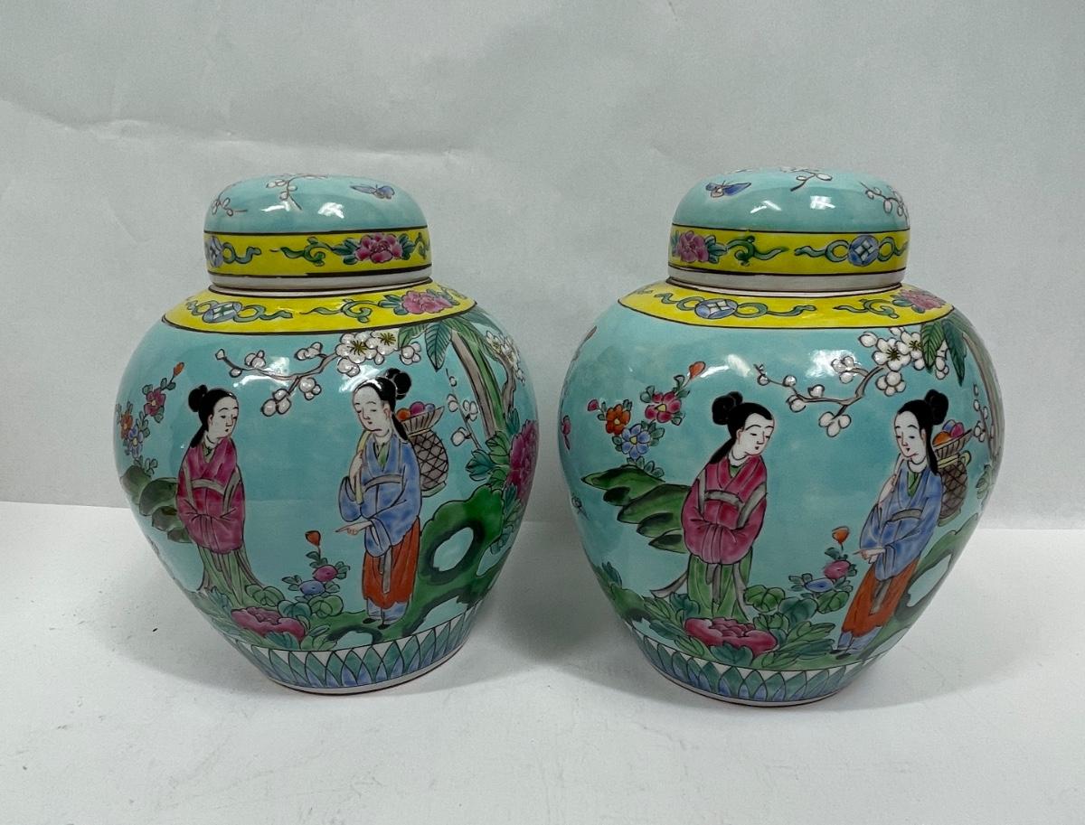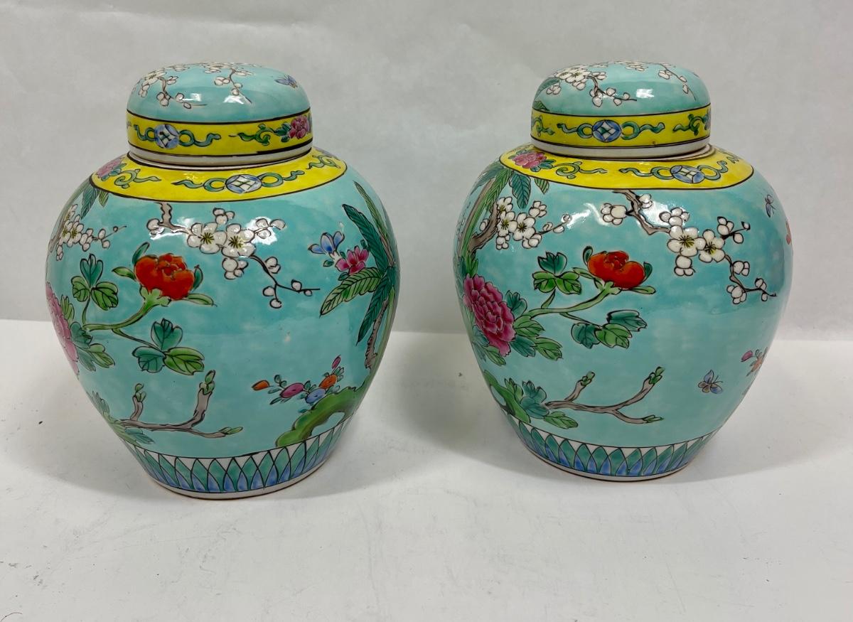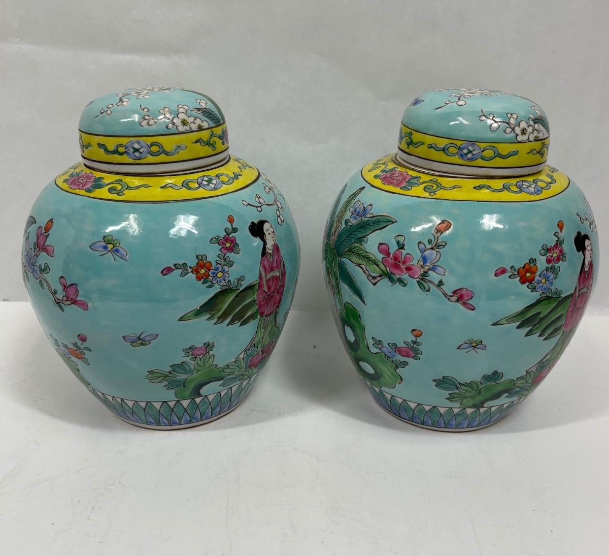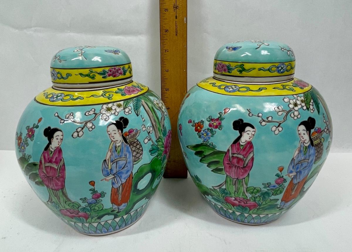 Similar in style to Late Qing Dynasty or early Republic of China Guanyin Bodhisattva pattern ginger jar. Both jars are very clean, no nicks, cracks or crazing. Approx. 8" tall. No direct way to verify age.