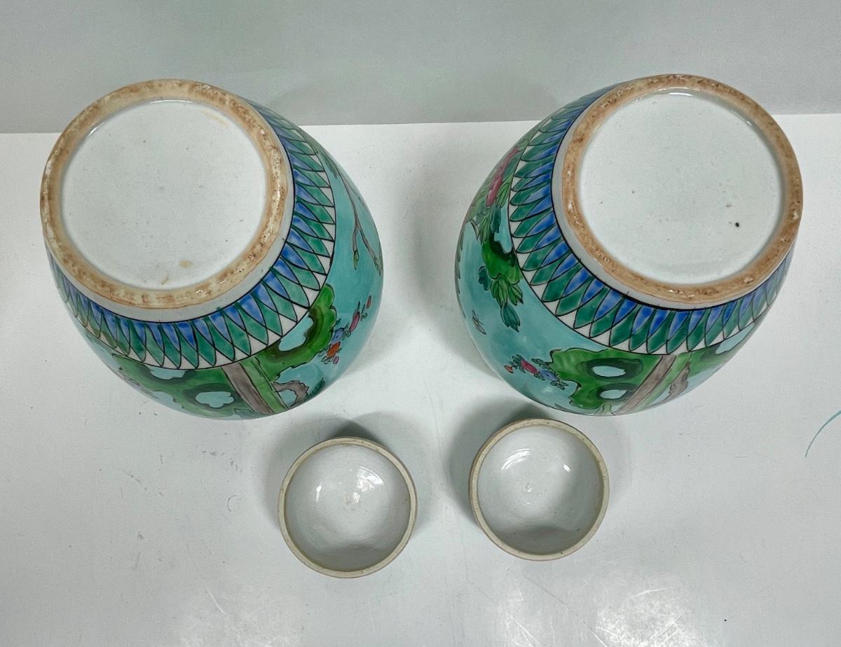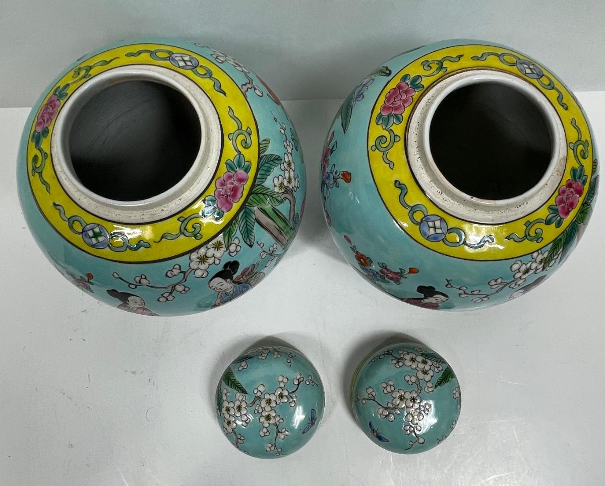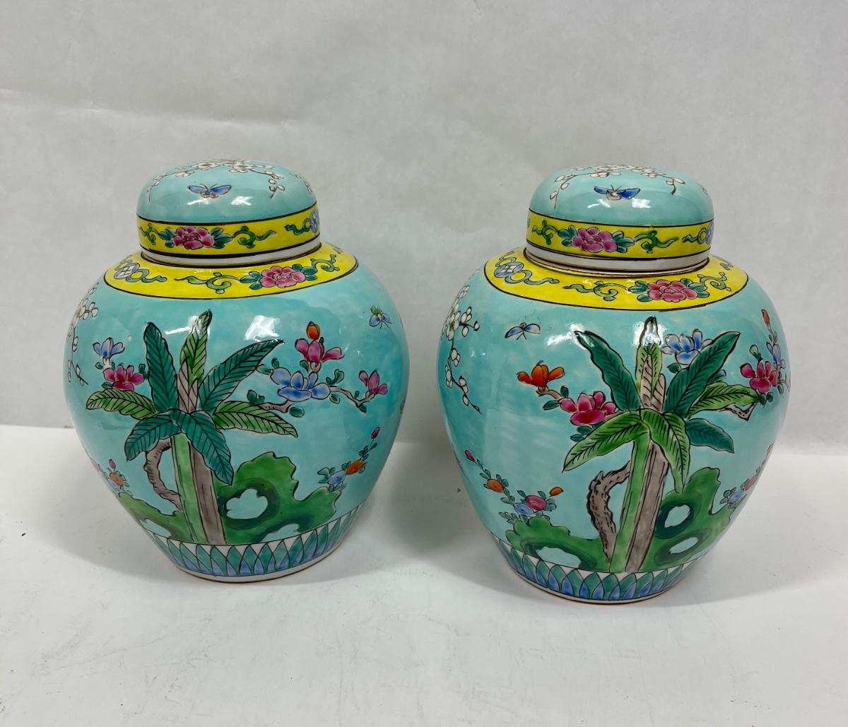 Similar in style to Late Qing Dynasty or early Republic of China Guanyin Bodhisattva pattern ginger jar. Both jars are very clean, no nicks, cracks or crazing. Approx. 8" tall. No direct way to verify age.