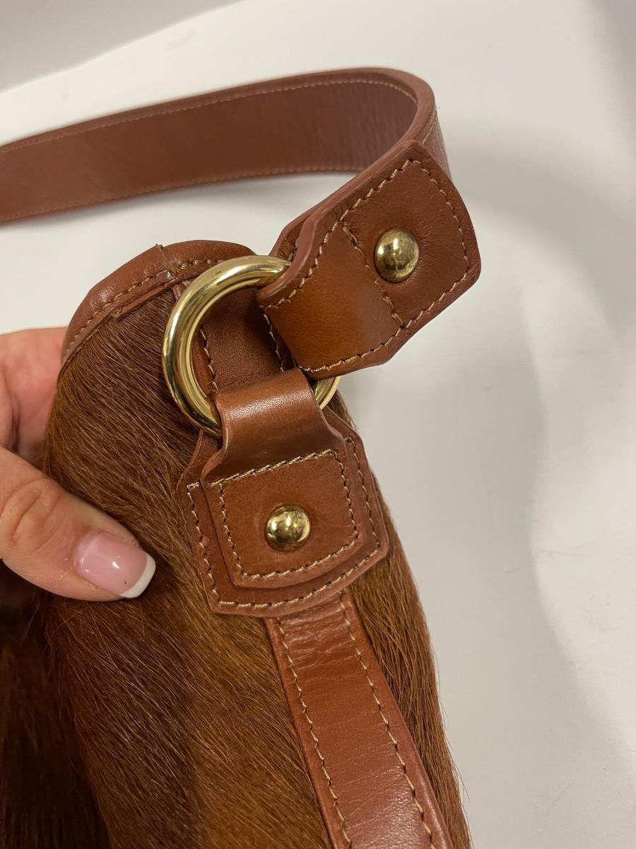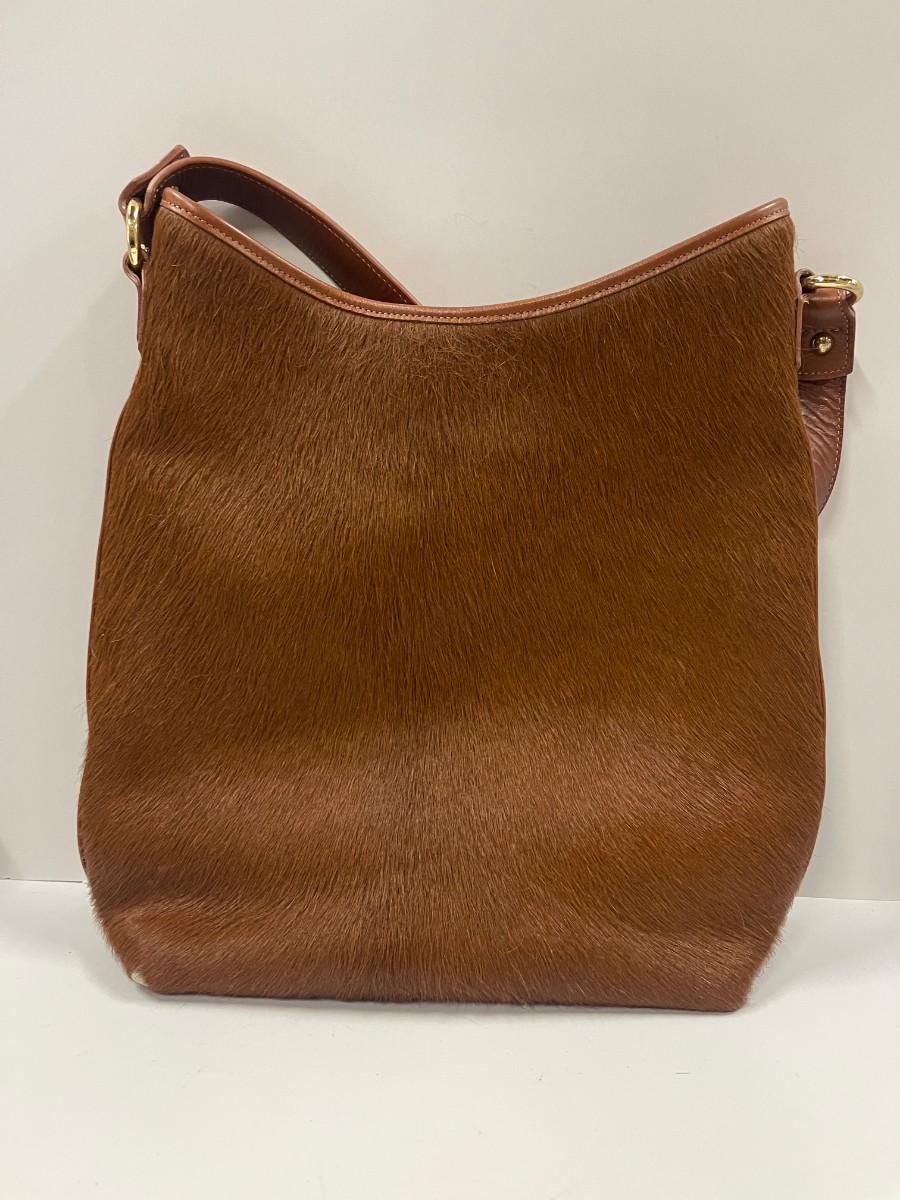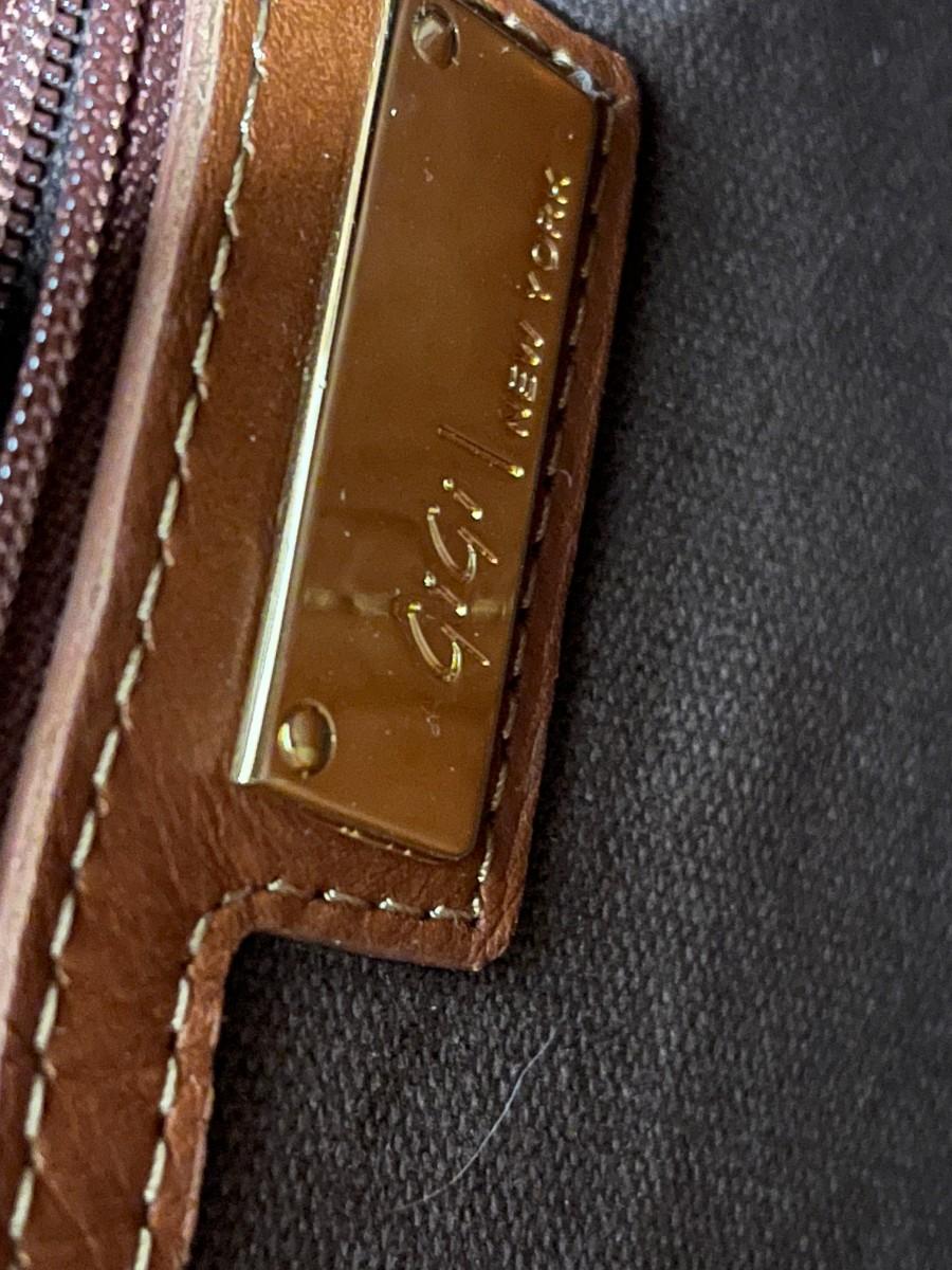 Gigi New York brown cow hide handbag. Overall good condition with obvious wear at the corners. Interior is clean. approx 13 1/2" x 12". Retail on a Gigi bag like this is approximately $400