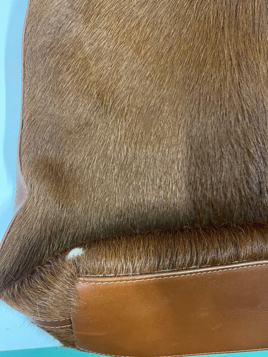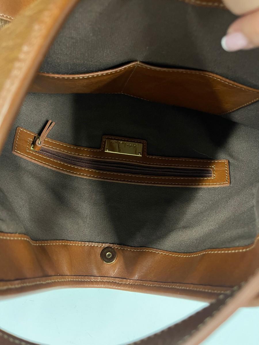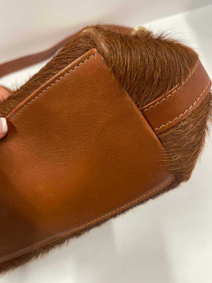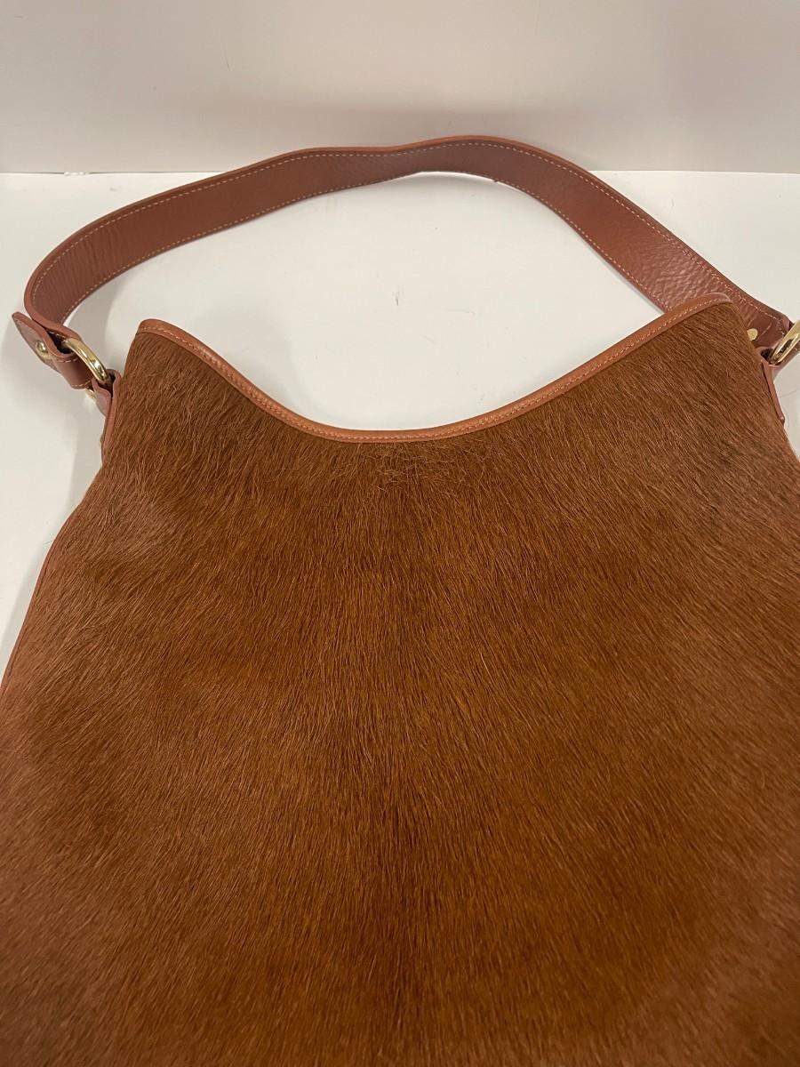 Gigi New York brown cow hide handbag. Overall good condition with obvious wear at the corners. Interior is clean. approx 13 1/2" x 12". Retail on a Gigi bag like this is approximately $400