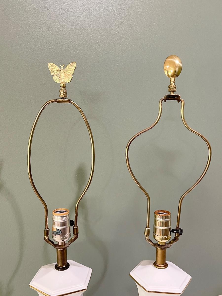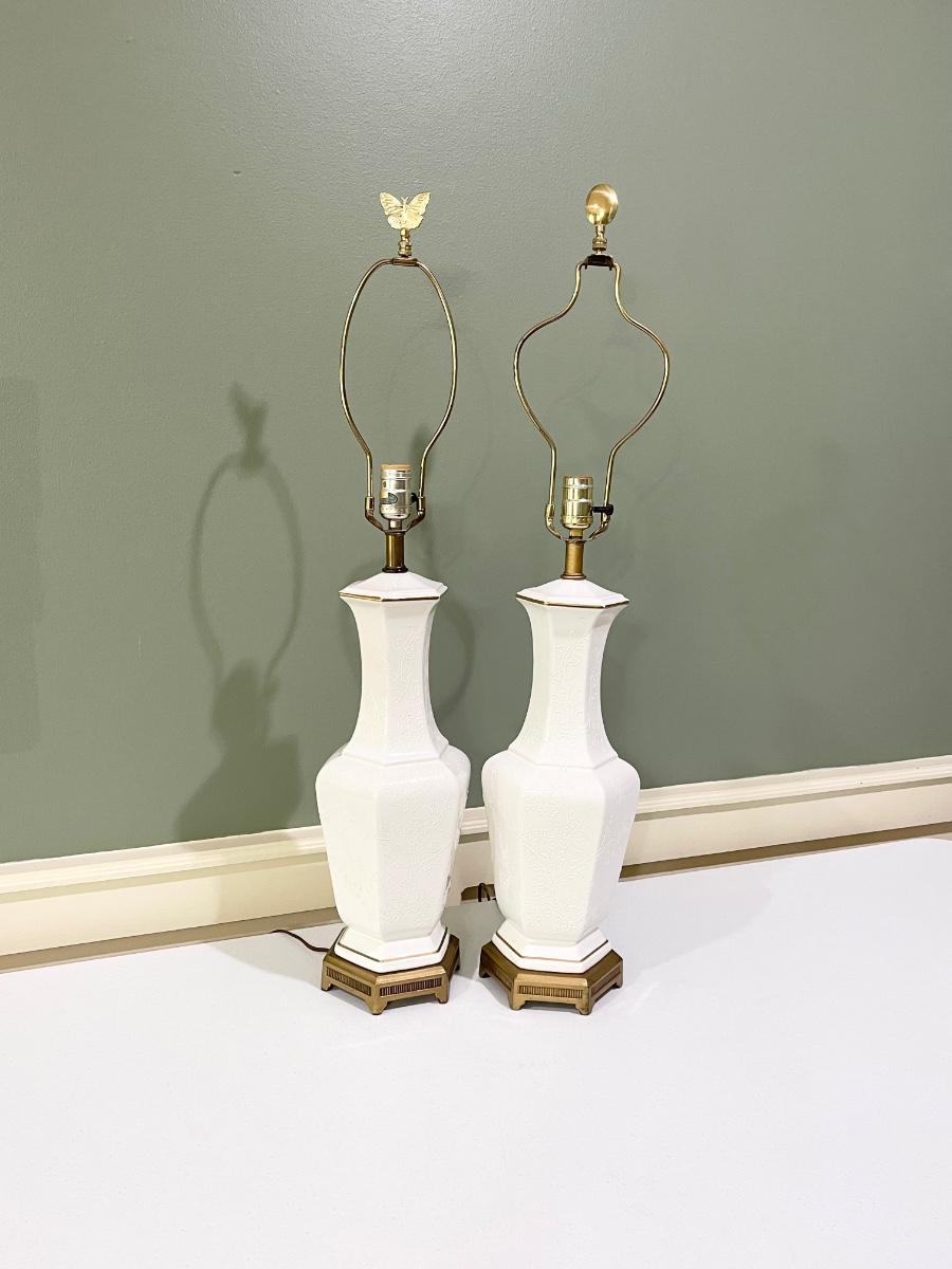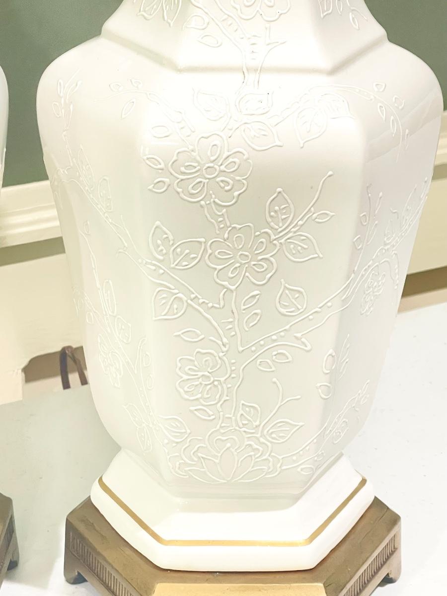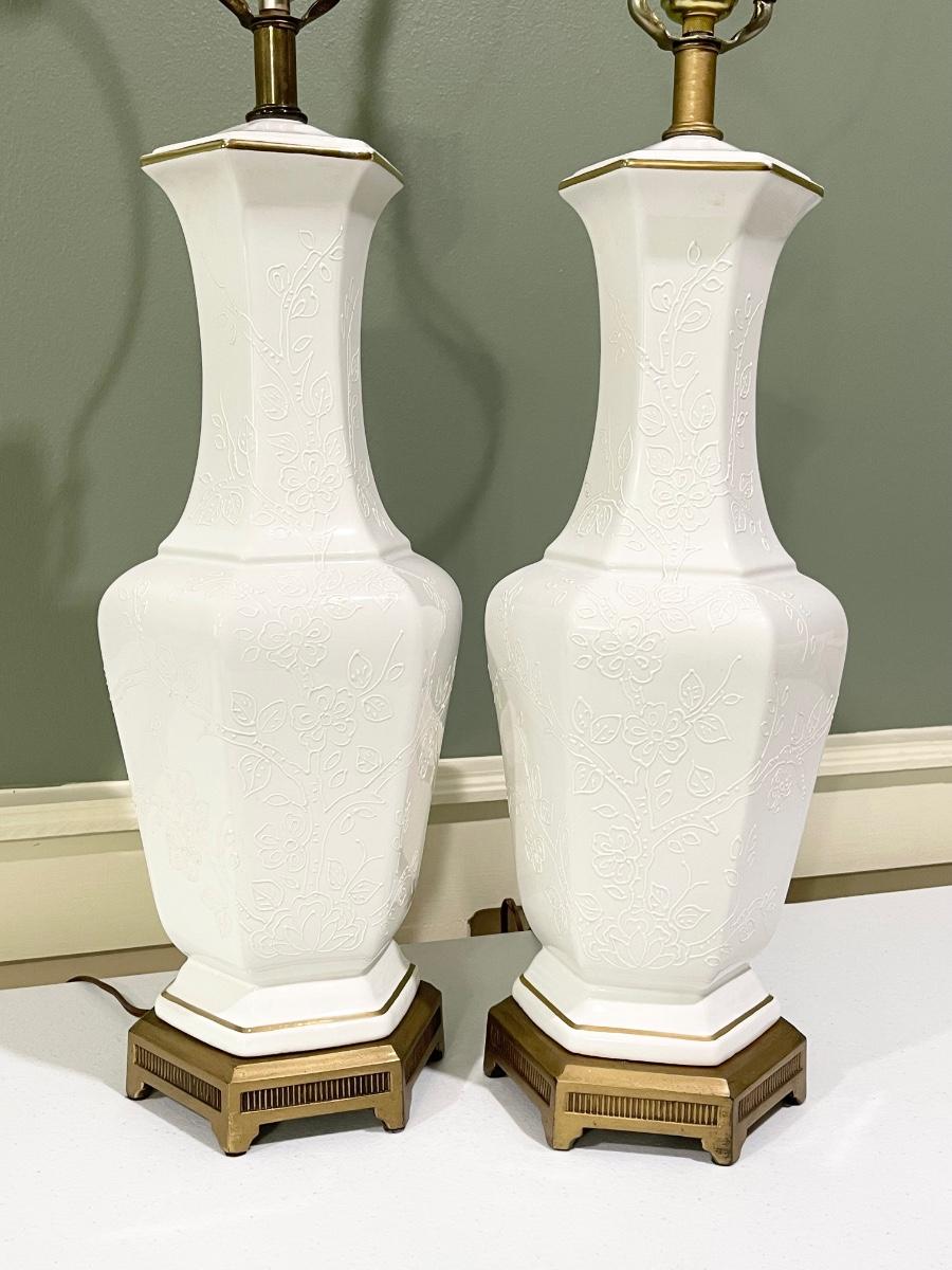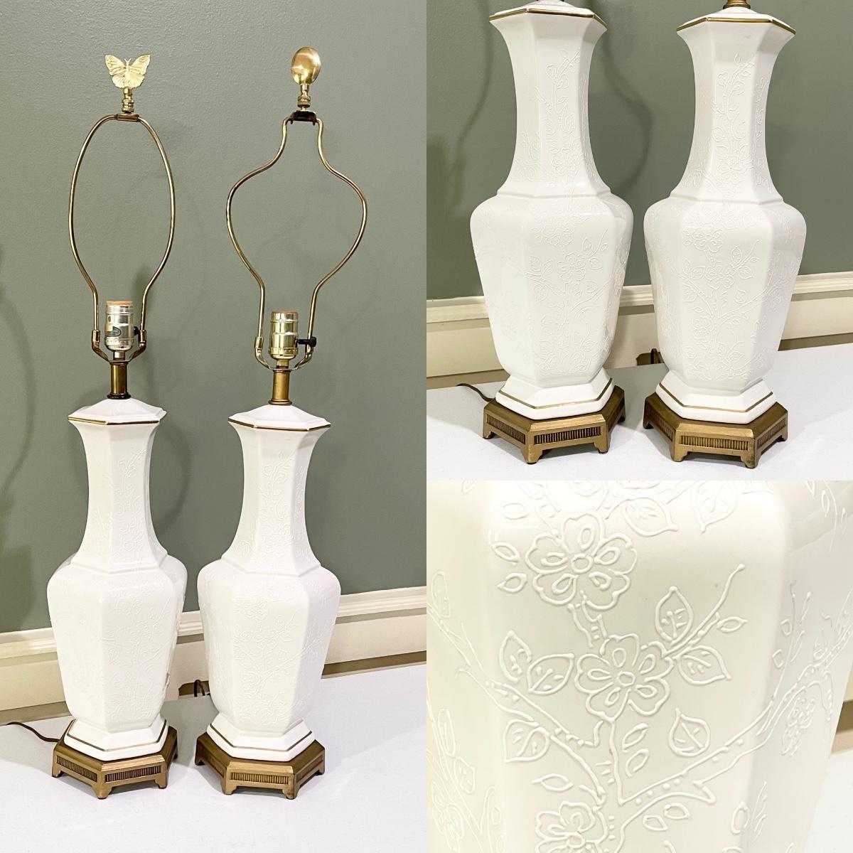 Pair (2) ~ Porcelain Gold Trim Embossed 3-Way Lamps
