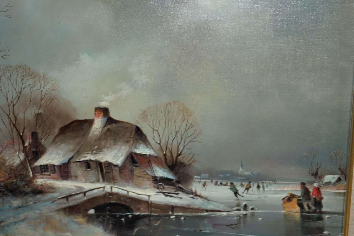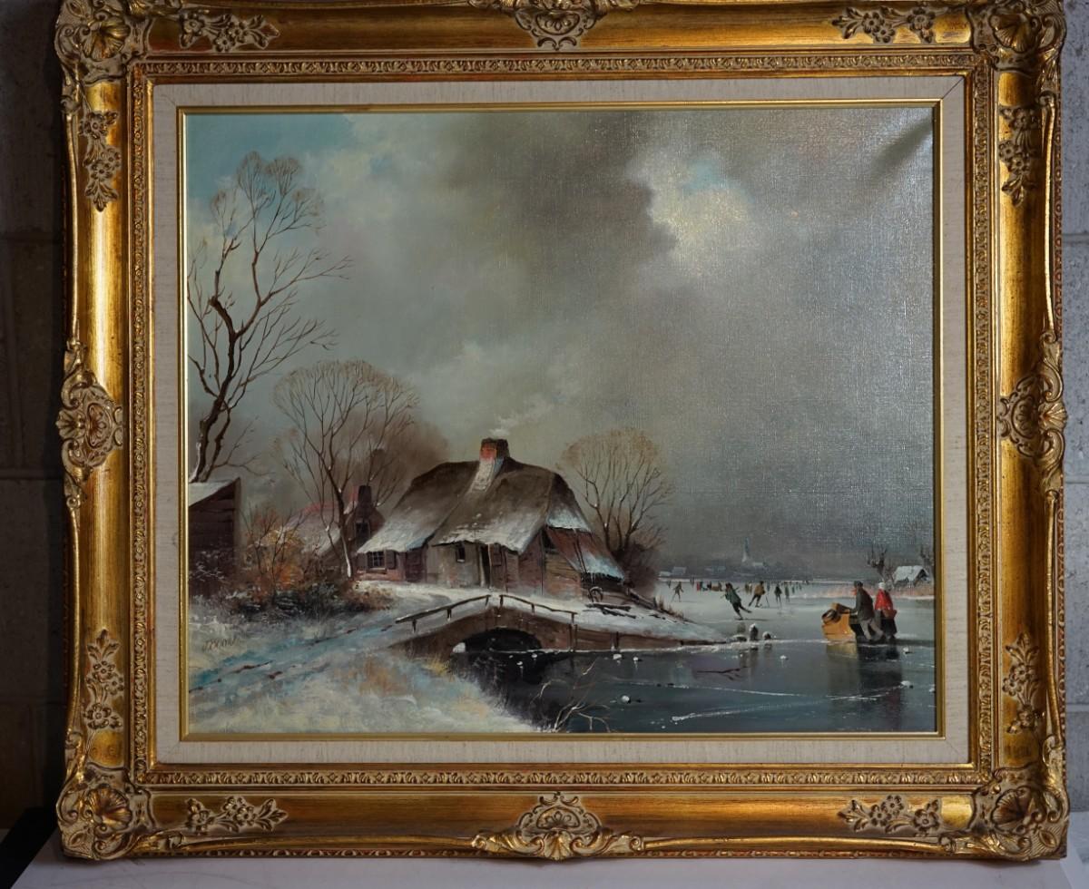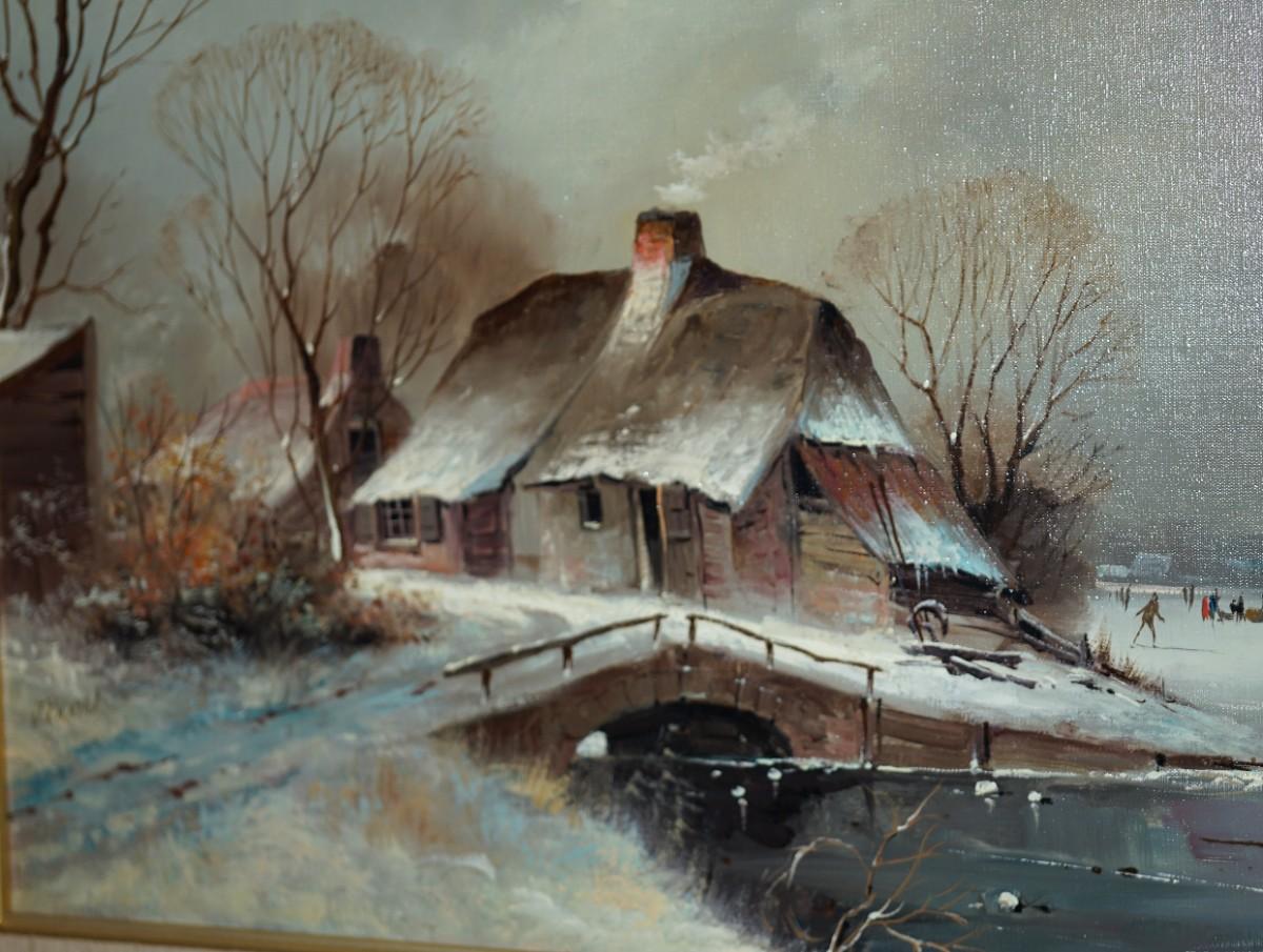 GIGLEE REPRODUCTION OF A DUTCH STYLE PAINTING WINTER SCENE OF COTTAGE BY SKATING POND
