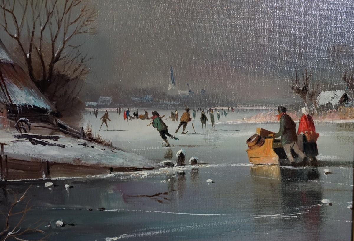 A very nice reproduction of a mix of folk art to realism theme, Cottage in winter near skating pond
