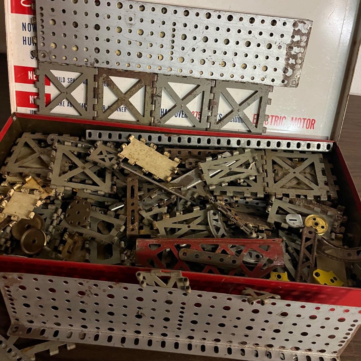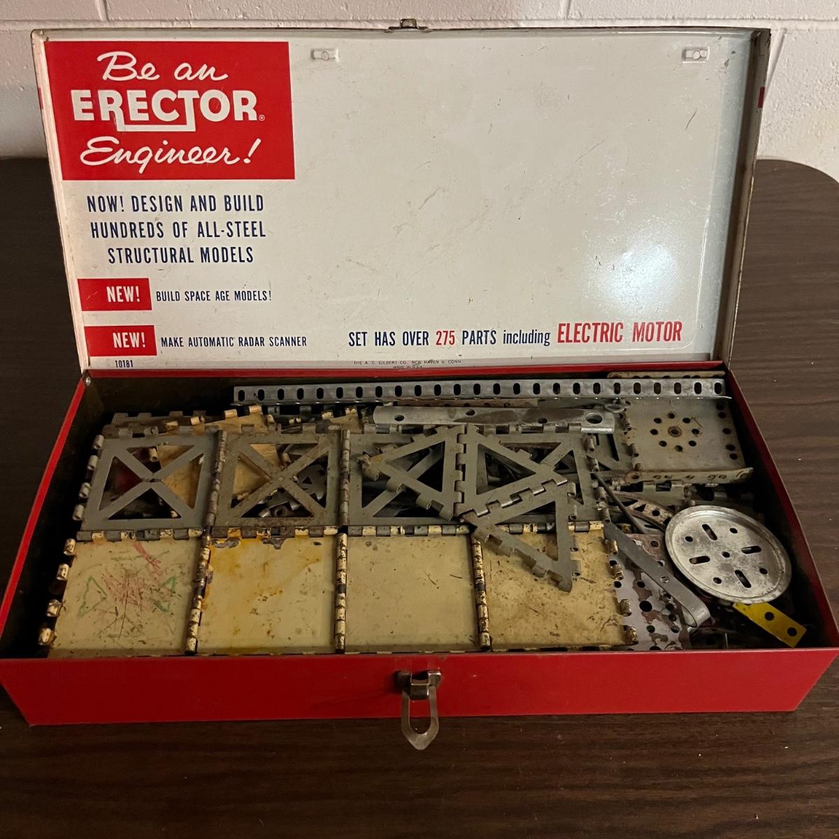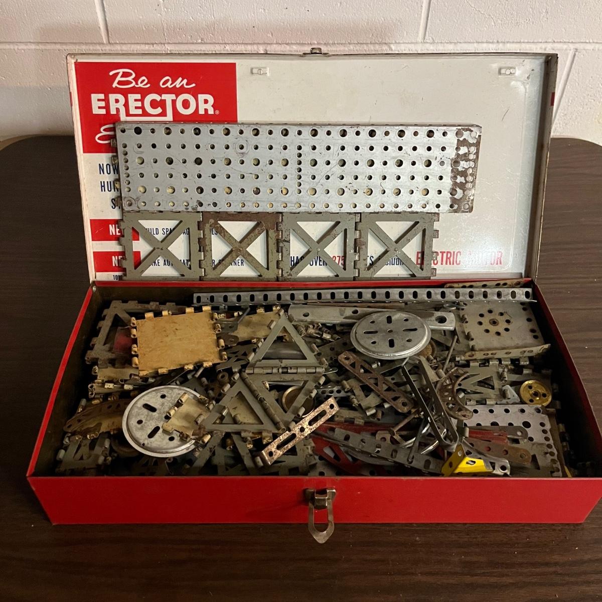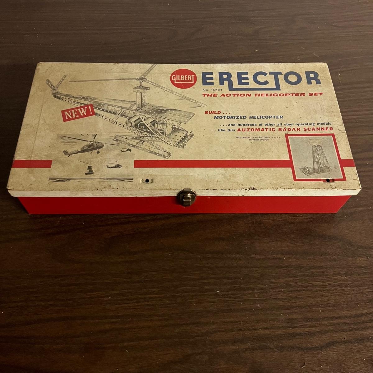 Lot includes a Gilbert Erector Action Helicopter Set in metal box. Box is full but we cannot guarantee parts are all there.