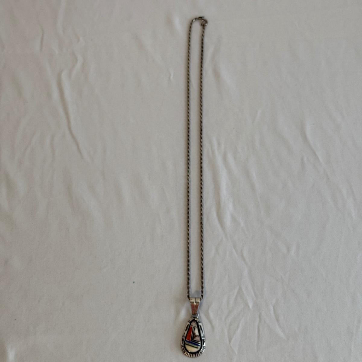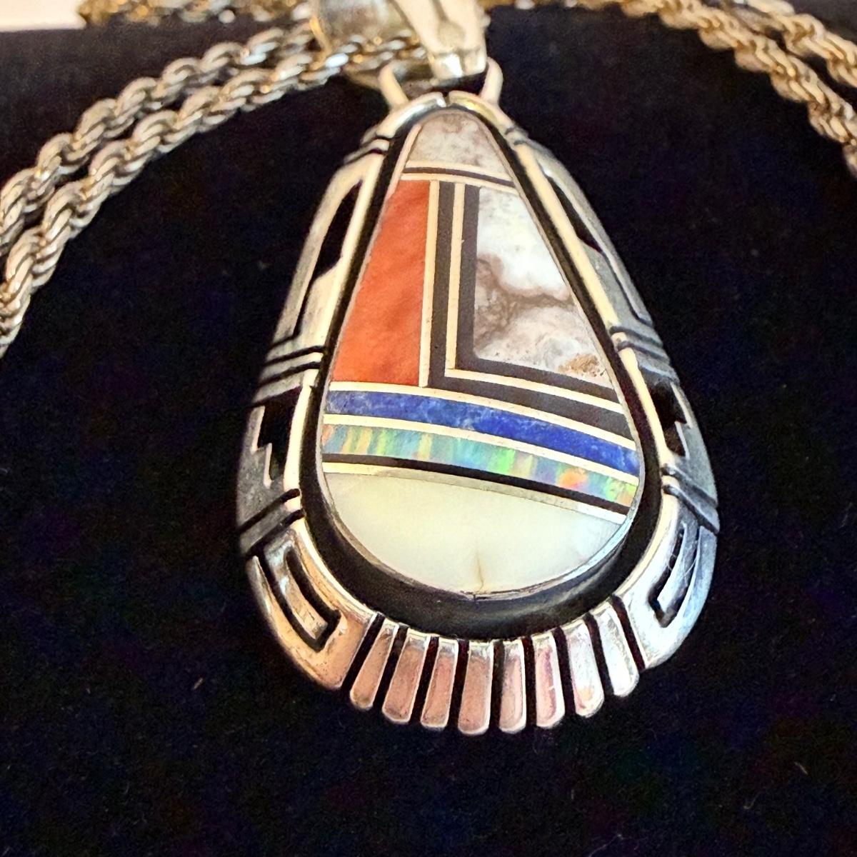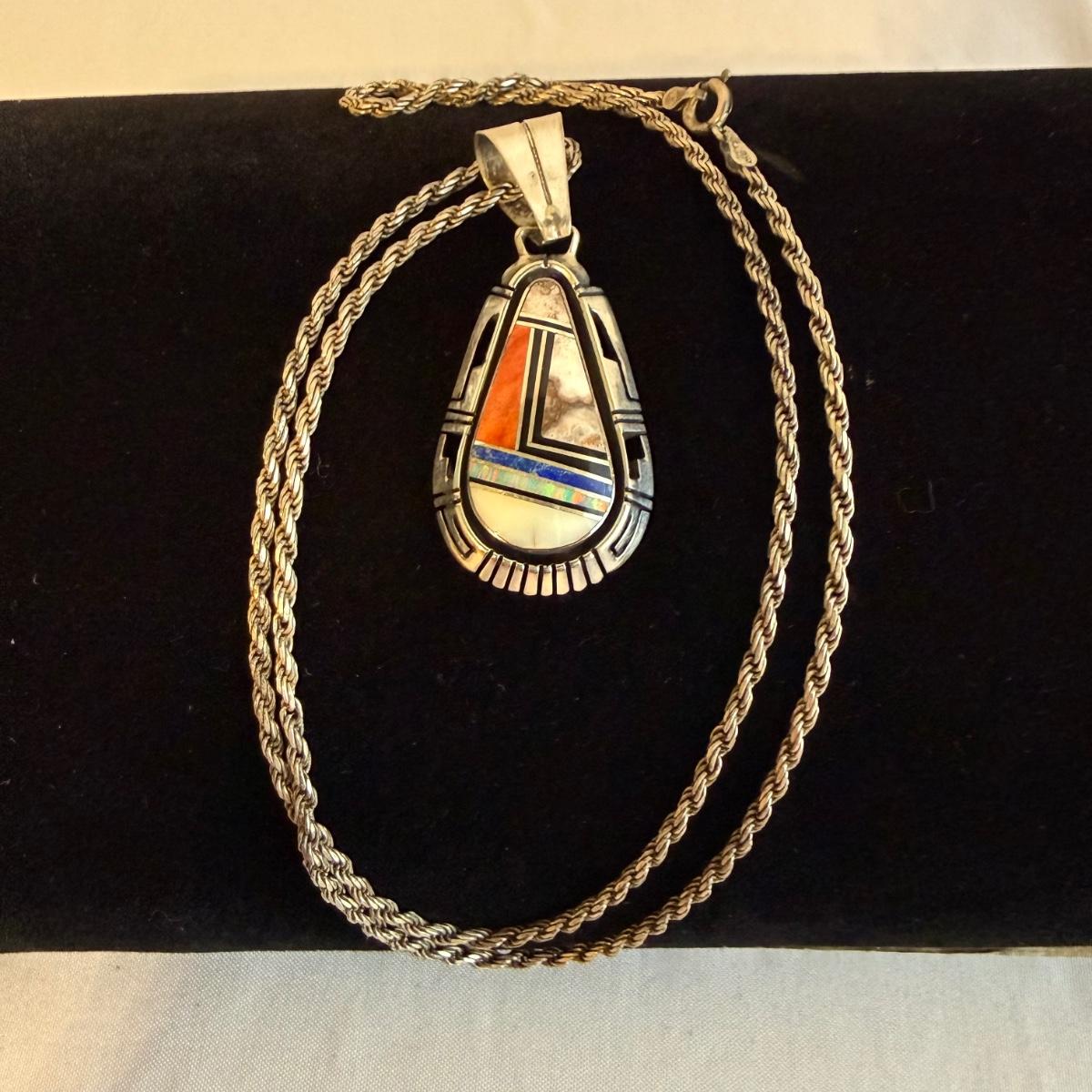 Stunning Navajo style pendant stamped Sterling Gilbert Nelson with also digits/letters written in ink. Inlay minerals appear to be lapis, opal, onyx, mother of pearl coral and more. Pendant is 2” long and 925 marked chain is 24”. All sales are final. No returns or refunds. Please bid accordingly. Shipping available.