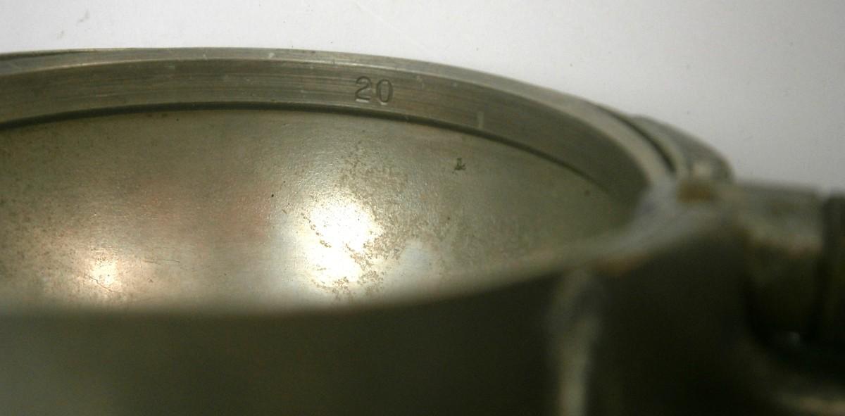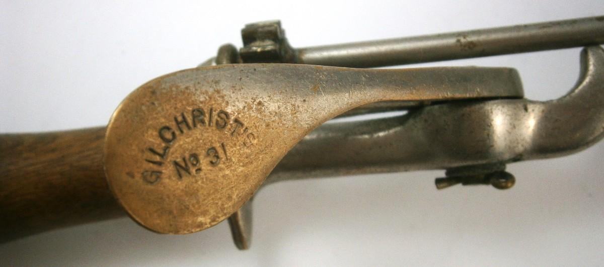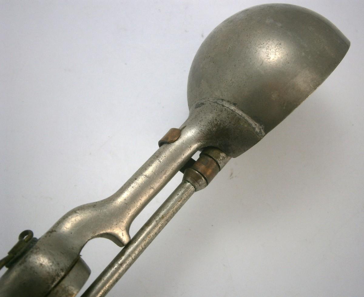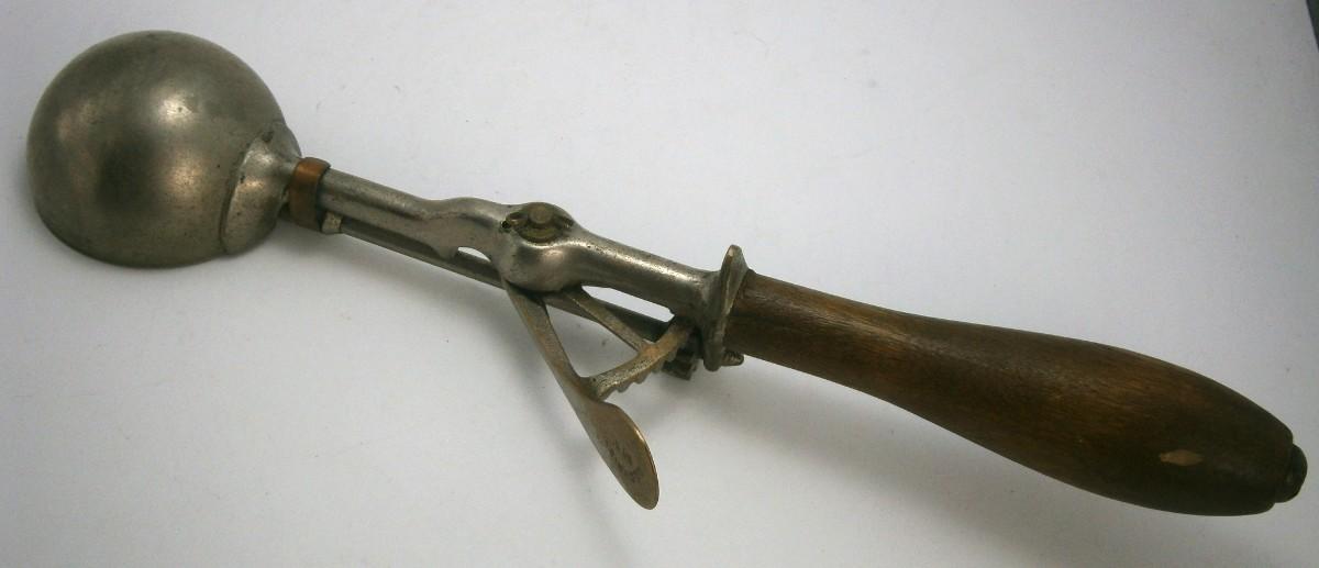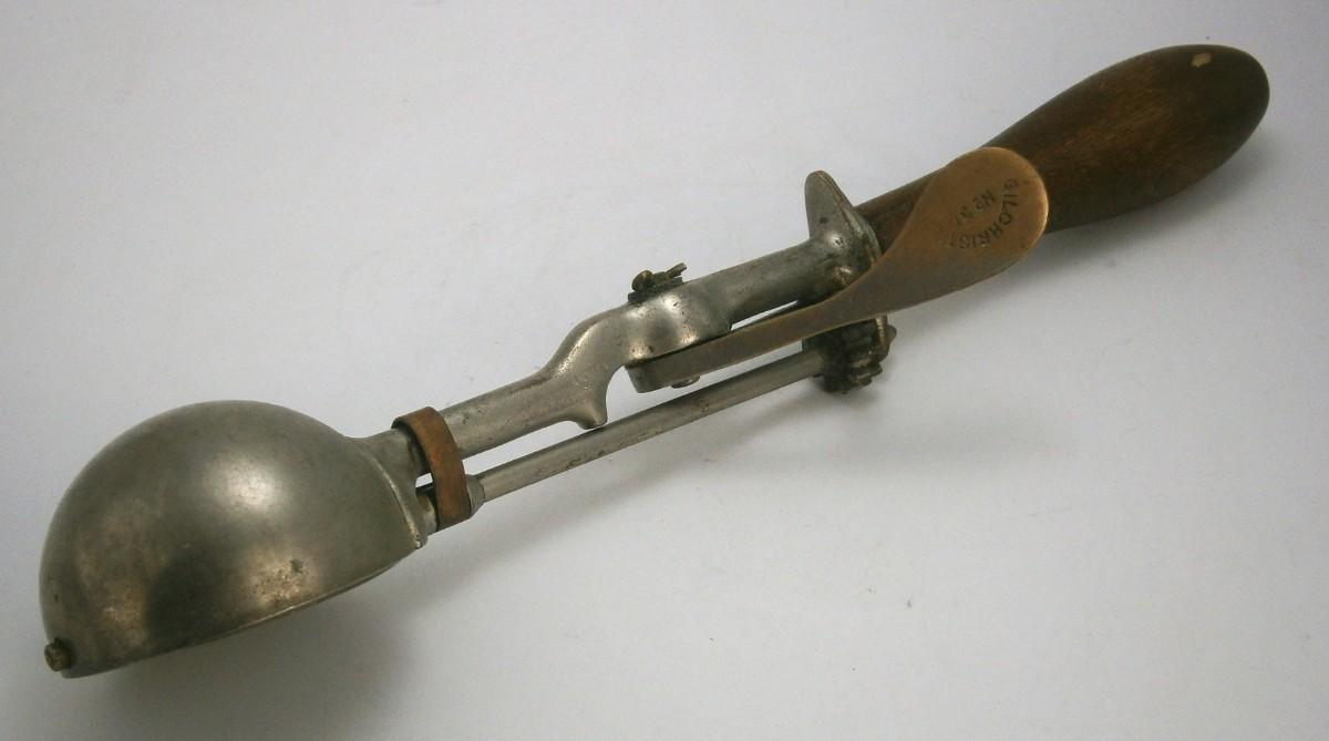 Gilchrist No. 31 Ice Cream Scoop from the early 1900's, 20 scoops to a quart, 10 3/4 in. long, nickel plated brass with wood handle, in good working order.
